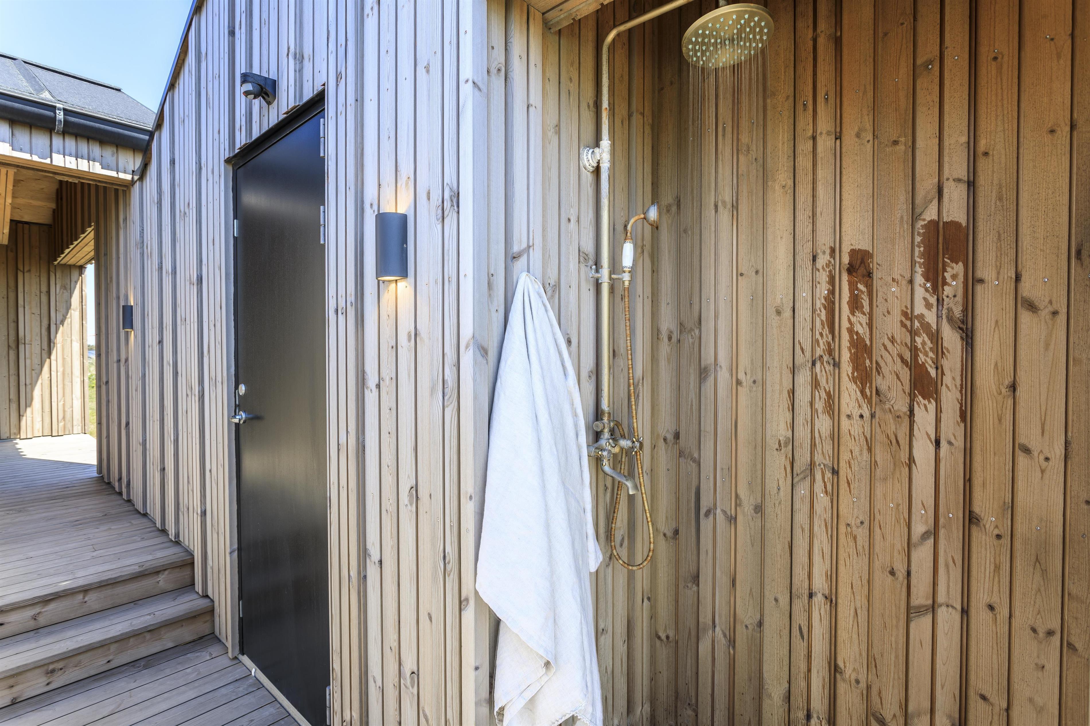 Das Haus bietet zwei schöne Terrassen, von denen eine von einer niedrigen Mauer umgeben ist, sodass Sie ungestört sonnenbaden oder ein köstliches Mahl genießen können. Die andere Terrasse ist nach Westen ausgerichtet und überdacht, ideal, um den Abend bei einem leckeren Grillessen mit dem Anblick des atemberaubendsten Sonnenuntergangs am Horizont ausklingen zu lassen. Am Haus finden Sie auch eine Außendusche, sodass Sie sich nach einem Strandbesuch von Sand und Salzwasser befreien können. Entlang der nördlichen Grundstücksgrenze gibt es einen kleinen Weg, der direkt zum Strand führt.