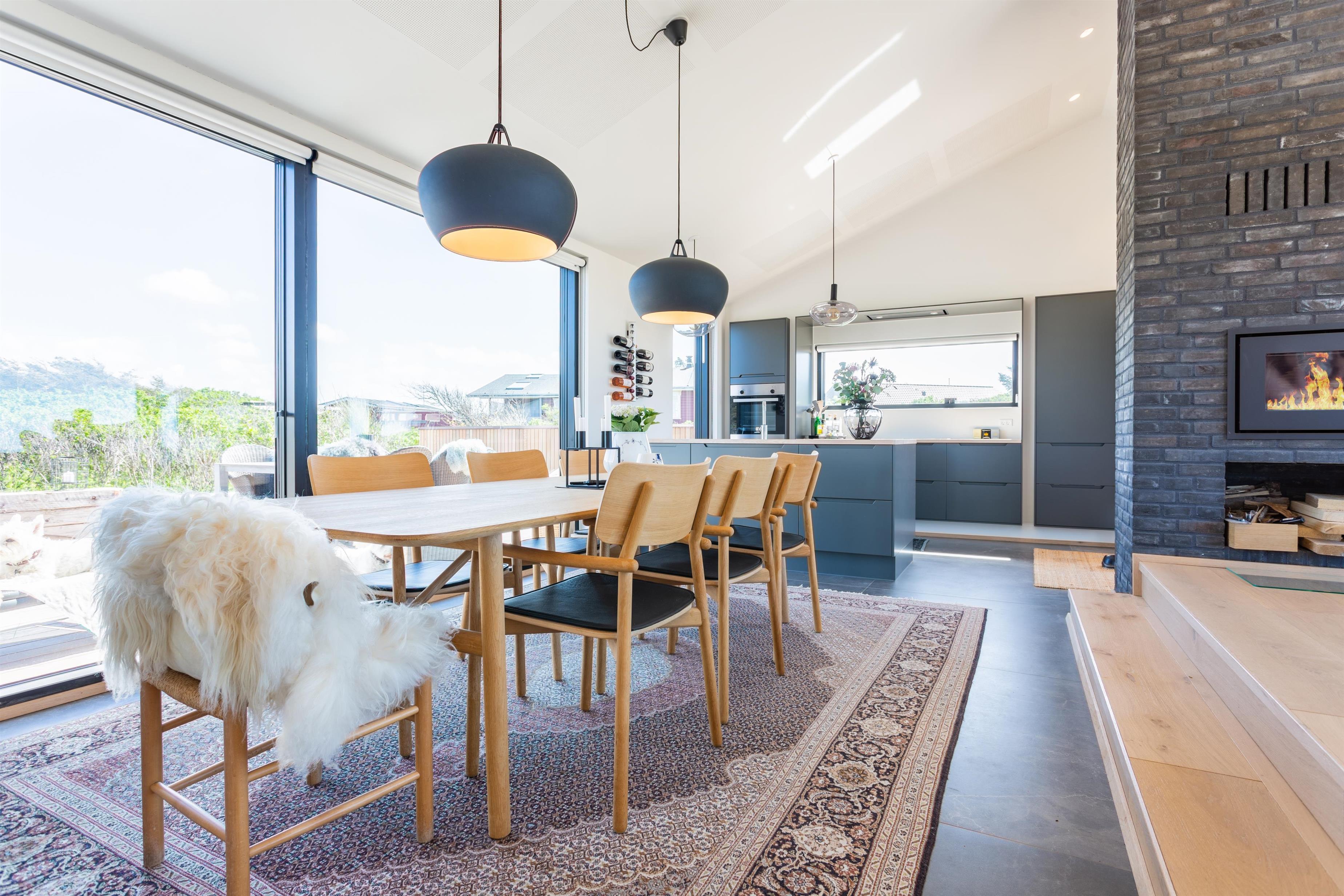 Das Haus besticht durch seine elegante Architektur und die besonders geschmackvolle Einrichtung. Auch der Komfort kommt nicht zu kurz, denn in allen drei Schlafzimmern erwarten euch bequeme Doppelbetten. Bereits beim Betreten des breiten Eingangsbereichs spürt ihr die durchdachten Details, die dieses Haus so einzigartig machen. Von hier aus habt ihr Zugang zu den drei Schlafzimmern sowie zwei stilvollen Badezimmern. Eine Treppe führt vom Eingangsbereich hinauf in das Herz des Hauses: den offenen Wohn- und Küchenbereich. Durch die großen Panoramafenster fällt überall reichlich Licht herein. Der hohe Aufenthaltsraum lädt dazu ein, gemeinsam Zeit zu verbringen – ob beim Kochen, beim Filmschauen auf dem Flachbildschirm oder beim gemütlichen Beisammensein am Kamin. Von hier aus habt ihr einen fantastischen Blick auf das idyllische Ferienhausgebiet und das dahinterliegende Meer. Eine kleine Hems ergänzt den Grundriss und schafft einen zusätzlichen gemütlichen Rückzugsort.
