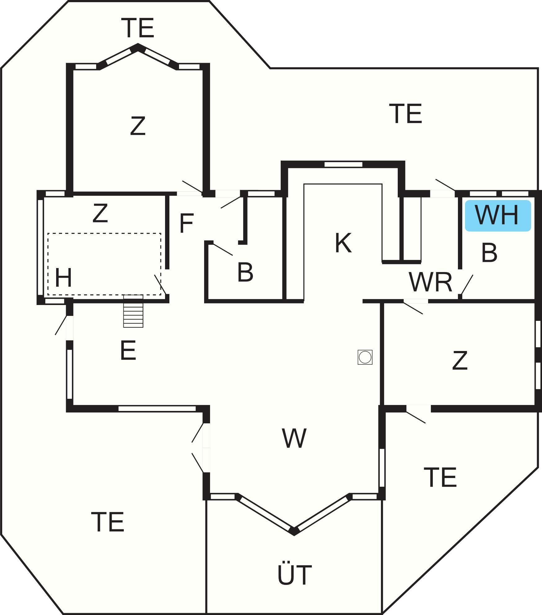 Off. Küche: E-Herd, Kühl-Gefrier-Kombi, Abzugsh., Kaffeem., Spülm., Waschm.