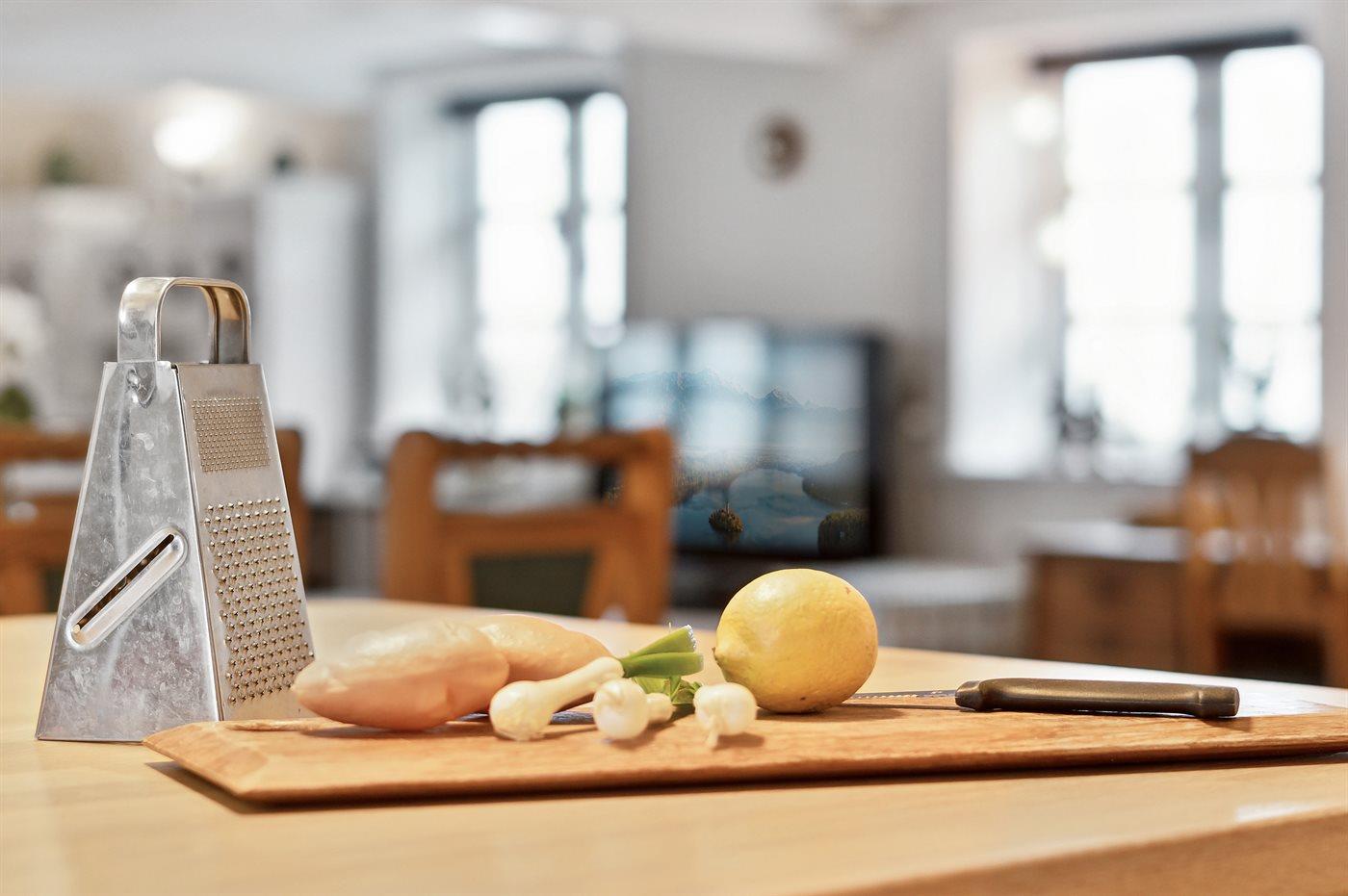 Die Küche ist mit Kühlschrank ausgestattet. Außerdem gibt es 4 Induktions-Kochzonen, Umluftofen, Mikrowelle sowie Geschirrspüler.