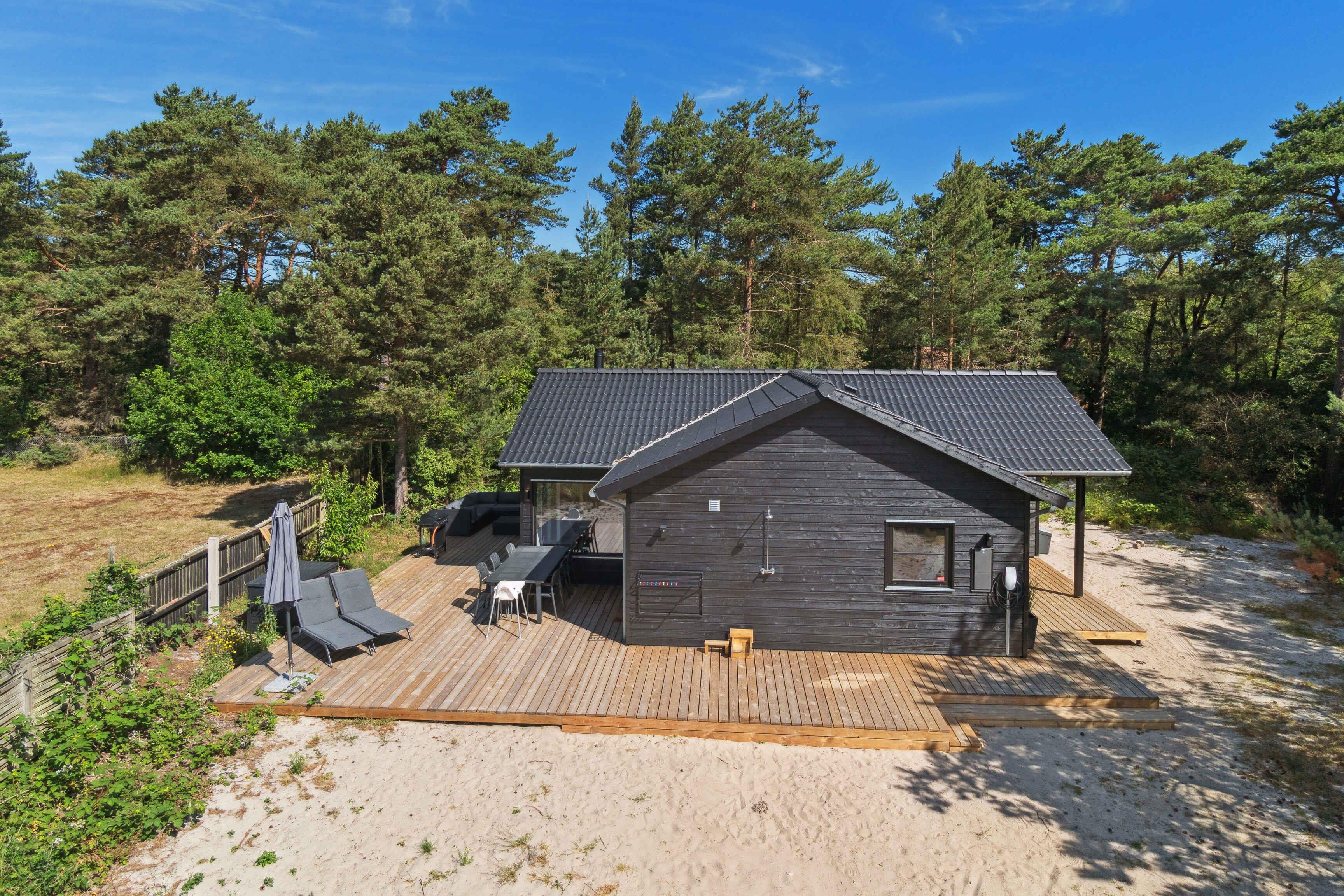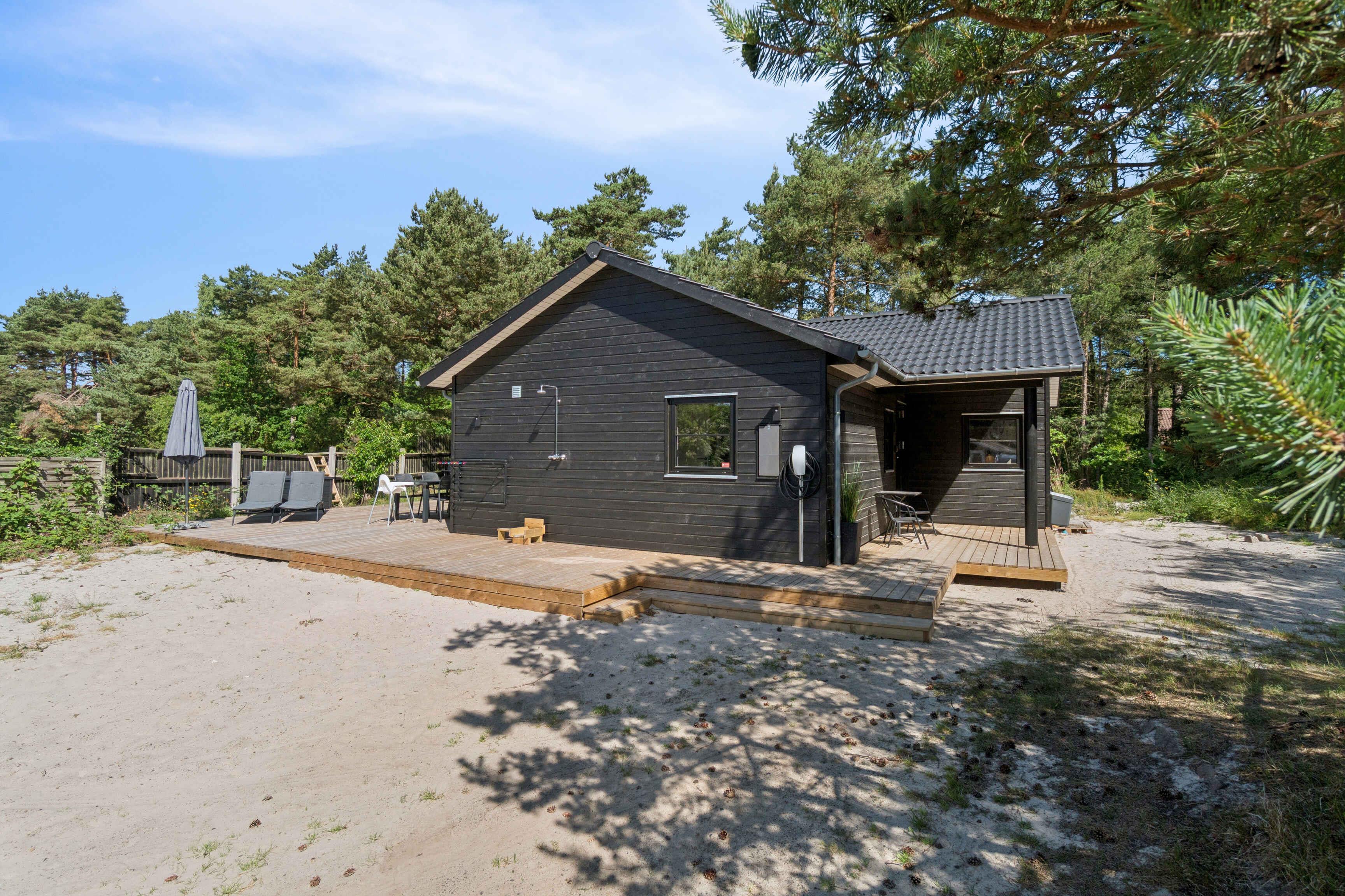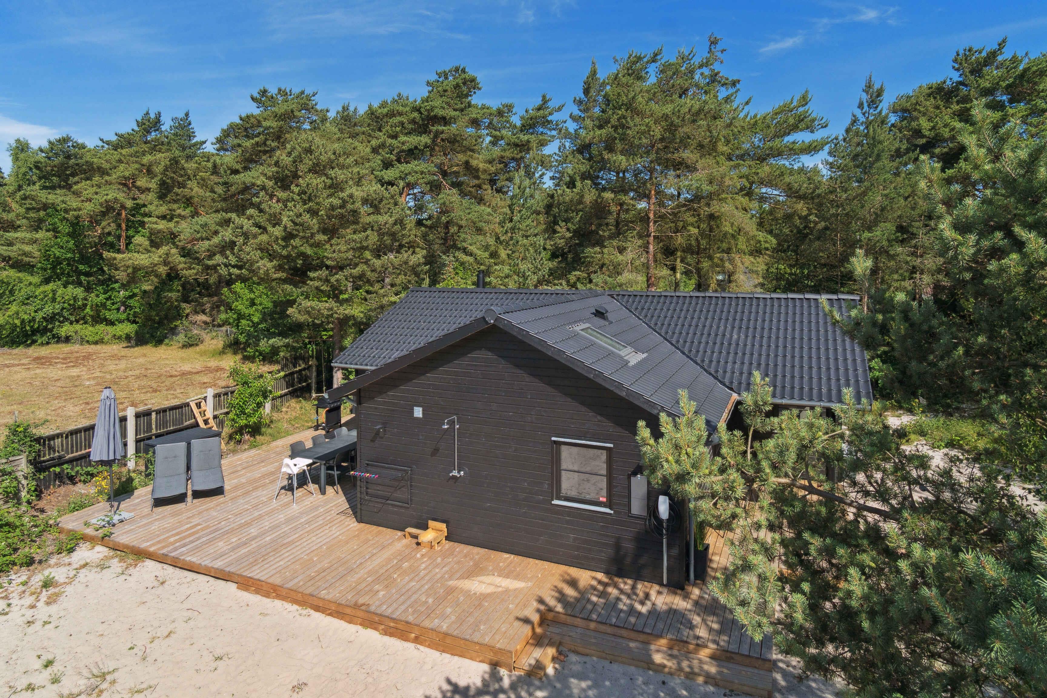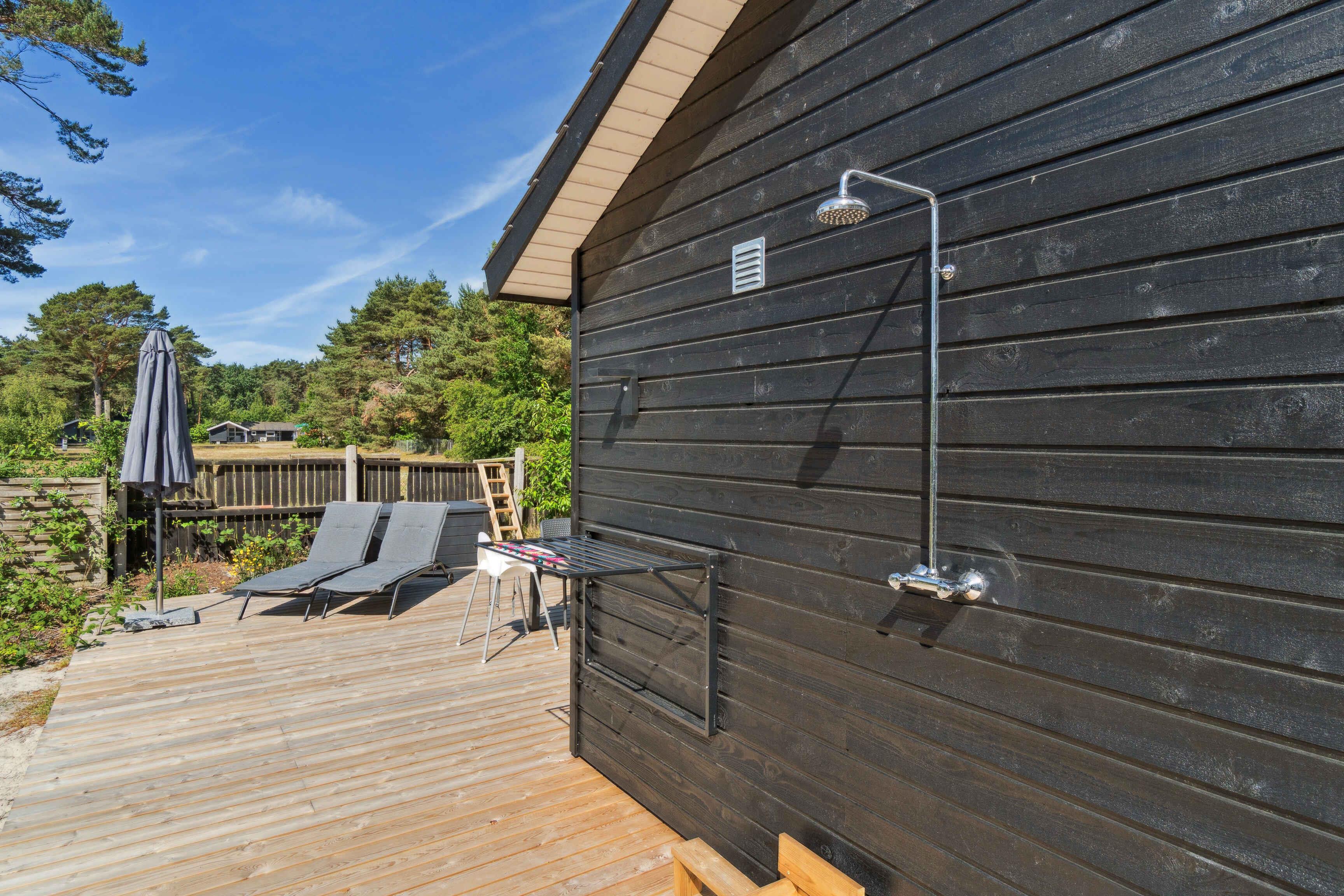 Modernes Ferienhaus nahe dem Strand von Nexø mit Holzofen, Terrasse und Außendusche für erholsame Urlaubstage.