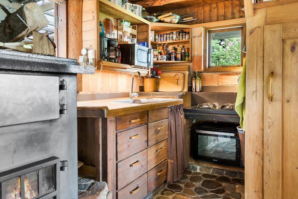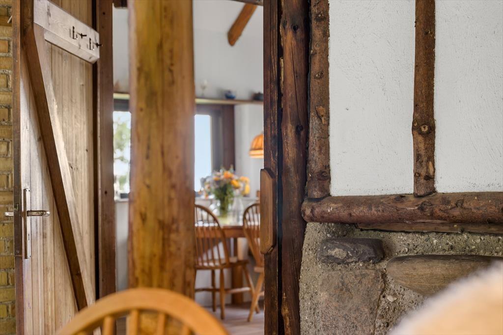 Der Wohn- und Aufenthaltsbereich befindet sich im "alten" Haus. Der Esstisch ist vor den Fenstern platziert, die dich und deine Lieben beim Essen und während geselliger Spieleabende mit einer traumhaften Aussicht auf das Meer verwöhnen. Wunderbar entspannen, in Ruhe lesen und ein kleines Nickerchen halten kannst du in der gemütlichen Sitzecke, in der eine komfortable Sitzbank und Korbstühle bereit stehen. Unterhaltung und Abwechslung verspricht bei Bedarf der Fernseher. An den Raum schließt die alte, stimmungsvolle Küche, die bis heute genutzt wird und unter anderem einen Herd, einen Backofen und Arbeitsfläche bietet. Eine Treppe führt dich vom Wohn- und Essbereich hinauf in den ersten Stock, in dem drei Betten zur Verfügung stehen, die wunderbar mit dem Haus und dessen Einrichtung harmonieren. Ein Schreibtisch steht im Obergeschoss ebenfalls zur Verfügung.