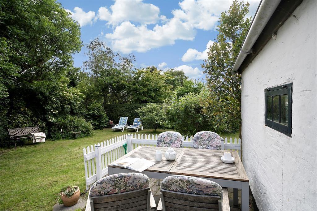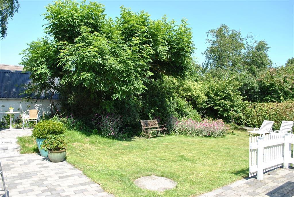Gemütlicher Garten, die mit einer Zäune zur Straße umschlossen wird; hervorragende Möglichkeiten, Sonne und Schutz finden - und Platz für Kinder zum Spielen.