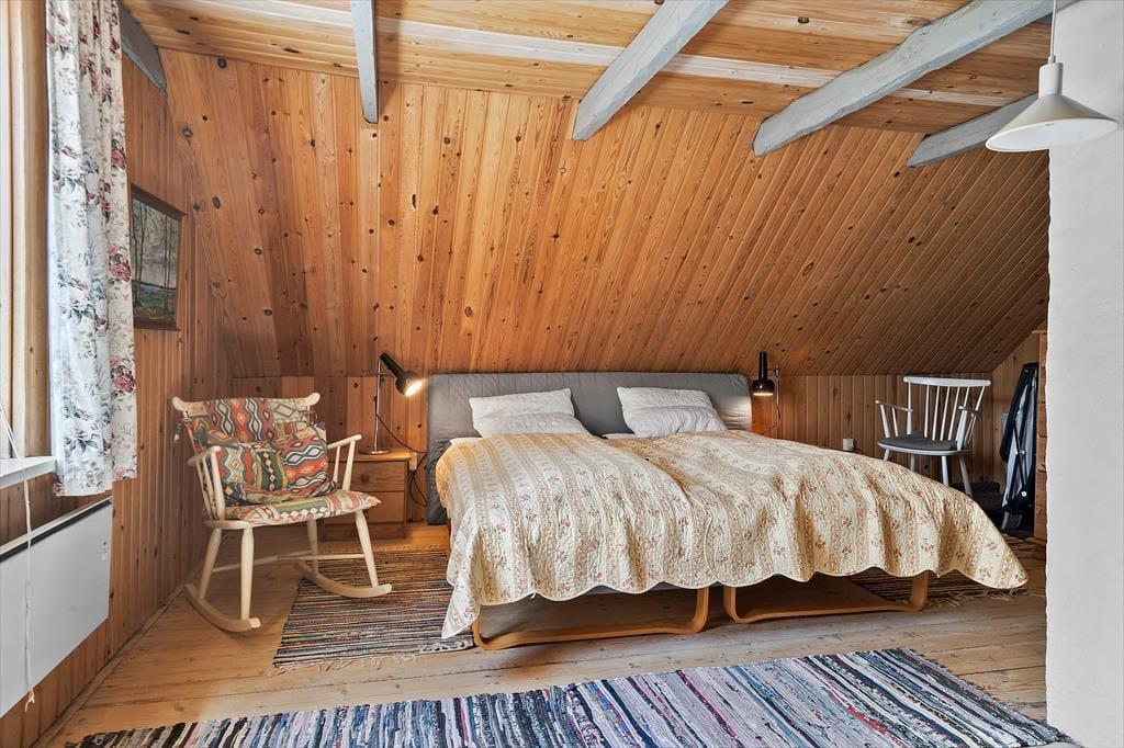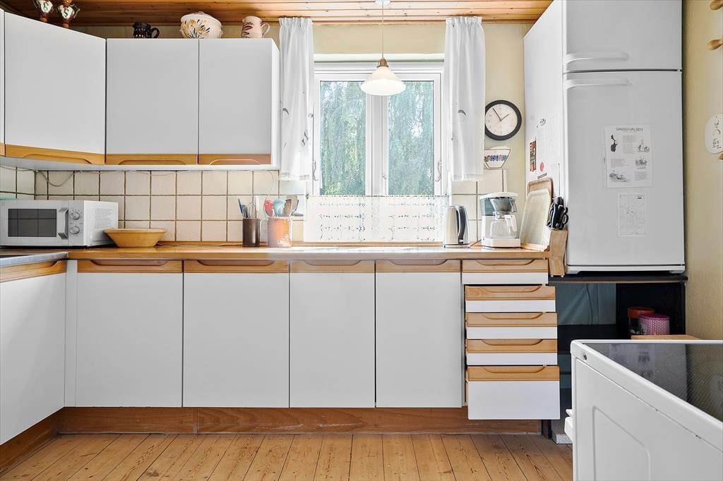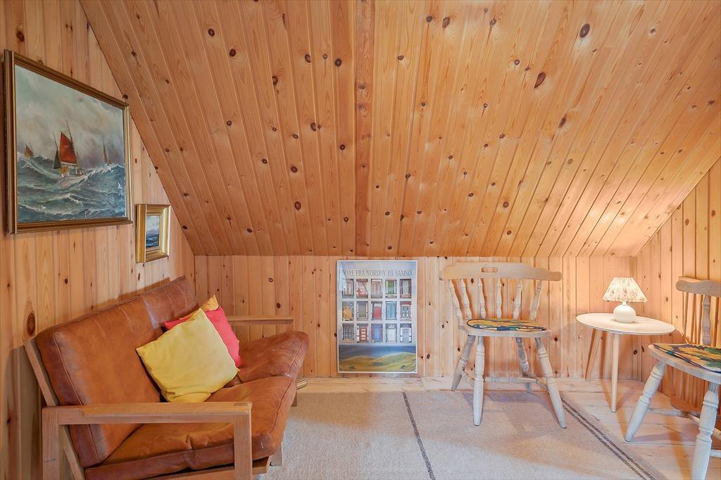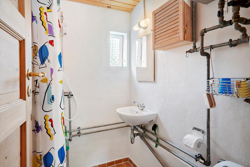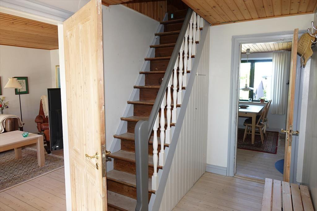 Wohnzimmer mit guten Licht aus dem Westen; von der großen Esszimmer mit Kamin, gibt es Glas-Schiebetür zur Terrasse. Es gibt schöne Parkettböden in beiden Wohnräume und gut ausgestattete Küche. Kleiner Flur mit Waschmaschine. Auf der 1. Etage Zimmer mit Doppelbett und großem Zimmer mit Doppelbett und Schlafsofa. Bad auf beiden Etagen, beide mit Dusche.