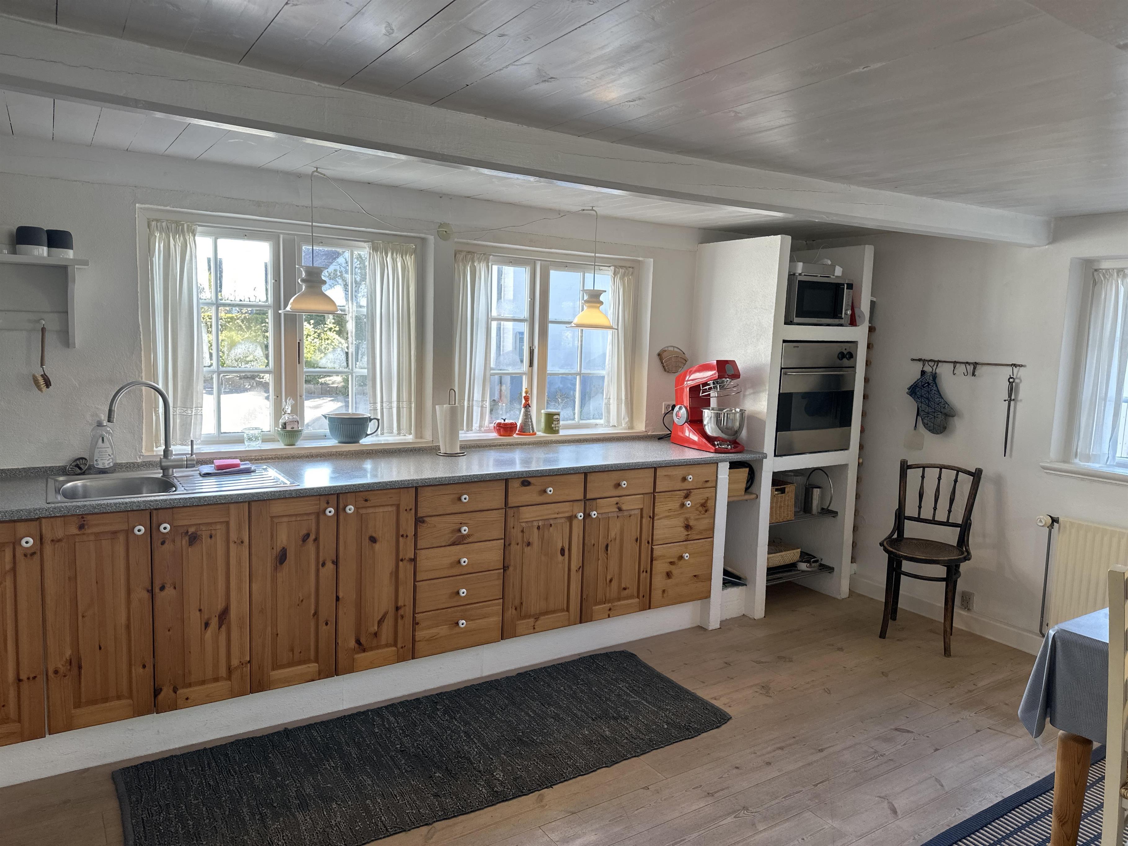 Wenn Sie das Haus betreten, werden Sie von einem schönen, hellen Küchenbereich empfangen, in dem Sie gemeinsam kochen, gemütlich essen und sich vor dem Holzofen in der einladenden Sofaecke entspannen können. Hier können Sie einen ruhigen Morgen mit einer Tasse Kaffee in der Hand oder einen entspannten Abend nach einem erlebnisreichen Tag auf der Insel genießen.