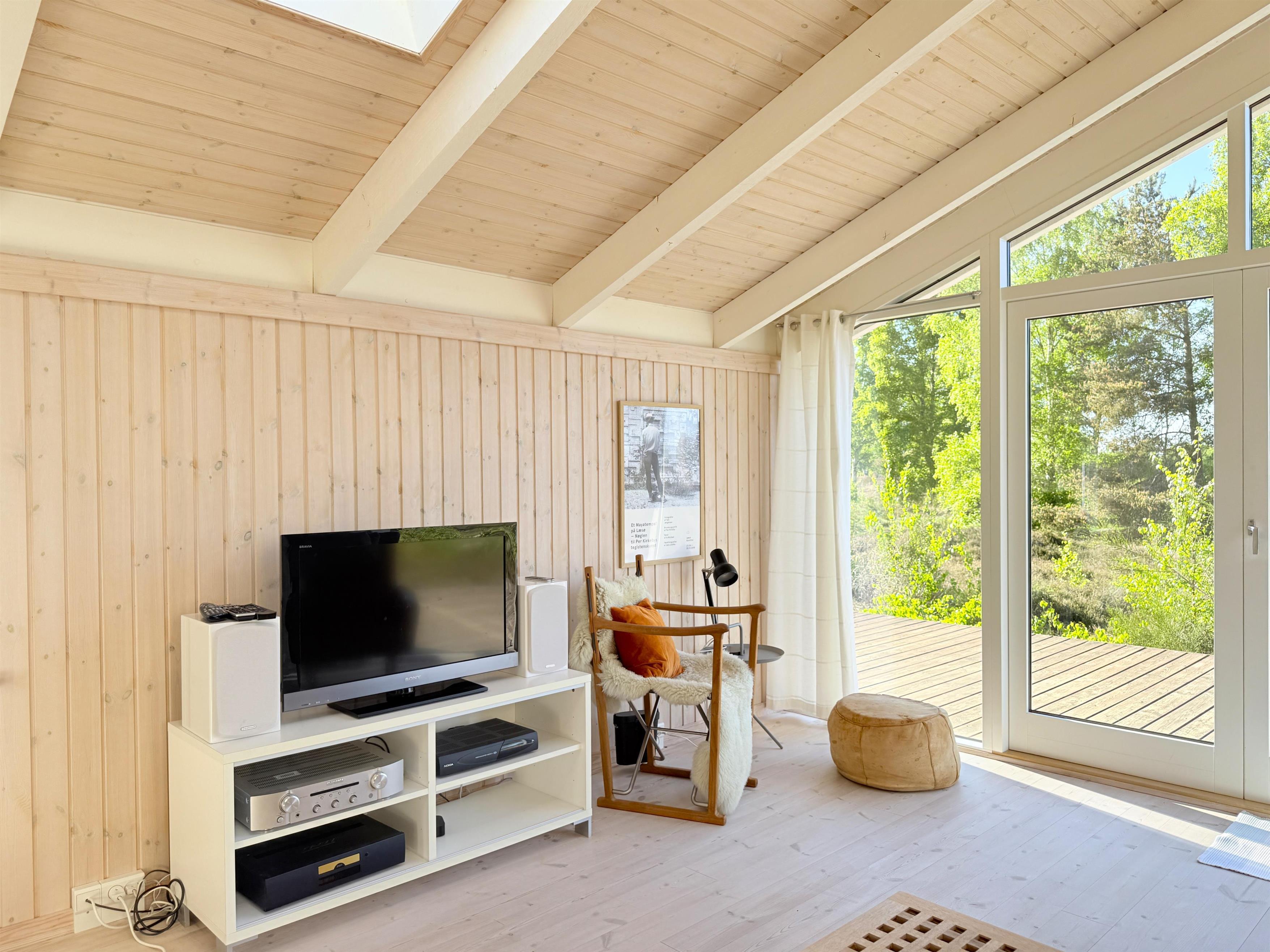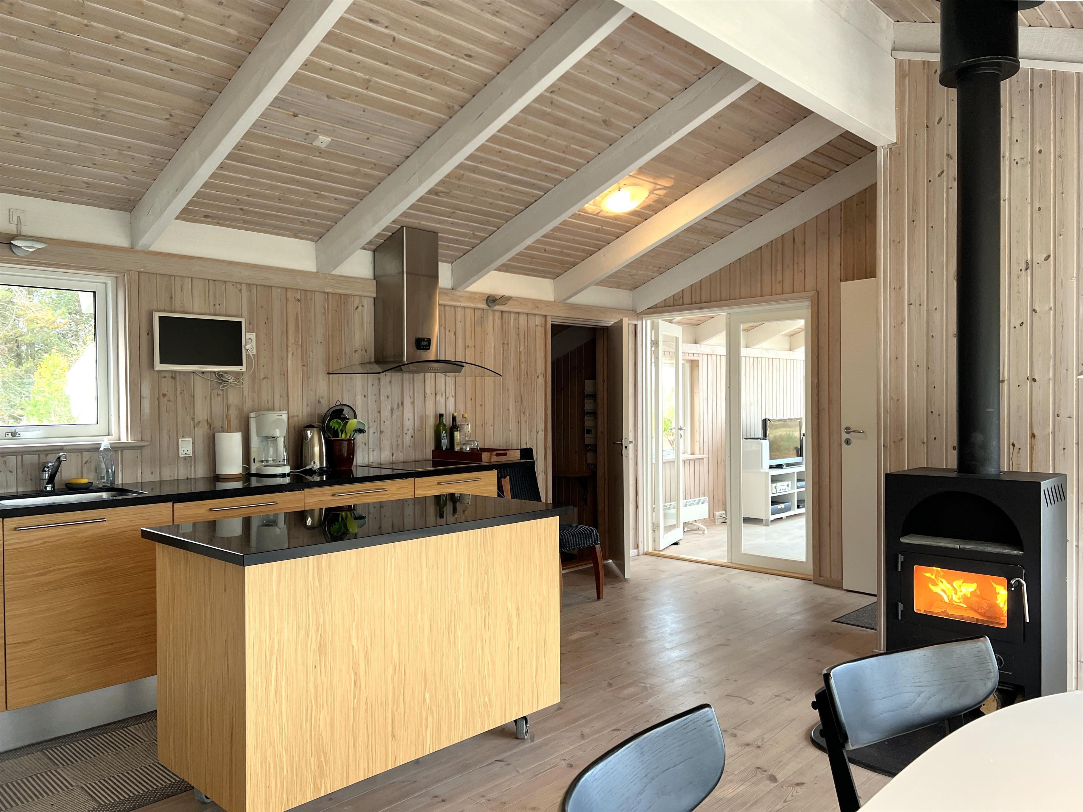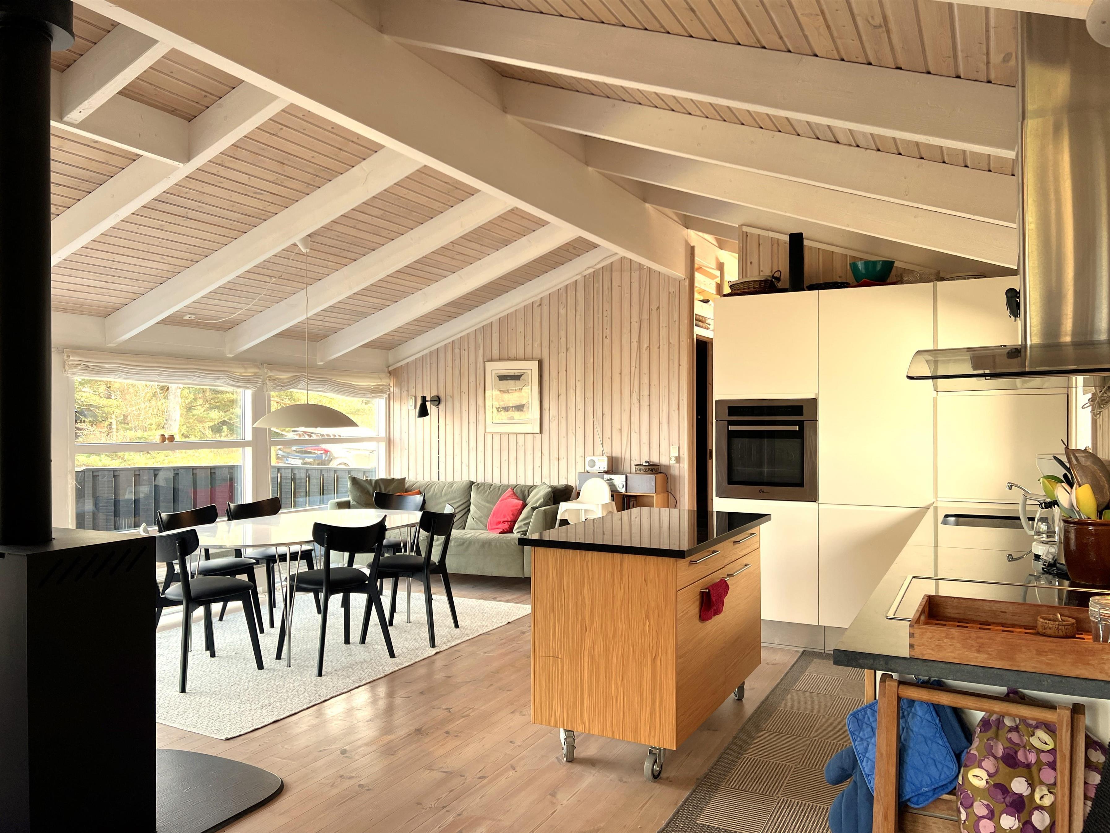 Im Haus selbst befindet sich eine neue, gut ausgestattete Küche in offener Verbindung mit Essbereich und Holzofen. Es wurde ein neueres, schönes, geräumiges Wohnzimmer mit großen, schönen Fensterflächen eingerichtet, von dem aus man den Blick auf die Heide und das Meer wirklich genießen kann.