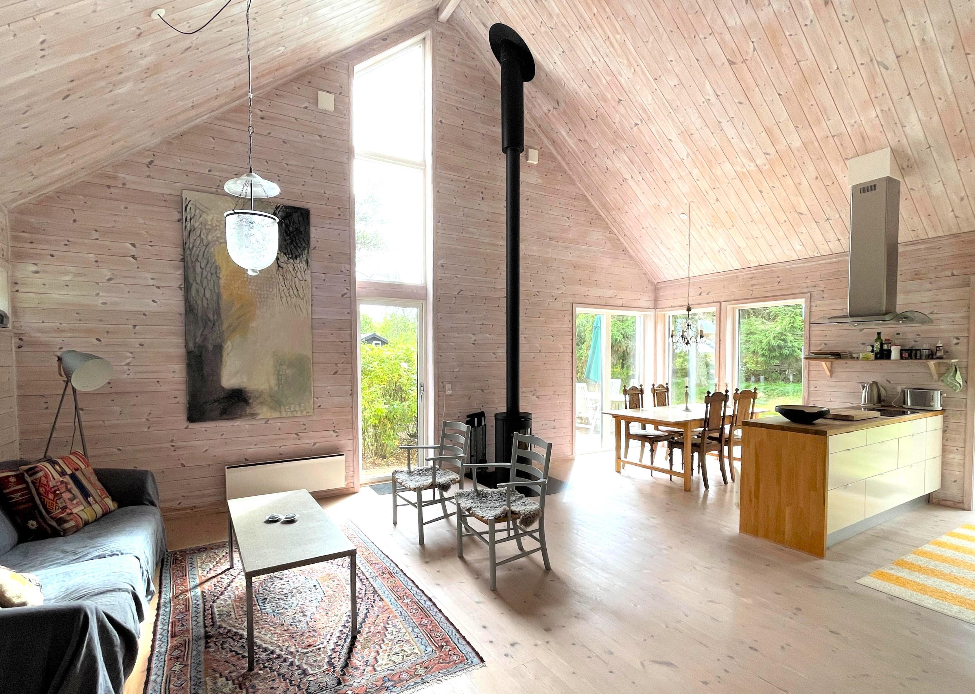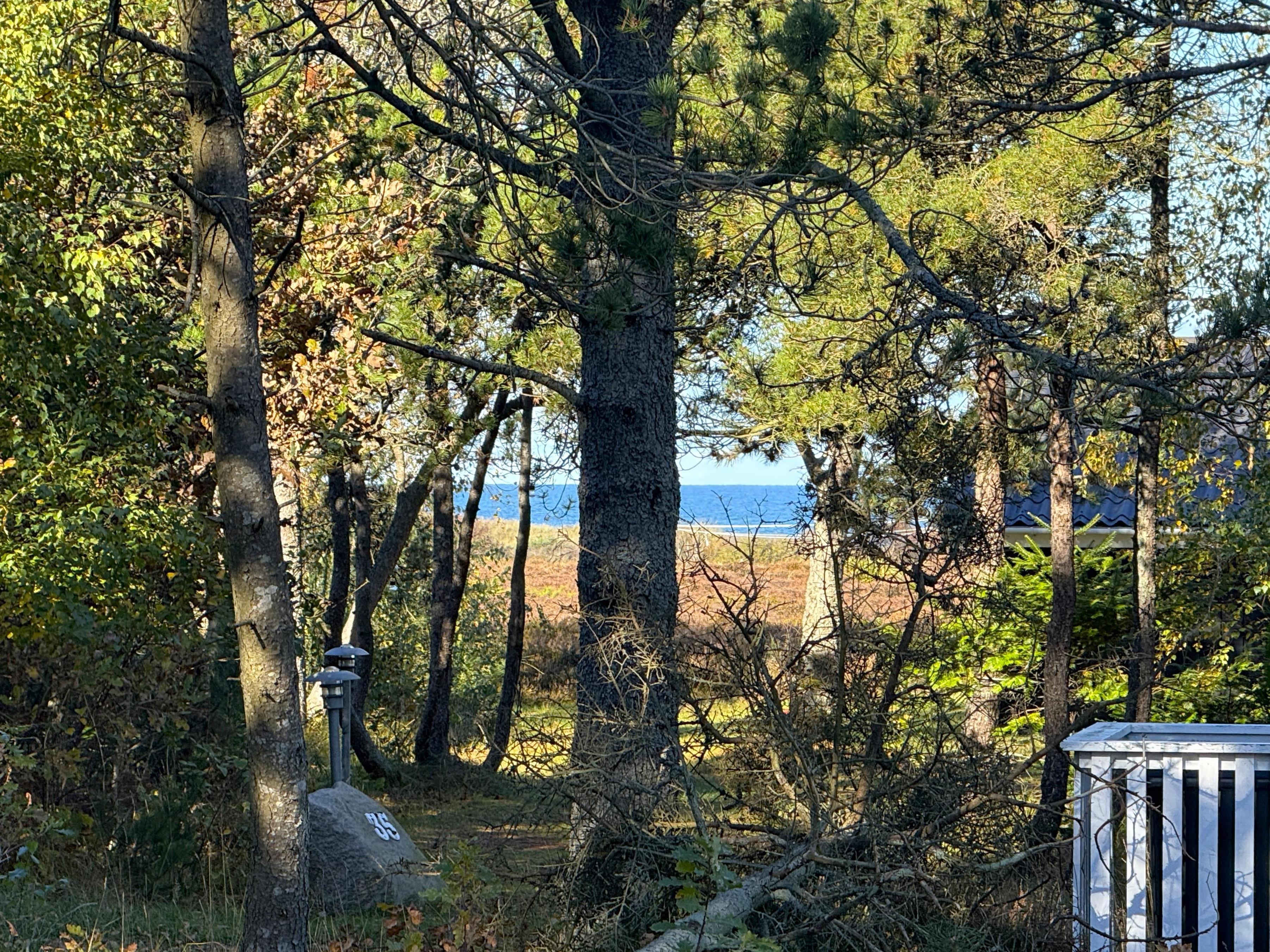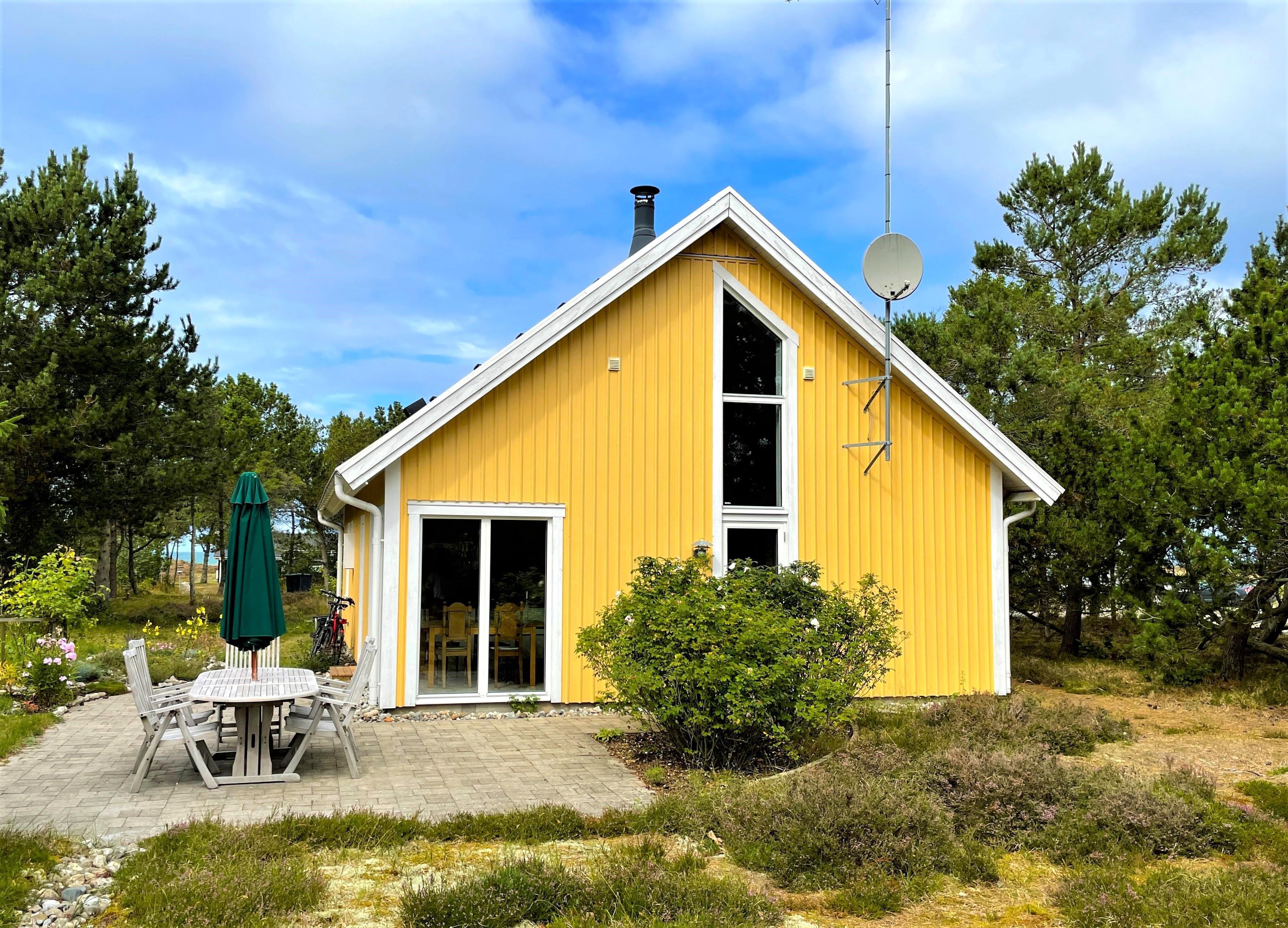 Seeblick. Ein wirklich schönes Ferienhaus, sowohl was die Inneneinrichtung als auch die schöne Lage direkt an der wunderschönen Nordküste betrifft. Große, helle und perfekt ausgestattete Wohnküche mit gewölbter Decke. Schönes Wohnzimmer mit bequemen Möbeln und Holzofen. Von der Küche und dem Wohnzimmer gibt es Ausgänge zum Garten und zu einer schönen Terrasse mit Gartenmöbeln. Drei Schlafzimmer, eines mit einem Doppelbett und zwei mit einem Einzelbett (eines ca. 90 cm breit und eines ca. 120 cm breit). Schönes Badezimmer mit Dusche. 1. Etage mit TV-Raum und 1 möglichen Zustellbett. Balkon mit Meerblick auf die blauen Wellen des Kattegats und die wunderschöne Heide. 300 m zum Strand und 50 m zum Golfplatz der Insel.