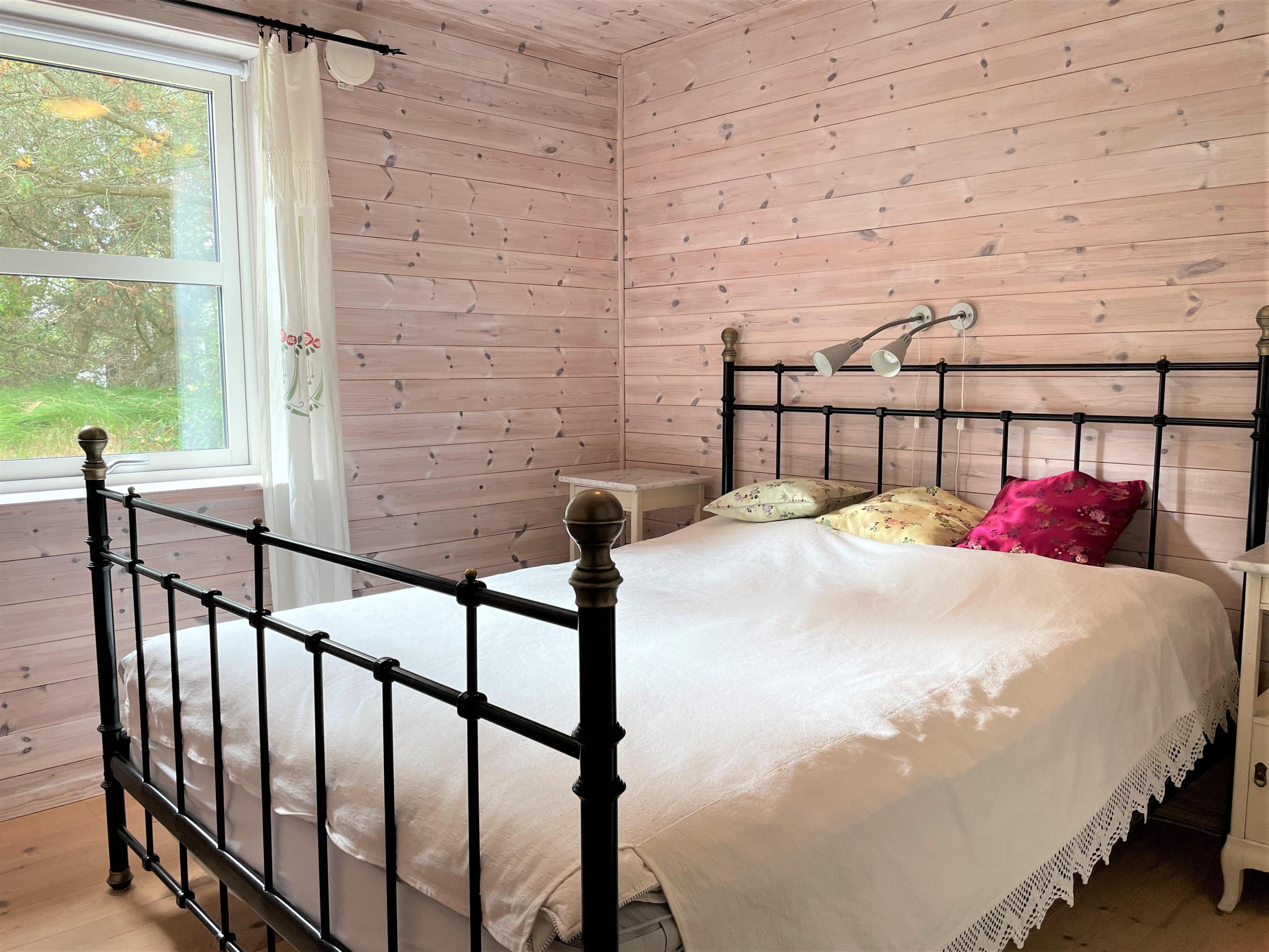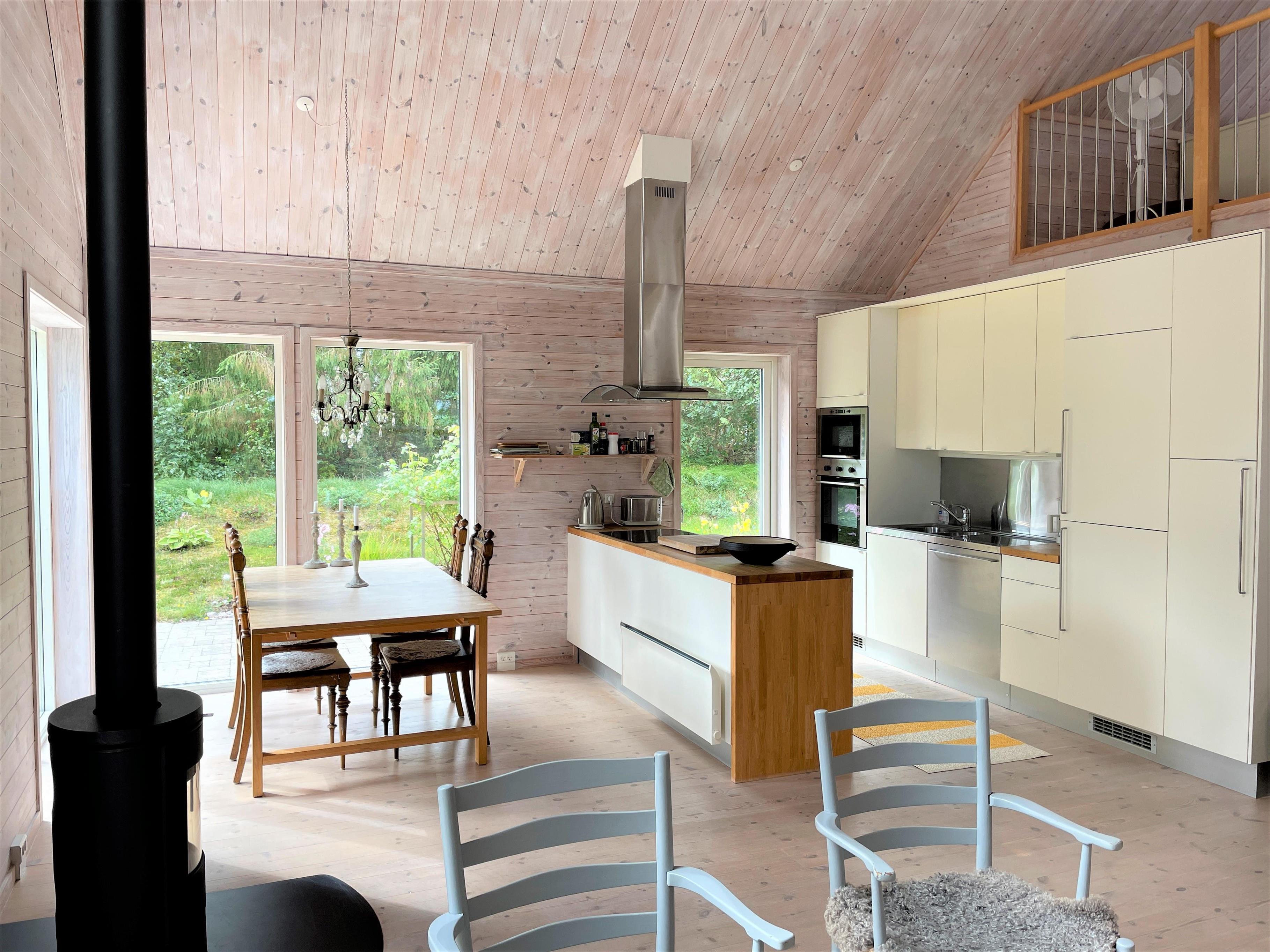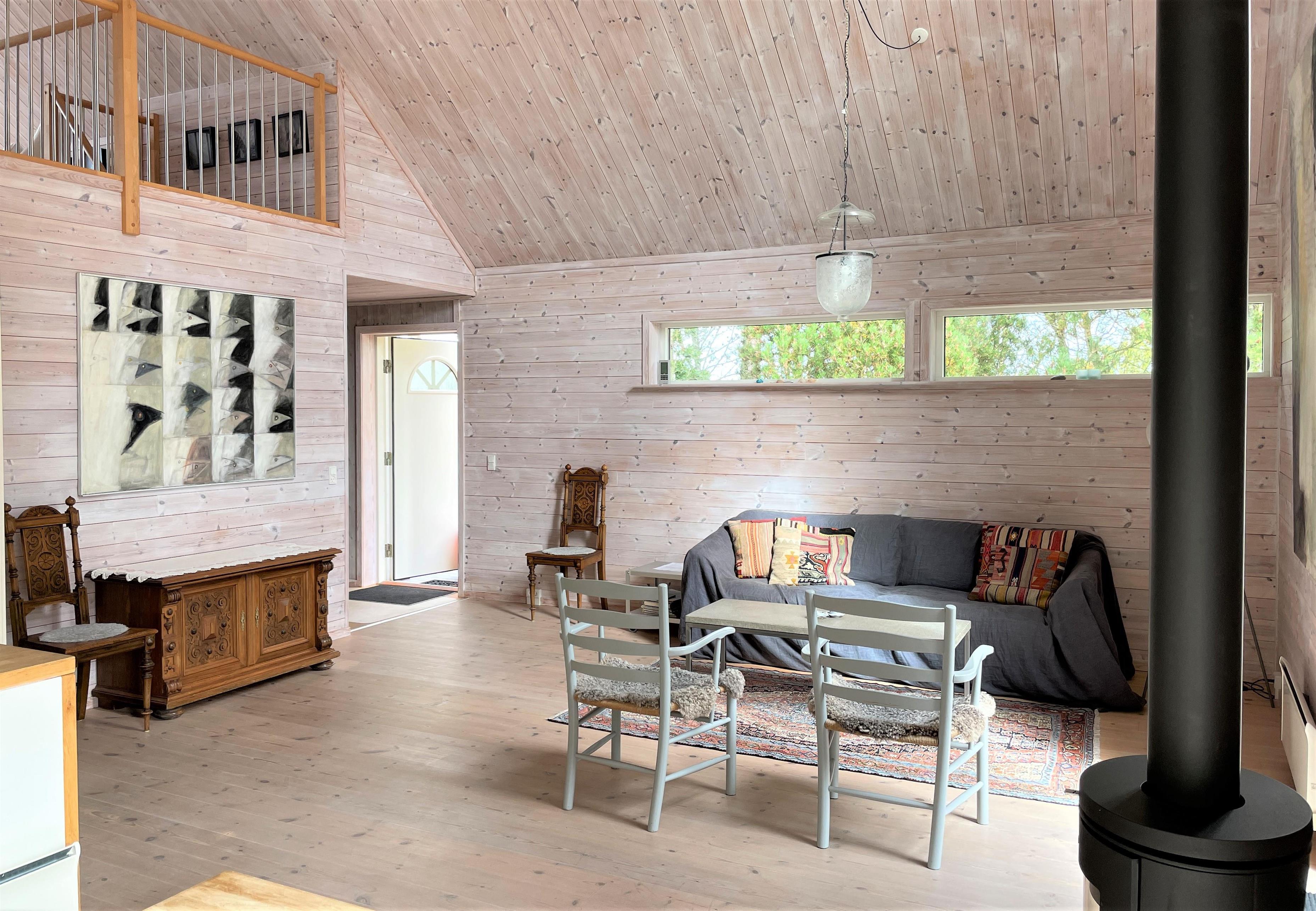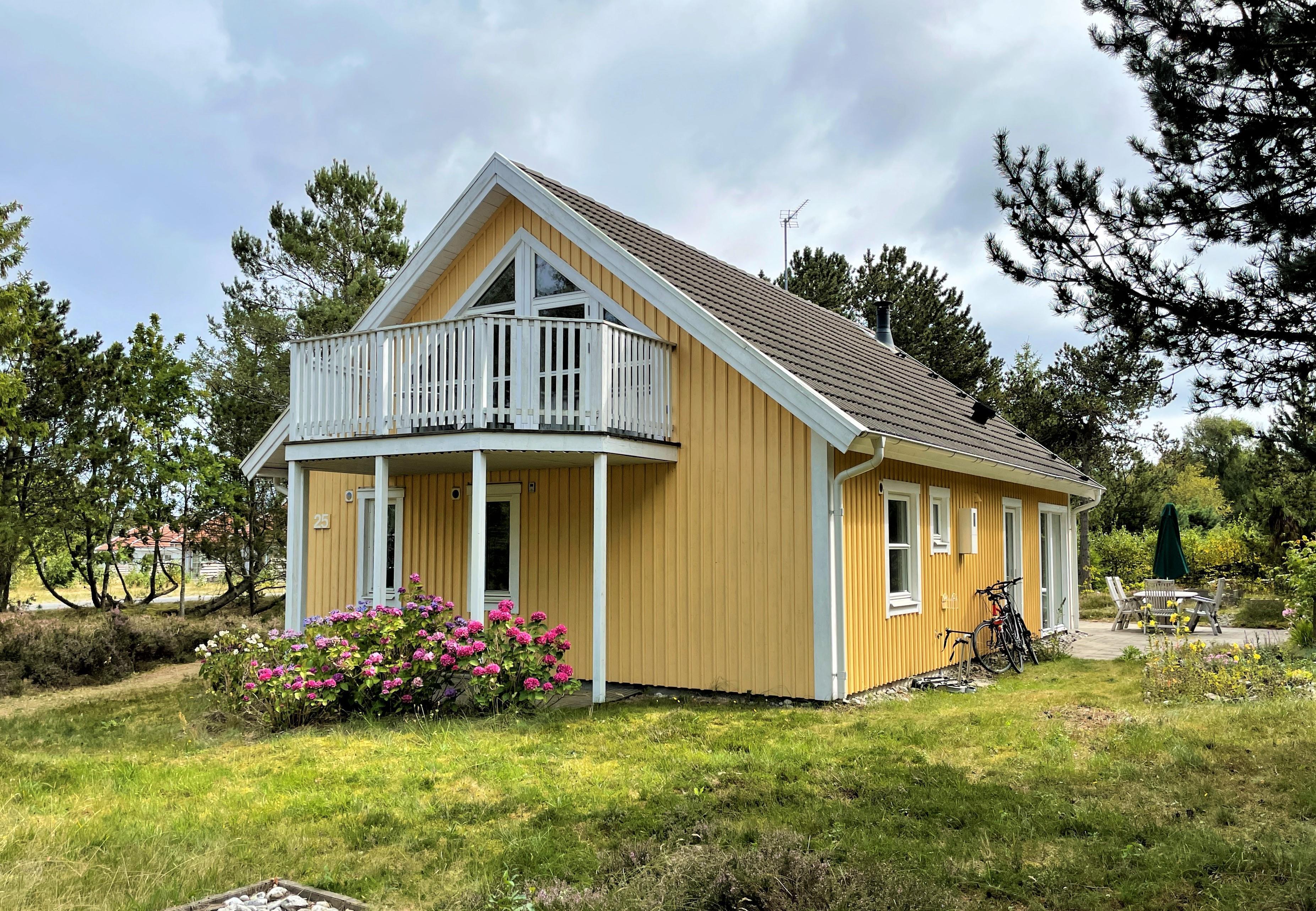 Seeblick. Ein wirklich schönes Ferienhaus, sowohl was die Inneneinrichtung als auch die schöne Lage direkt an der wunderschönen Nordküste betrifft. Große, helle und perfekt ausgestattete Wohnküche mit gewölbter Decke. Schönes Wohnzimmer mit bequemen Möbeln und Holzofen. Von der Küche und dem Wohnzimmer gibt es Ausgänge zum Garten und zu einer schönen Terrasse mit Gartenmöbeln. Drei Schlafzimmer, eines mit einem Doppelbett und zwei mit einem Einzelbett (eines ca. 90 cm breit und eines ca. 120 cm breit). Schönes Badezimmer mit Dusche. 1. Etage mit TV-Raum und 1 möglichen Zustellbett. Balkon mit Meerblick auf die blauen Wellen des Kattegats und die wunderschöne Heide. 300 m zum Strand und 50 m zum Golfplatz der Insel.