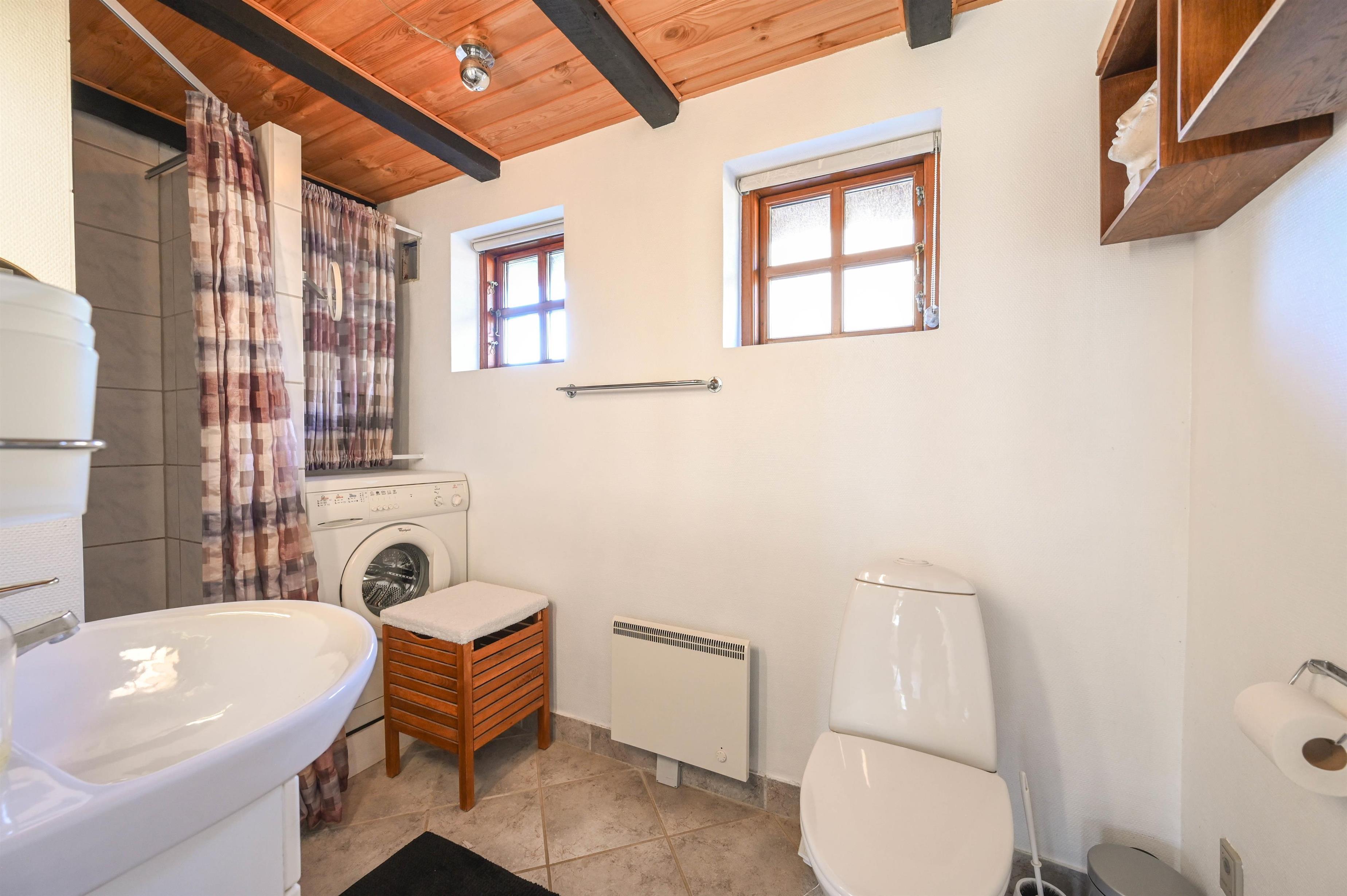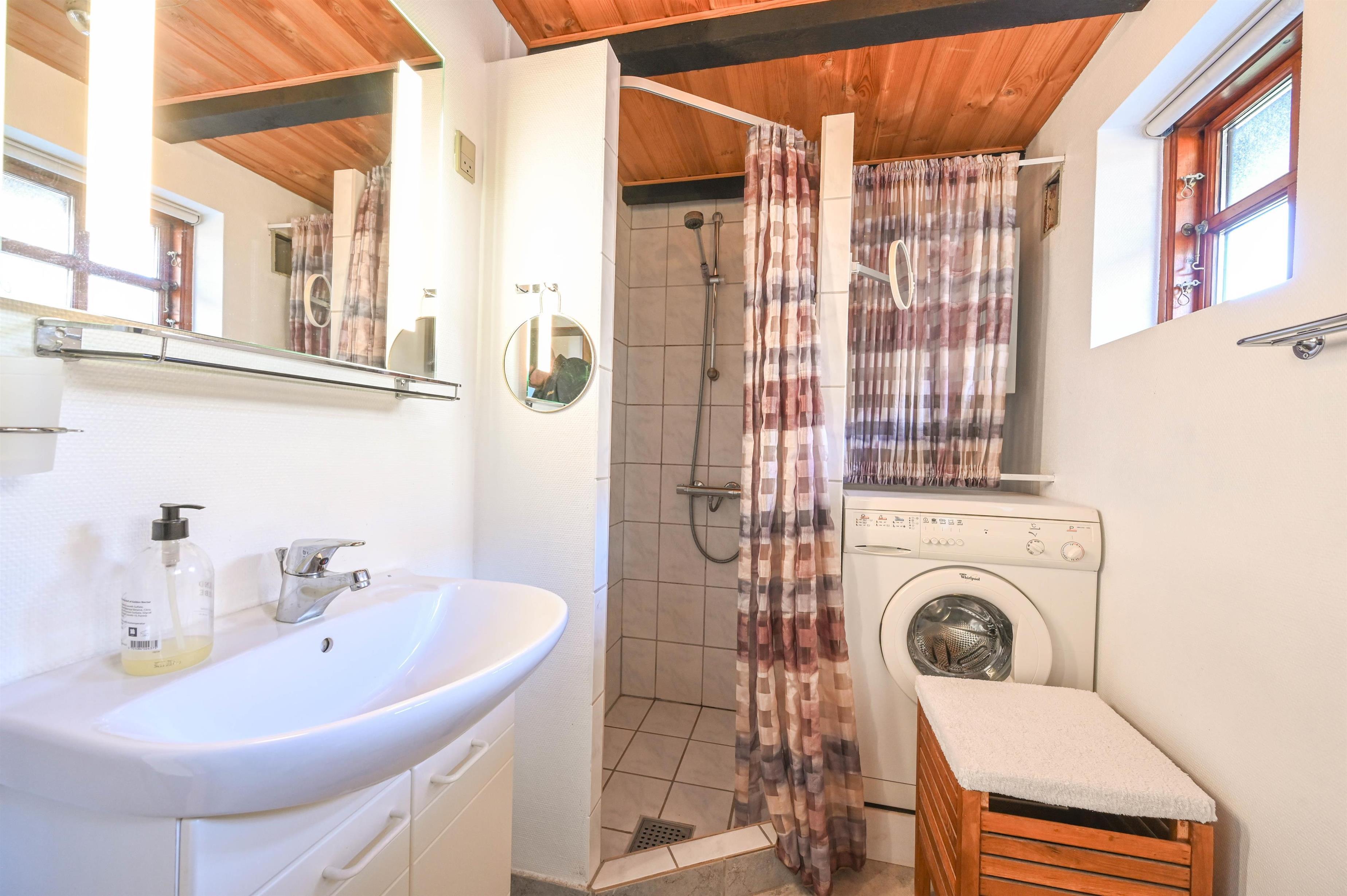 Die Küche ist funktional und gemütlich mit einem Essbereich und einer Treppe zum Obergeschoss – und aus dem Küchenfenster habt ihr einen schönen Blick über den Fjord, während ihr euren Morgenkaffee zubereitet. Das Wohnzimmer ist lichtdurchflutet und komfortabel eingerichtet mit bequemen Möbeln, einem Kaminofen für kühle Abende, Fernseher und direktem Zugang zur Terrasse, auf der ihr die Sonne windgeschützt genießen könnt.