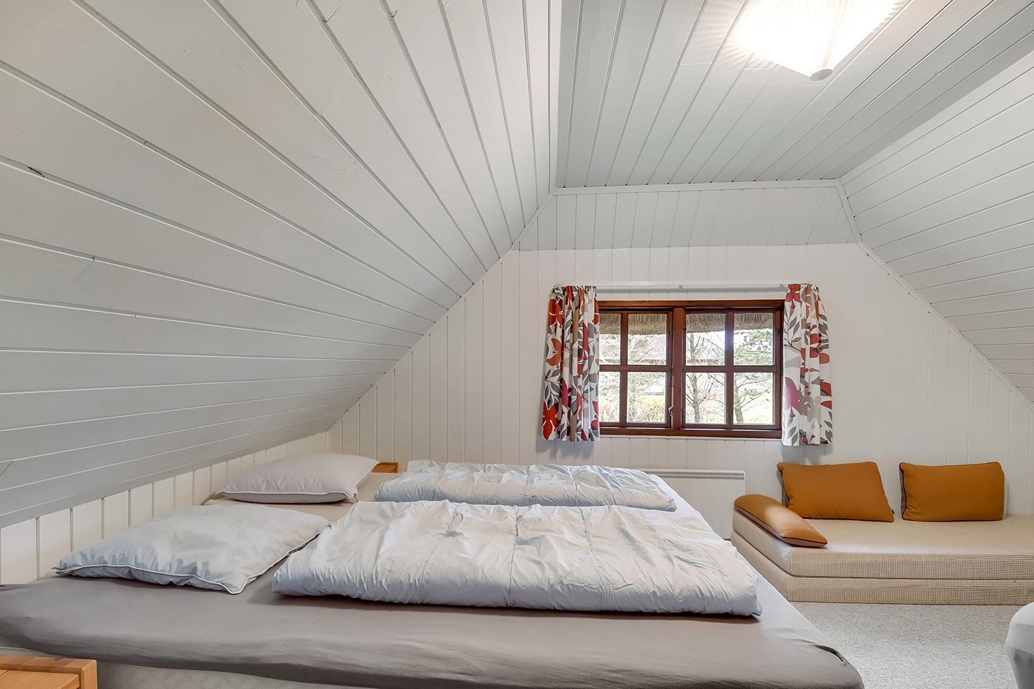 Im Obergeschoss befinden sich zwei gemütliche Schlafzimmer, beide mit bequemen Doppelbetten. Von einem der Zimmer aus genießt ihr einen ganz besonderen Ausblick über die Landschaft und den Fjord – eine wunderbare Art, den Tag zu beginnen.