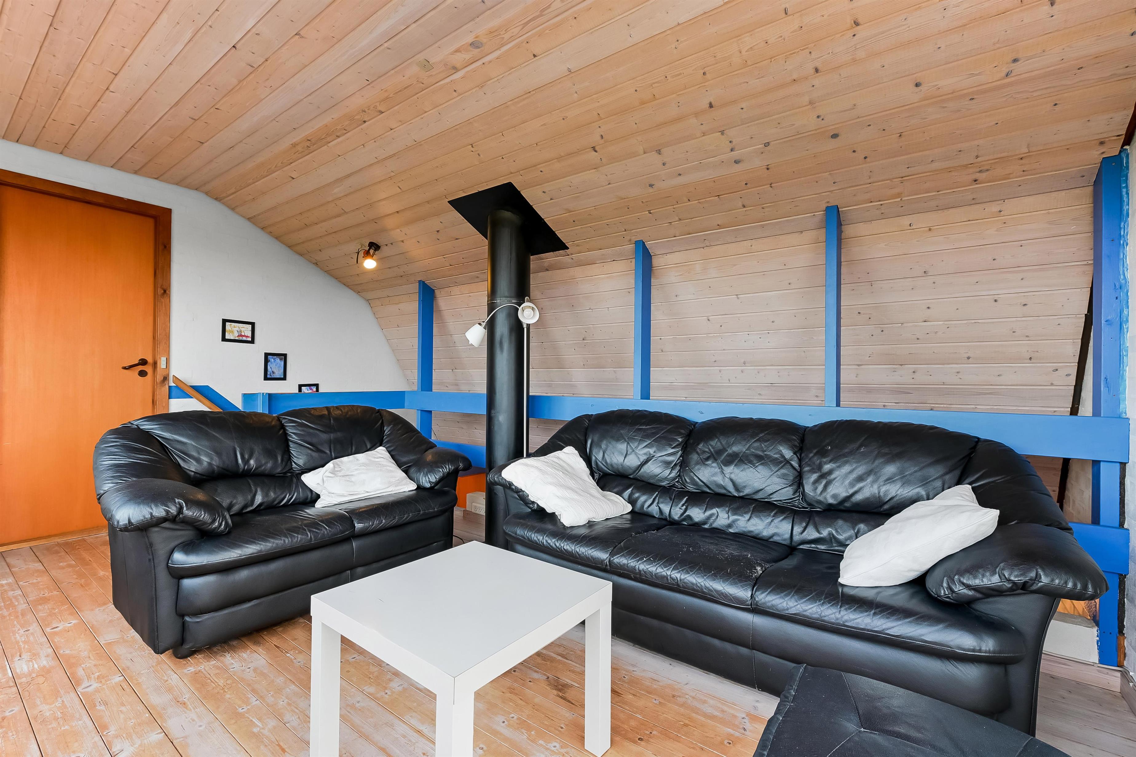 Etage: Wohnzimmer mit Balkon, Aufenthaltsraum mit Sofaecke und Fernseher sowie Schlafzimmer mit Doppelbett
