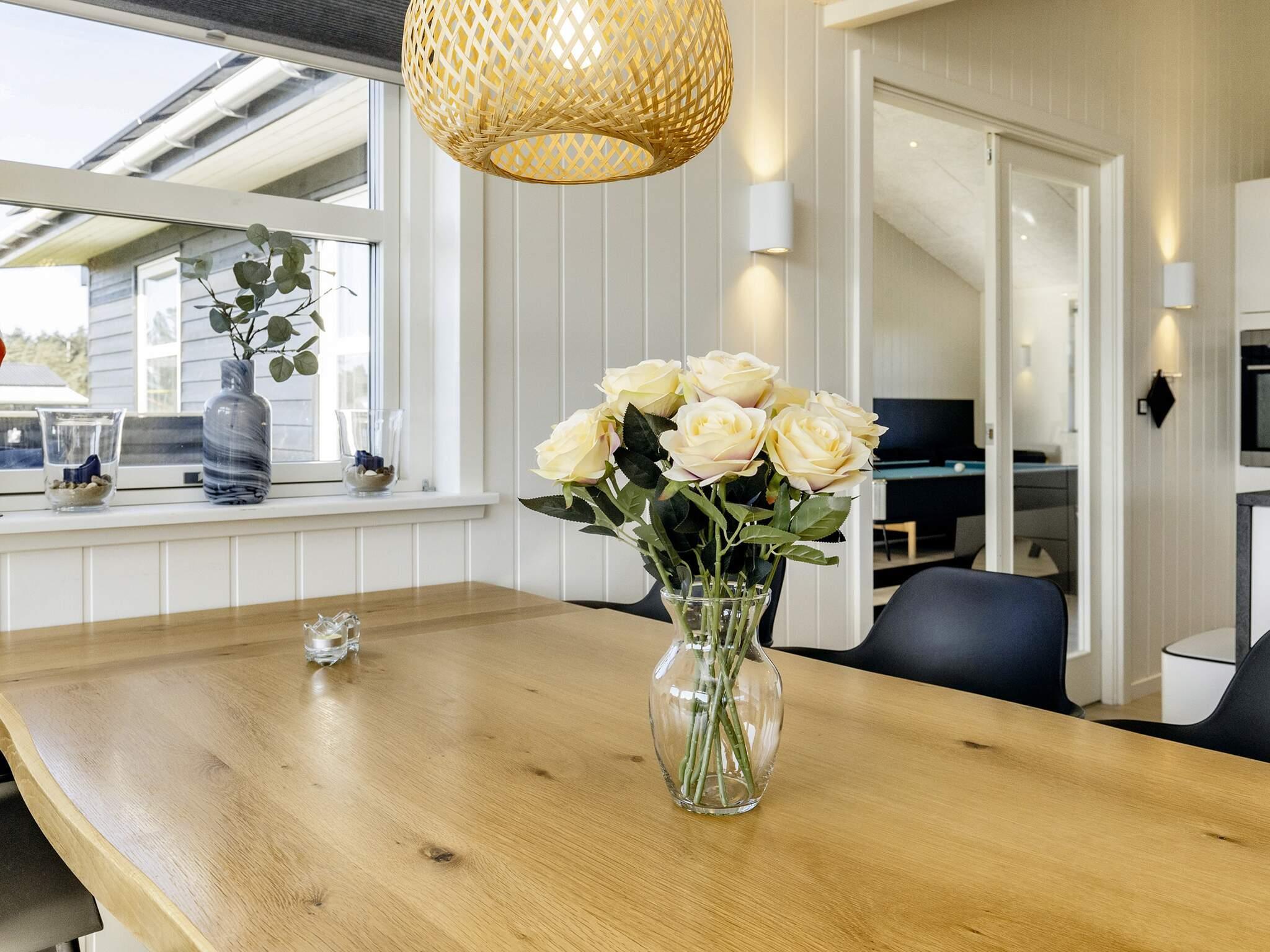 Das Ferienhaus ist modern eingerichtet und bietet einen offenen Küchen-/Wohnbereich, ausgestattet mit u.a. Geschirrspüler, Mikrowelle, Gefrierschrank und Herd. Der Wohnbereich ist geschmackvoll und bietet ein helles Ambiente sowie TV mit deutschen Sendern zur Auswahl und Holzofen für kühlere Abende.