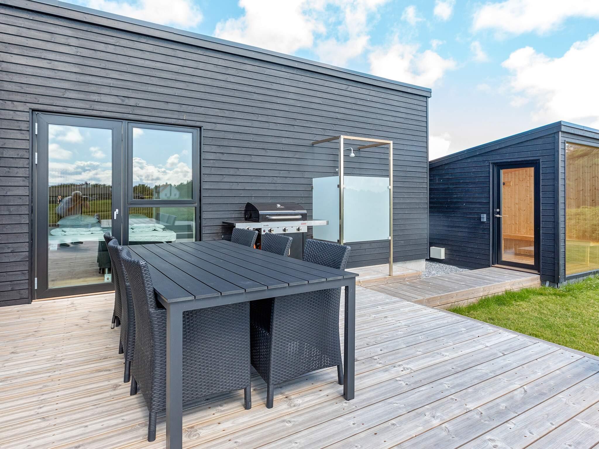 Außerdem bietet das Haus einen Carport mit Elektrostecker zum Aufladen eines Elektroautos und ca. 80 m2 Terrasse mit Außendusche, Badezuber und Außensauna. Die praktische Außendusche steht ab Kalenderwoche 14 bis 43 bereit.