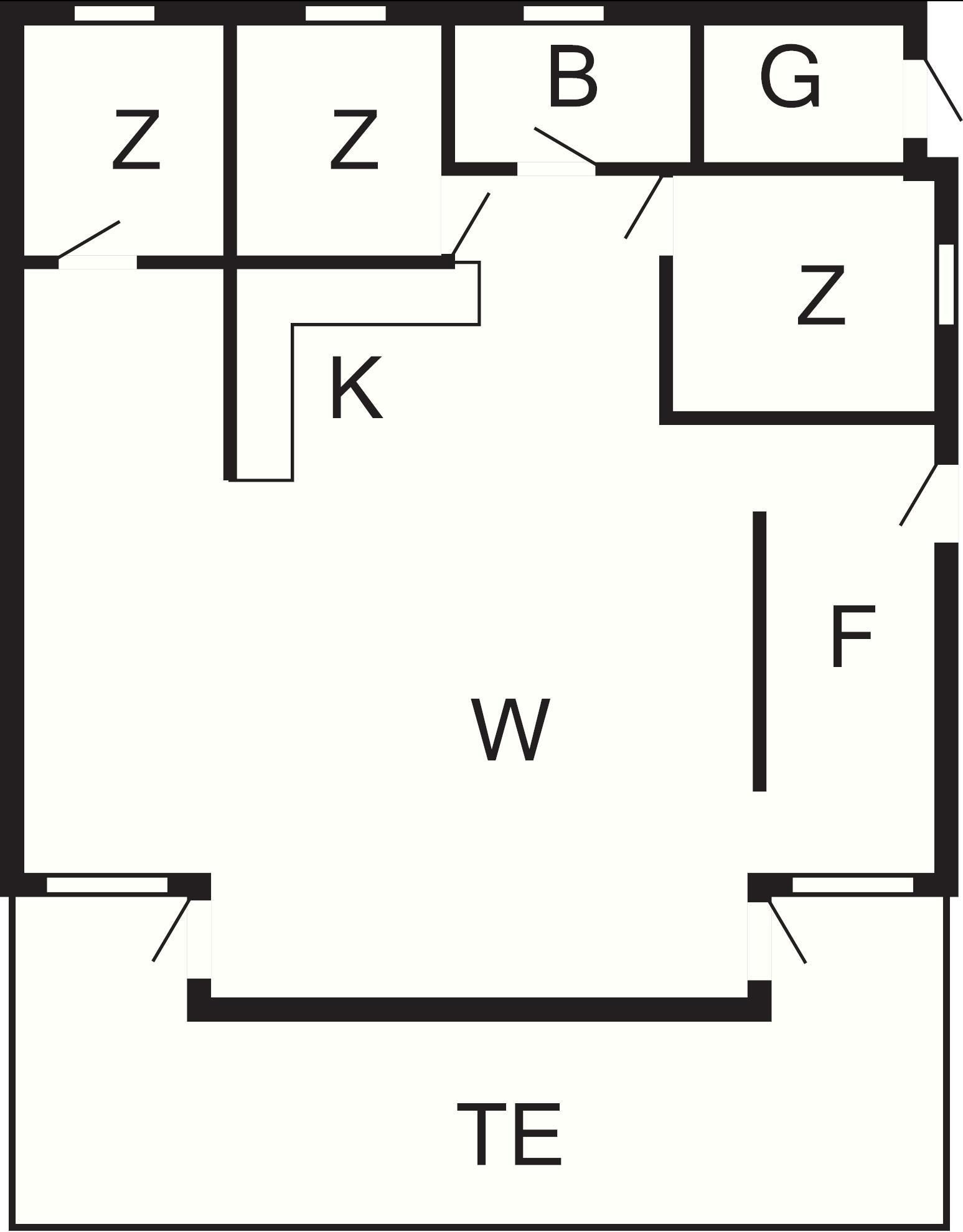 Das Ferienhaus ist mit einem großen Aufenthaltsraum, der offen mit der Küche verbunden ist, einer kleinen Gartenstube und drei Schlafzimmern