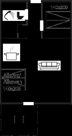 Es gibt einen Schlafraum. 2 Schlafplätze in einem Doppelbett.2 Schlafplätze im Alkoven.