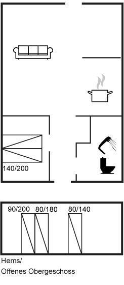 Es gibt einen Schlafraum. 4 Schlafplätze in Doppelbetten. 2 Schlafplätze auf einer Doppelschlafcouch. 2 von diesen Schlafplätzen befinden sich im offenen Obergeschoss und 2 befinden sich im Wohnzimmer.