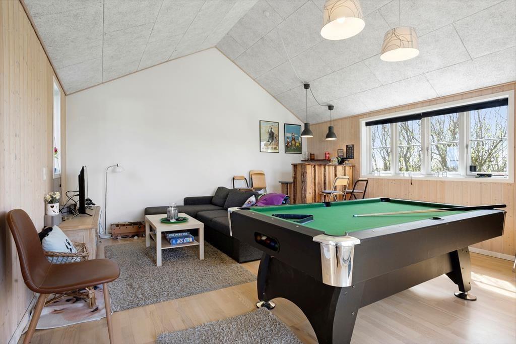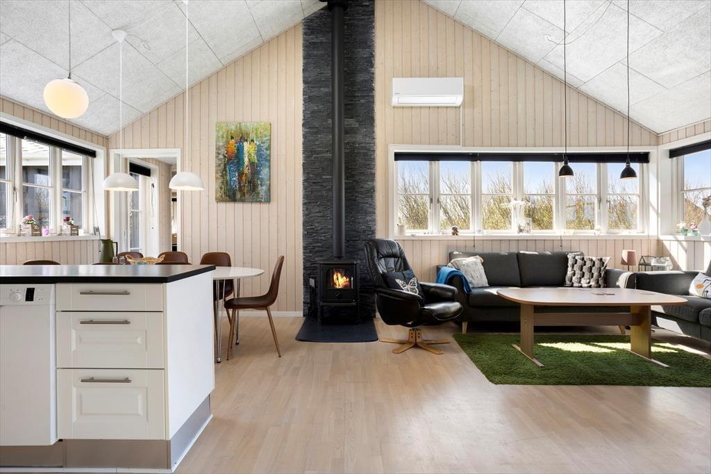 Dieses moderne Holzferienhaus begrüßt dich mit hellen und einladenden Räumen, die dich sofort wie zu Hause fühlen lassen. Das Herzstück des Hauses ist die große Wohnküche, die nahtlos in das Wohnzimmer übergeht. Hier kann sich die Familie zu den Mahlzeiten versammeln, während die Wärme des Kaminofens für Gemütlichkeit sorgt. Es gibt drei schöne Schlafzimmer, zwei Badezimmer und einen großen, hellen Dachboden, der eine ideale Rückzugsmöglichkeit für Kinder bietet. Im Hauptbadezimmer wartet ein Whirlpool auf dich, perfekt zum Entspannen nach einem langen Tag am Strand. Vom Küchenbereich aus gelangst du in den Aktivitätsraum – ein echtes Paradies für die ganze Familie mit einer Bar, einem Billardtisch, einer Dartscheibe und Spielkonsolen. Hier kommt garantiert keine Langeweile auf!