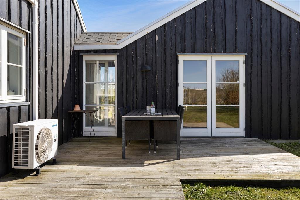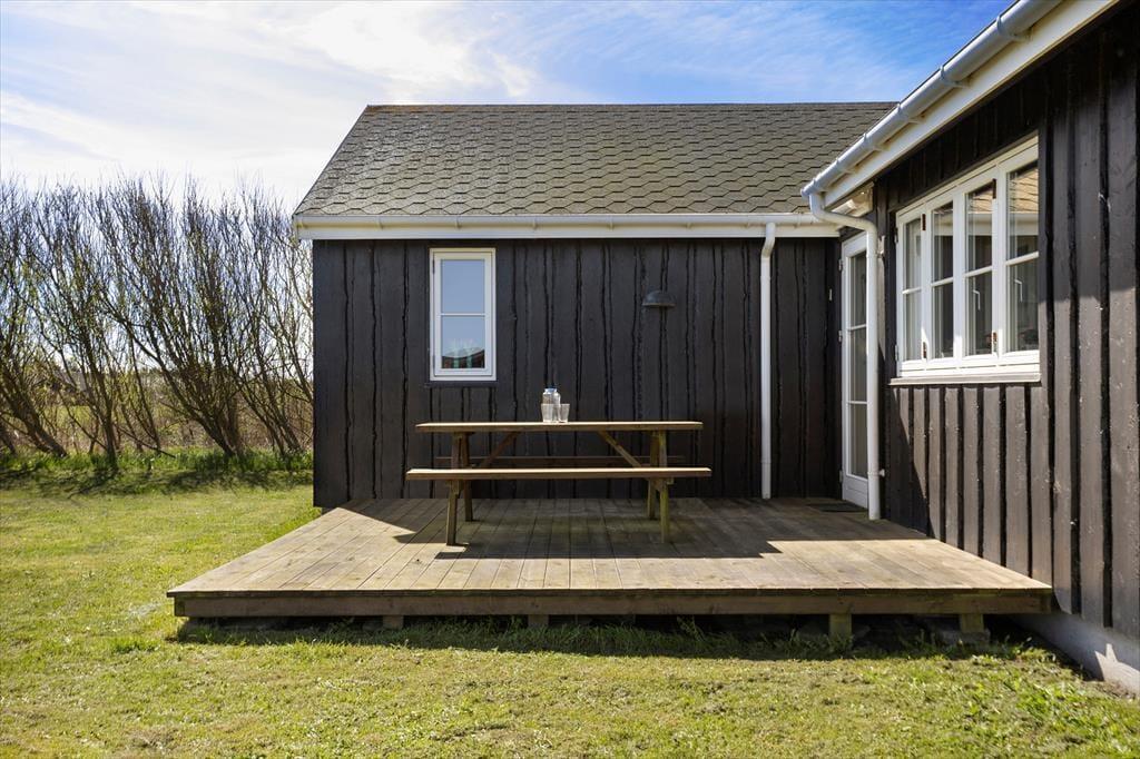 Die große Holzterrasse des Ferienhauses lädt zum Entspannen und Genießen ein. Starte den Tag mit einer Tasse Kaffee in der Sonne oder bereite ein köstliches Grillabendessen zu, während die Dämmerung einsetzt. Die Terrasse ist von der grünen Umgebung des Hauses umgeben und schafft eine ruhige und private Atmosphäre. Für die Kinder gibt es viel Platz zum Spielen im Garten, und die Nähe zum Strand macht es einfach, zwischendurch einen Spaziergang am Meer zu unternehmen und den Sand unter den Füßen zu spüren.