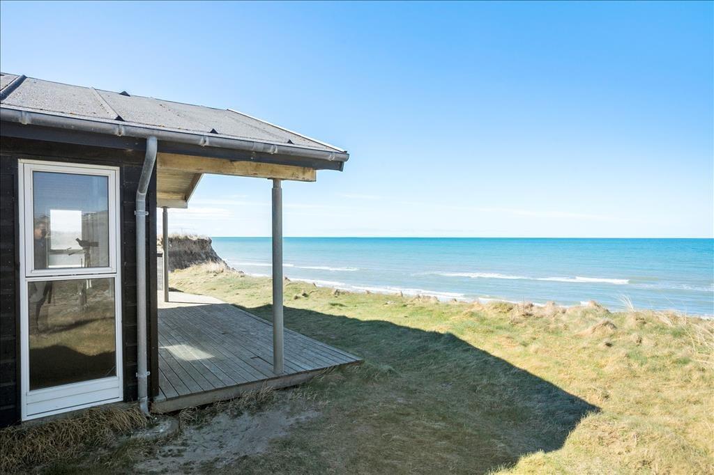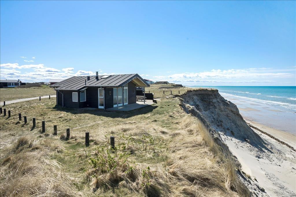 Dieses typische dänische Ferienhaus bietet einen herrlichen Blick auf das Meer und liegt direkt an der Küstenböschung bei Nr. Lyngby.