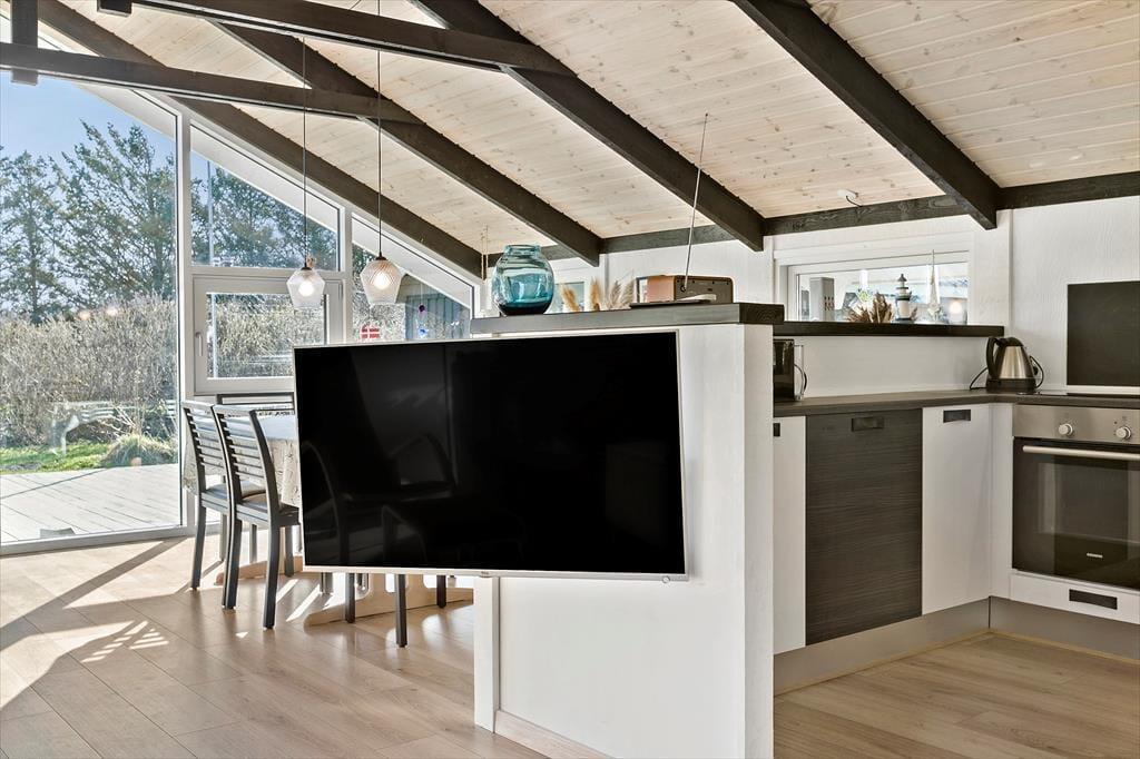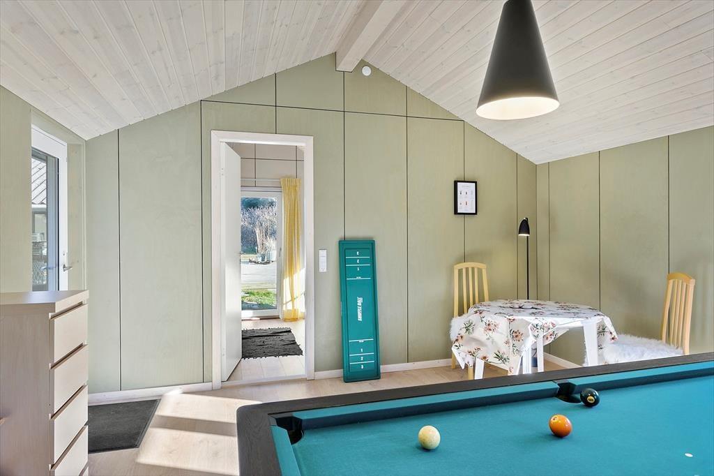 Das Ferienhaus, das 2019 renoviert wurde, ist 68 m² groß, dazu kommt ein gut ausgestattetes Gästehaus von 36 m². Mit anderen Worten, Sie haben reichlich Platz, um sich auszubreiten, und können problemlos zu sechst wohnen, da das Ferienhaus über zwei Schlafzimmer verfügt und ein drittes im Gästehaus ist. Das geräumige Gästehaus bietet zudem einen Aktivitätsraum, in dem Sie bei Billard und Darts gemütliche Stunden verbringen können – bis der unbestrittene Meister der Ferien feststeht. Nach dem Wettkampf ist vielleicht Zeit, ins Wohnzimmer des Ferienhauses zu wechseln, einem herrlichen Aufenthaltsraum mit Kaminofen, offener Decke und großen Fensterpartien, die das Tageslicht von Süden hereinlassen. Im offenen Übergang zum Wohnzimmer befindet sich die gut ausgestattete Küche des Hauses, und der Grundriss umfasst auch ein Badezimmer mit Dusche.