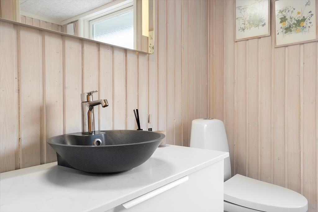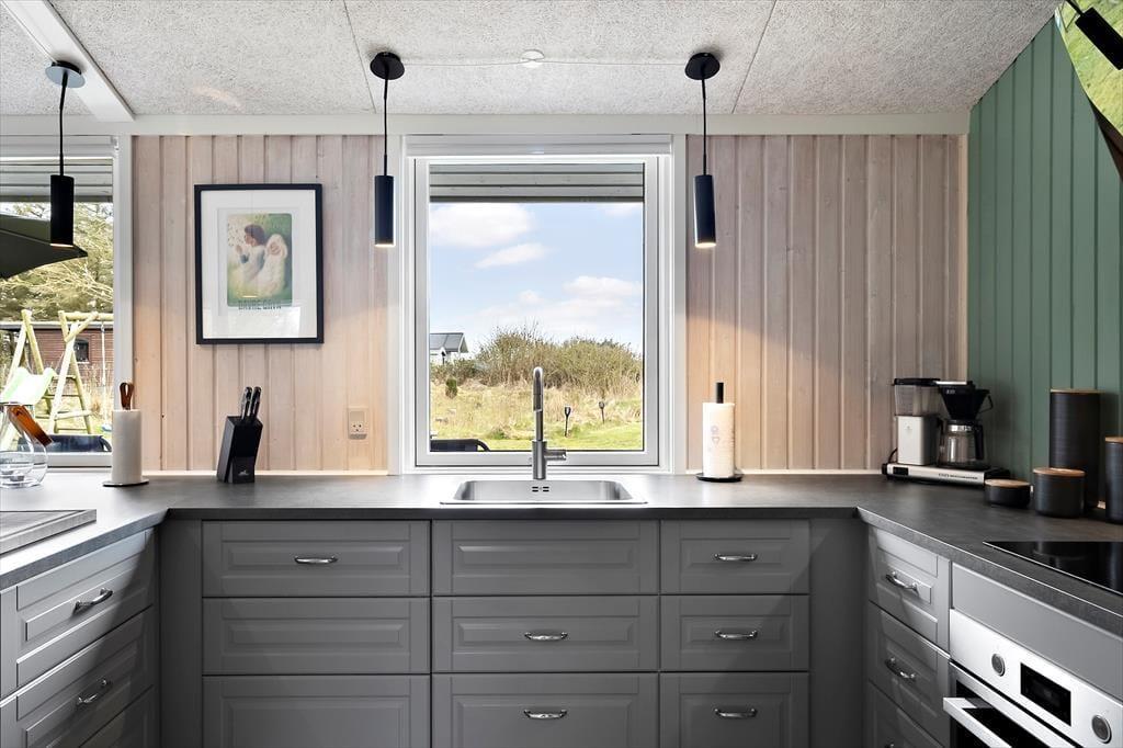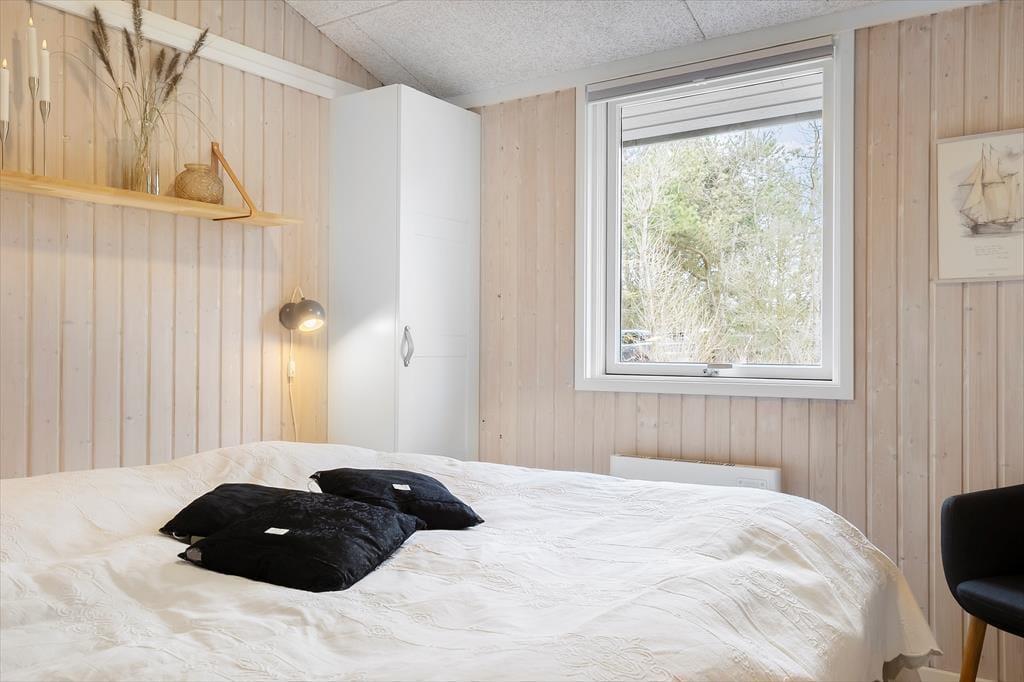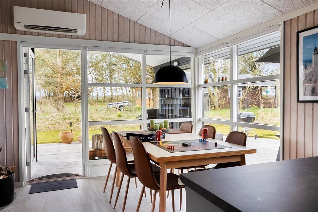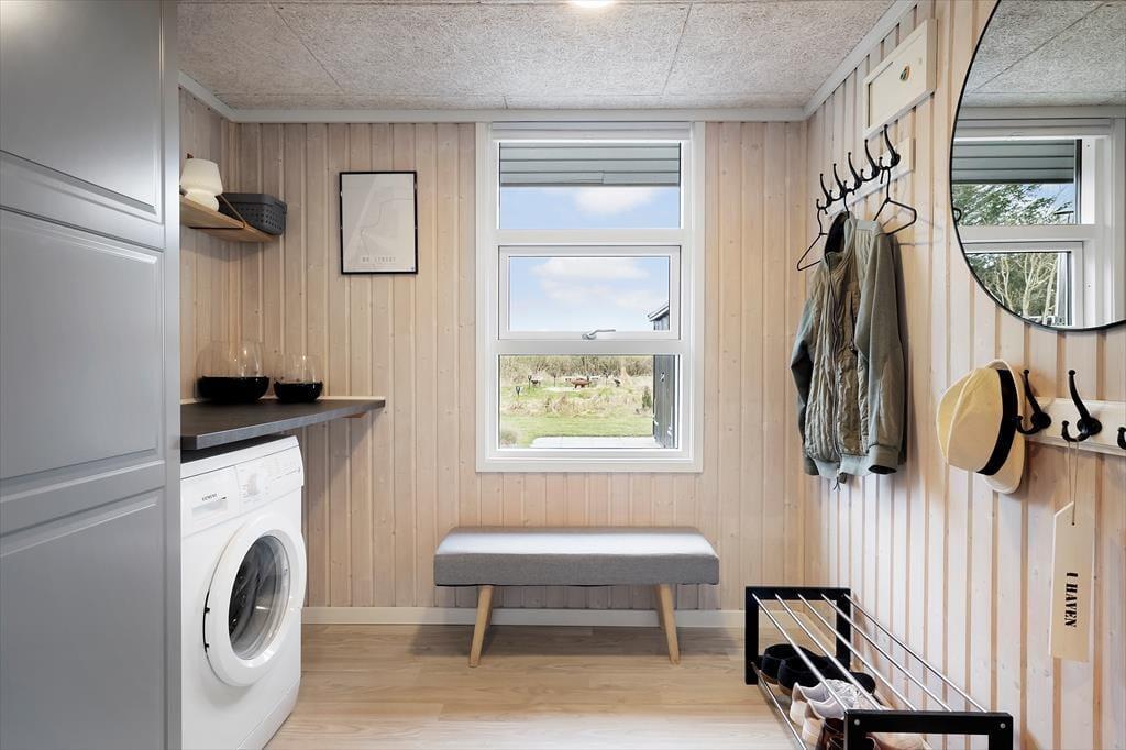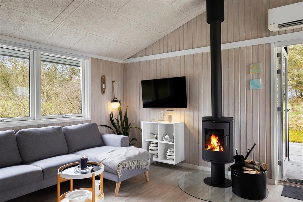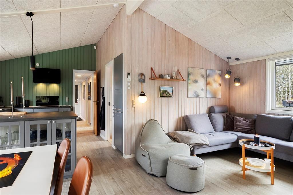 Ein geräumiger Flur mit Waschmaschine heißt Sie in diesem hellen und einladenden Ferienhaus willkommen. Drei gemütliche, nach Osten ausgerichtete Schlafzimmer und ein schönes Badezimmer mit Dusche und Fußbodenheizung machen den Grundriss ideal für sechs Personen. Das Ganze wird durch den Wohnbereich ergänzt, der zu Spielen, Entspannung und Geselligkeit für alle einlädt. Die großen Fenster lassen viel Tageslicht herein, und der Kaminofen sowie die Wärmepumpe sorgen dafür, dass es bei Bedarf gemütlich warm wird. Wenn Sie gerne kochen, ist es perfekt, ein so schönes offenes Küchenkonzept zu haben, und nach dem Essen ist das komfortable Sofa der ideale Ort, um sich zu entspannen.
