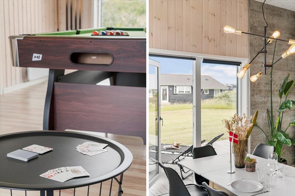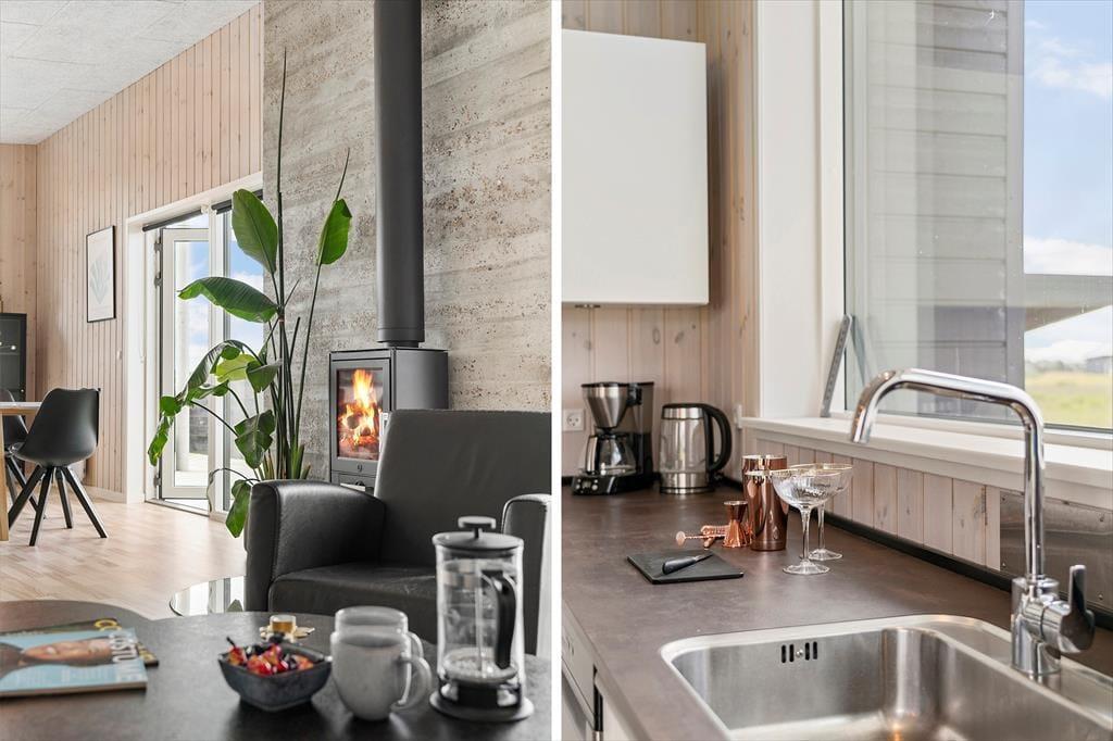 In diesem durchdacht eingerichteten Ferienhaus erwarten dich viele gemütliche Stunden, denn der Grundriss ist optimal auf das Zusammensein ausgerichtet. Die Küche ist offen mit dem Wohnbereich verbunden, sodass du beim Kochen die Gespräche am Esstisch oder in der Sofaecke am Kaminofen nicht verpasst. Hier kommt sofort Urlaubsstimmung auf – mit einem hellen, luftigen Interieur und großen Fensterfronten, die viel Tageslicht hereinlassen. An kühleren Tagen ist es ein Genuss, den Kamin anzuzünden und die wohlige Wärme im ganzen Raum zu spüren – vielleicht während der Regen leise gegen die Scheiben trommelt. Das Ferienhaus verfügt über drei gute Schlafzimmer und zwei Badezimmer, sodass auch mehrere Generationen gemeinsam Urlaub machen können. Wenn du dir etwas Besonderes gönnen möchtest, wartet eine Sauna auf dich, in der du entspannen und zur Ruhe kommen kannst. Und im Aktivitätsraum ist stundenlanger Spaß garantiert – ob beim Tischfußballturnier oder beim Brettspielabend.