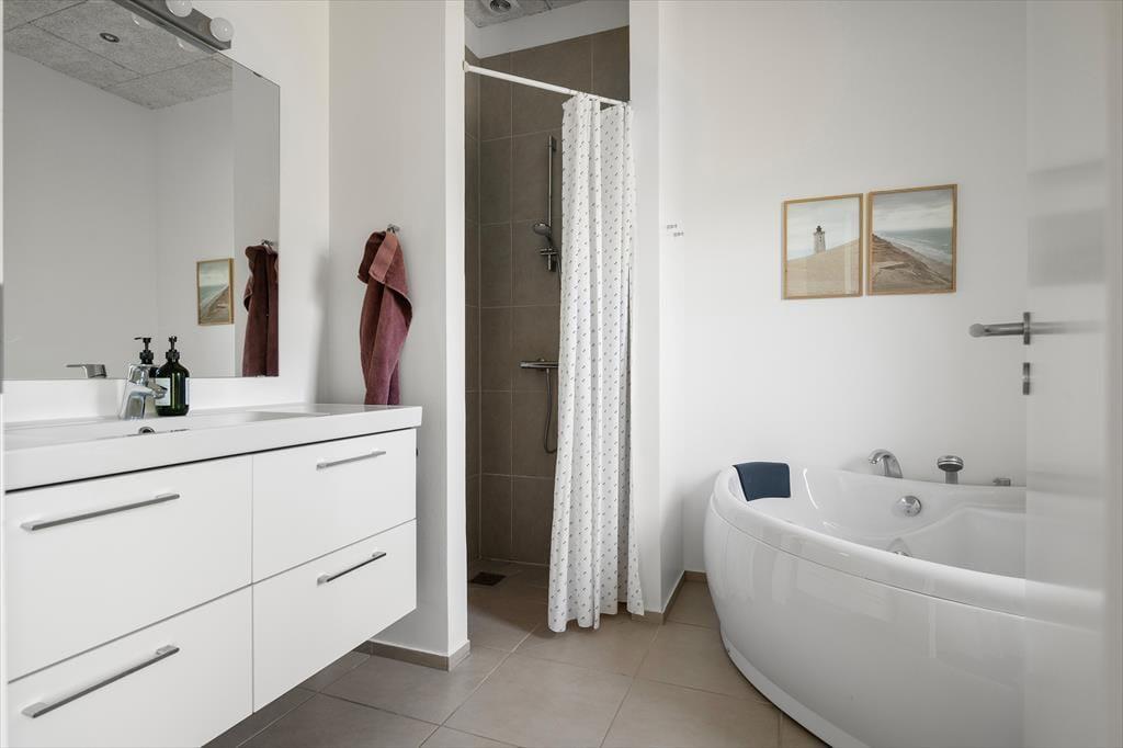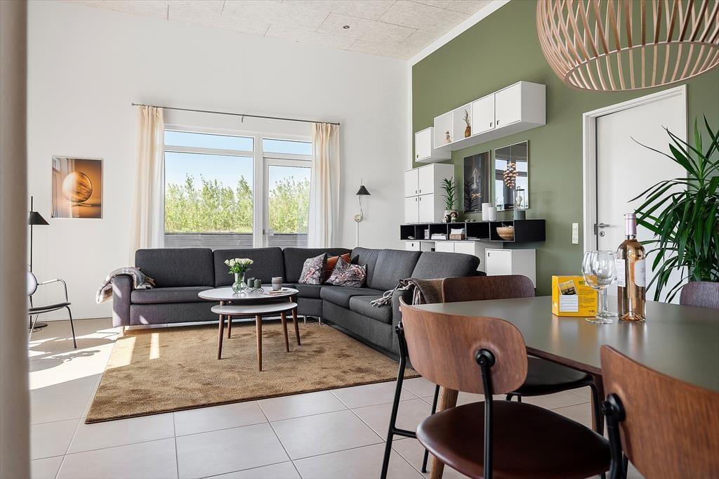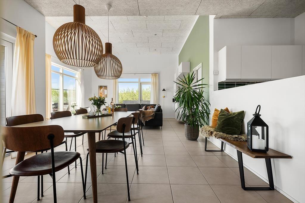 Das stilvolle Ferienhaus besticht durch eine helle und einladende Einrichtung. Große Fensterfronten und ein durchdachter Grundriss schaffen eine besondere Atmosphäre aus Licht, Luft und Ruhe. Die vier großzügigen Schlafzimmer machen es einfach, mit mehreren Familien zusammen zu verreisen, und mit zwei Badezimmern – eines davon mit Whirlpool – ist ausreichend Platz für Entspannung und Alltagskomfort vorhanden. Die moderne Küche ist offen in das Wohnzimmer integriert, sodass das Zusammensein nie unterbrochen werden muss, wenn gekocht wird. Hier kann man gemeinsam kochen, spielen und gute Gespräche führen – und wenn der Abend hereinbricht, lädt die ruhige Atmosphäre zum Kuscheln auf dem Sofa und vielleicht zu einem guten Film ein. Überall im Haus fällt das Licht wunderschön ein und vermittelt ein Gefühl von Nähe zur Natur draußen. Es ist leicht, sich hier wie zu Hause zu fühlen – und sich gleichzeitig ein kleines bisschen Luxus zu gönnen.