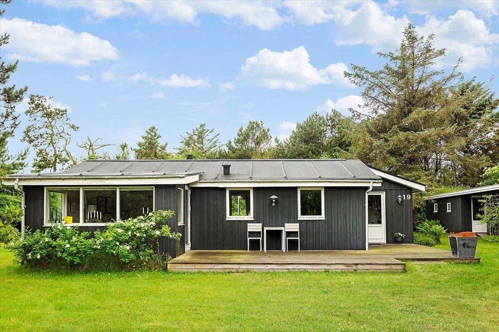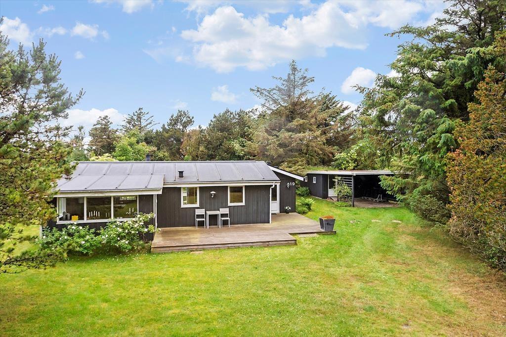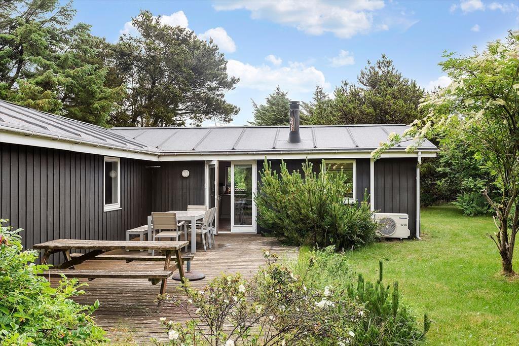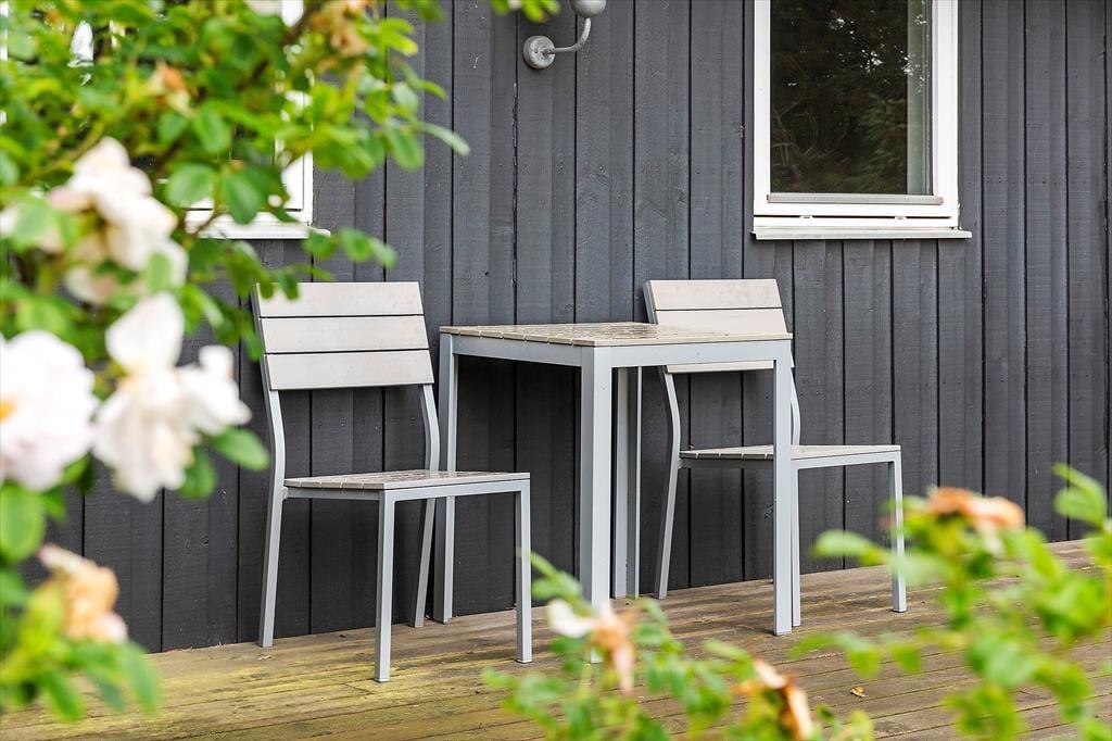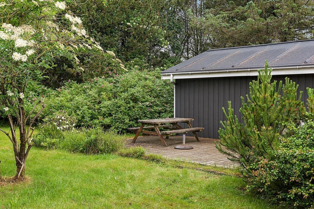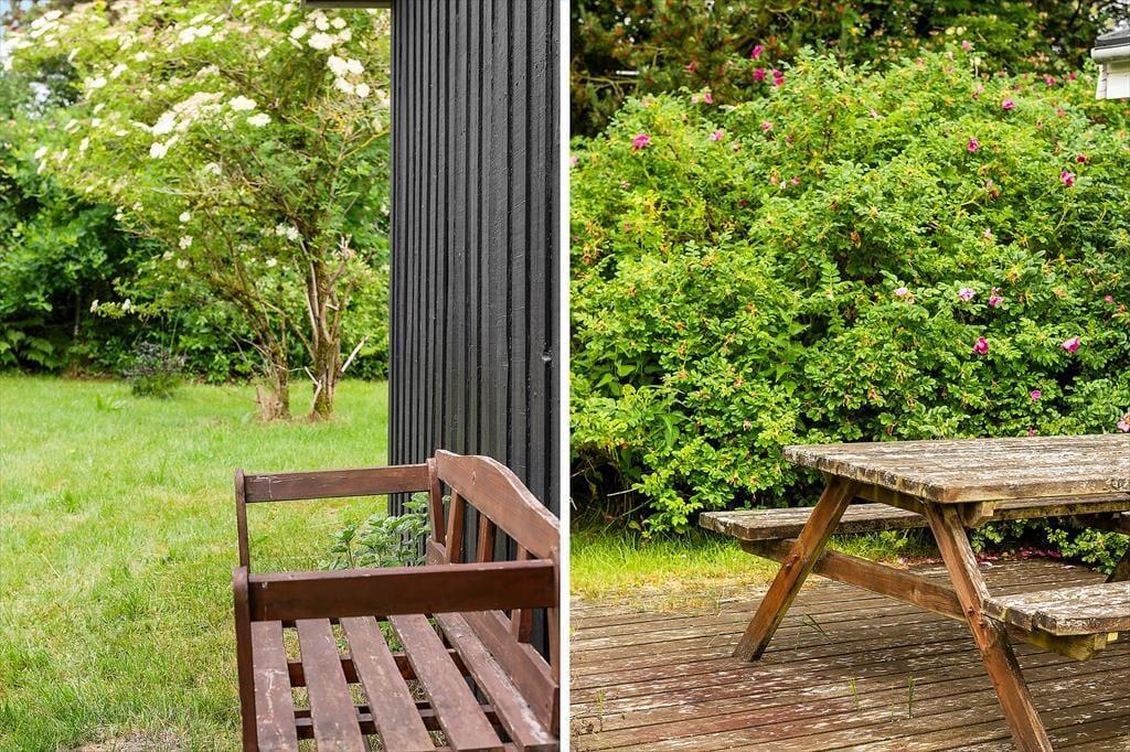 Das Ferienhaus befindet sich auf einem großen Naturgrundstück, umgeben von Bäumen, mit einer Mischung aus Pflanzen und Rasenfläche. Auf beiden Seiten des Hauses wurde eine Terrasse angelegt, sodass es gute Möglichkeiten gibt, einen Platz in der Sonne zu finden oder zu grillen und die Mahlzeiten zu genießen, und nicht zuletzt; sich an den langen und hoffentlich warmen Abenden zu entspannen. Neben dem Grill gibt es Gartenmöbel und Liegestühle am Haus.