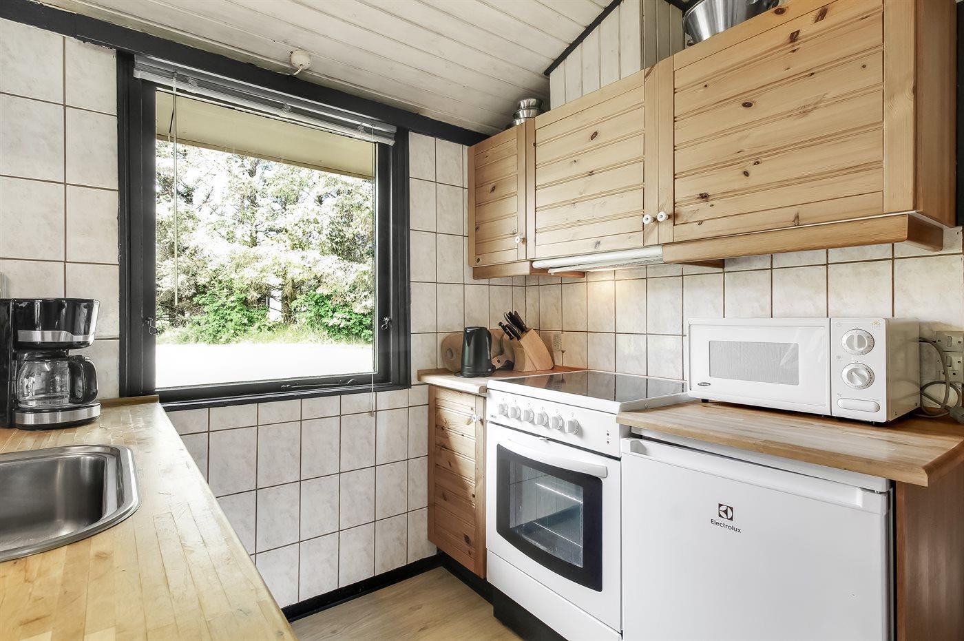 Die Küche ist mit Kühlschrank ausgestattet. Außerdem gibt es 4 Keramik-Kochfelder, Backofen, Mikrowelle.