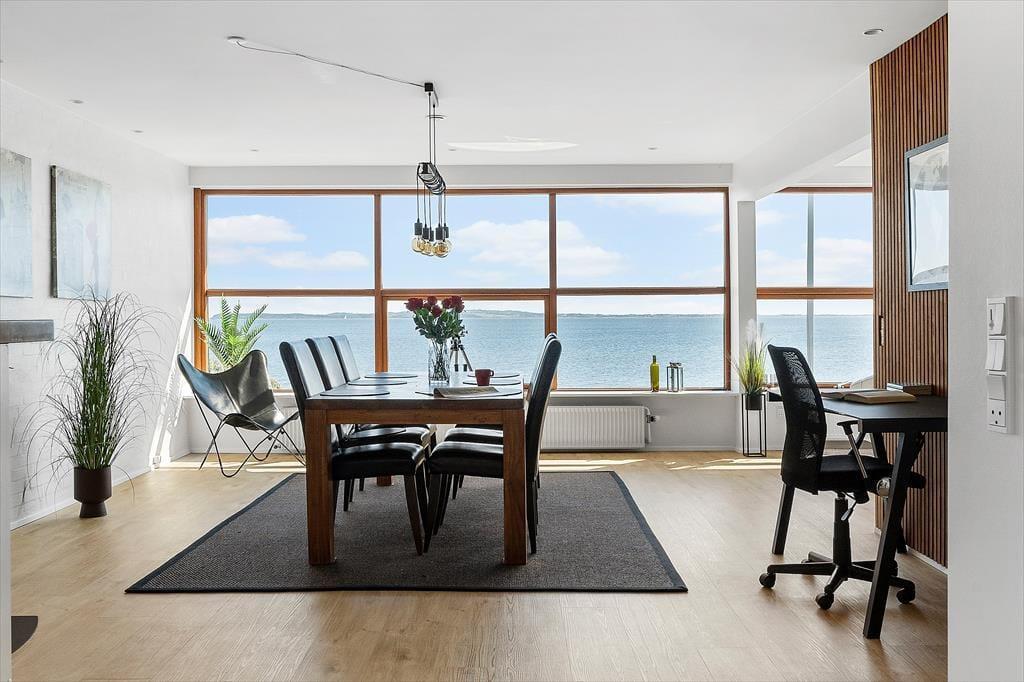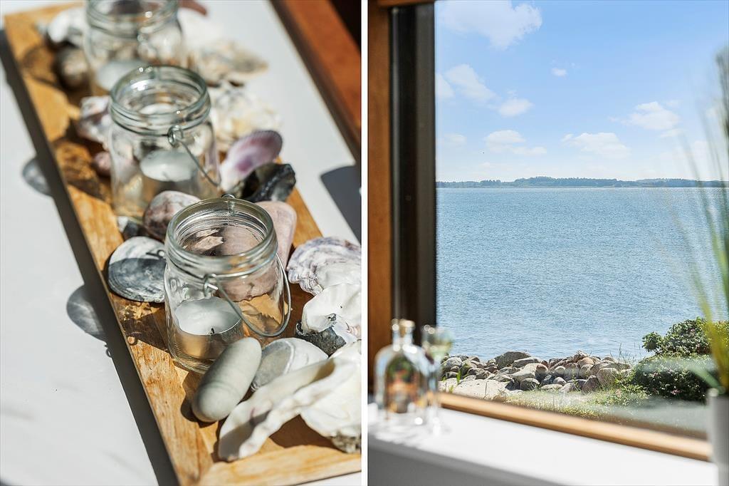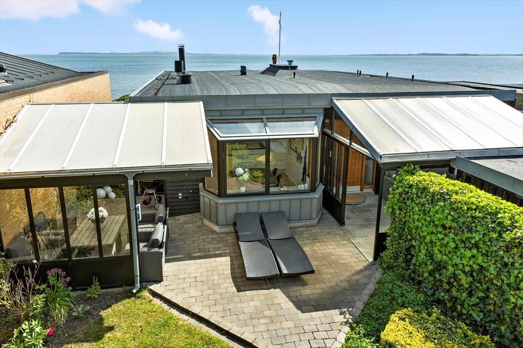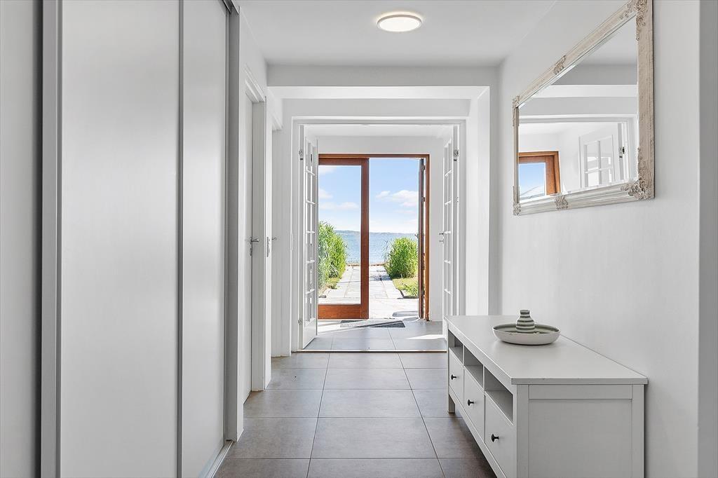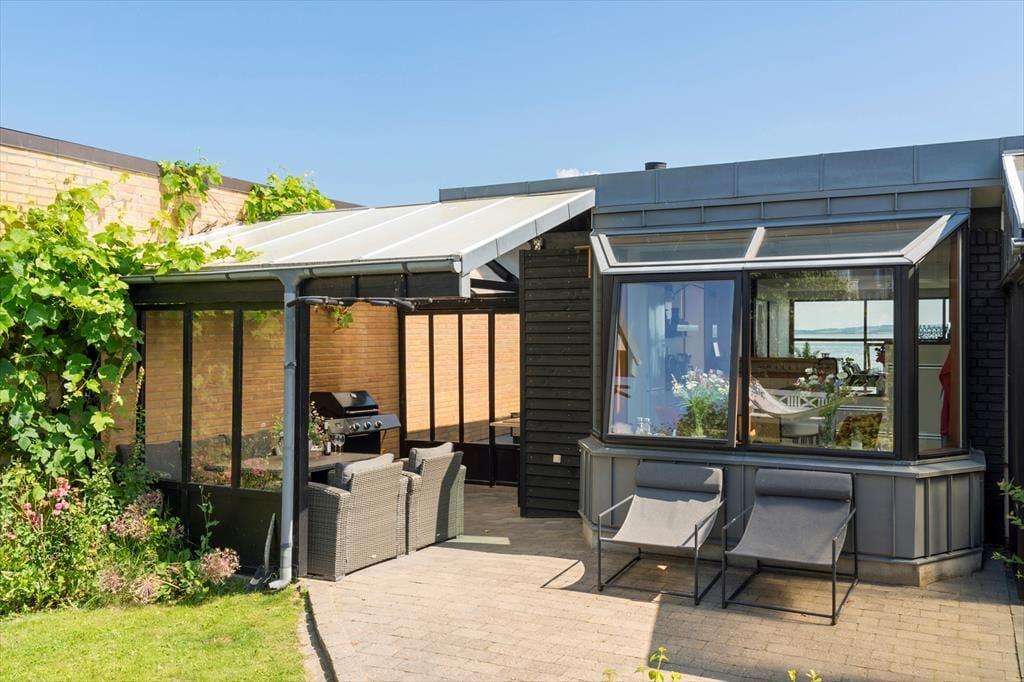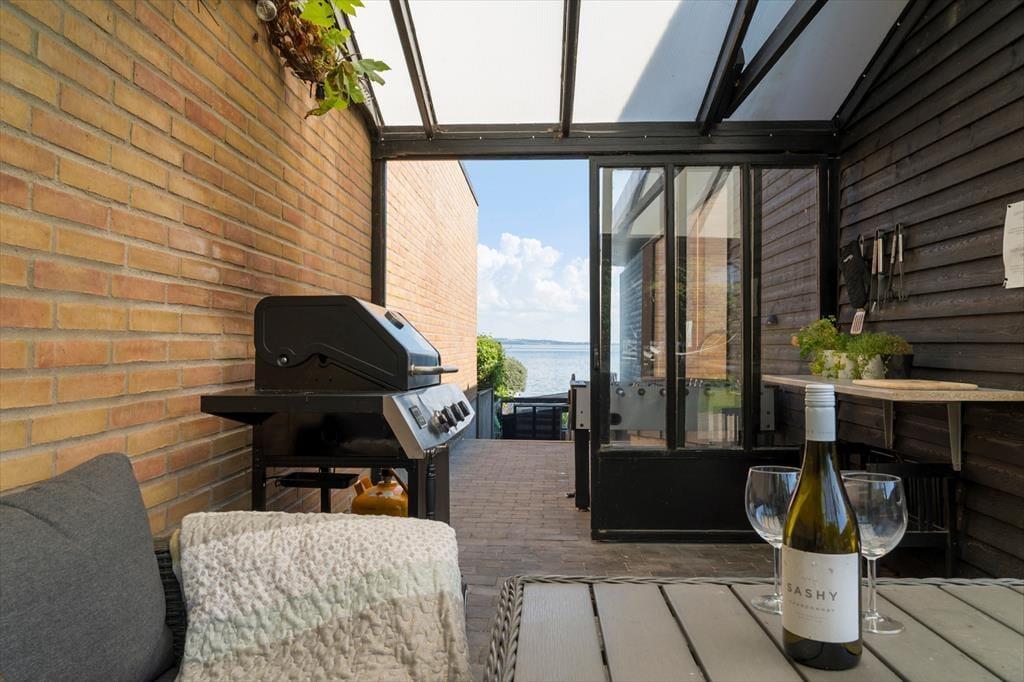 Im Vorgarten treffen Sie auf einen gen Westen ausgerichteten Wintergarten, eine überdachte Terrasse und ein Carport. Obwohl es richtig schön ist, hier entspannte und gemütliche Momente zu verleben, wird es Sie wahrscheinlich dennoch meist unwiderstehlich auf die Ostseite des Hauses ziehen, wo Sie nicht nur ein wunderschöner Ausblick, sondern auch ein richtig schöner Garten mit mehreren Terrassenarealen und selbstverständlich auch Ihr privater Strand erwarten. Hier stehen ein Paddelboard und ein Ruderboot zur freien Verfügung, damit Sie auch die Momente im Freien uneingeschränkt geniessen können. Auf diesem Grundstück erleben Sie traumhaft schöne Sonnenaufgänge. Die Abendstunden genießen Sie sicherlich gerne an der Bar im "Strandhuset", bei dem es sich um eine überdachte Terrasse handelt, die auch ein sogenanntes Beachbed umfasst, auf dem Sie im Liegen den Ausblick auf das schimmernde Wasser des Fjords genießen.