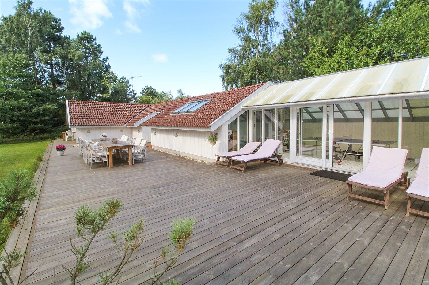 Wünschen Sie sich einen angenehmen Urlaub mit Ihrer Familie oder mit Ihren Freunden, dann ist die Möglichkeit hier. Wir können Ihnen dieses Ferienhaus älteren Jahrgangs (1990) mit Swimmingpool, Whirlpool und Sauna anbieten. Das Haus liegt auf einem großen, abgeschirmten Naturgrundstück, nur 500 m von einem der besten Badestrände Nordseelands; Nordstrand entfernt. Innen gibt es Holzwände und -decken. Holzböden im Wohnzimmer und in den Zimmern, sonst Klinkerböden. Das Haus ist für 2 Familien geeignet. Es gibt 12 komfortable Schlafplätze auf 6 Schlafzimmer verteilt: 5 mit Doppelbett und 1 mit 2 Einzelbetten. Außerdem 3 Badezimmer mit Duschnische und Fußbodenheizung. Das eine Badezimmer enthält auch eine Sauna. Die Küche ist mit Mikrowelle, Geschirrspüler sowie Herd mit Umluftofen und Ceran-Feld ausgestattet. Die Küche ist mit dem großen Wohnzimmer kombiniert, das u. a. TV mit digitalem Satellitenanschluss, DVD-Spieler sowie Stereoanlage mit Radio und CD-Spieler enthält. In der Pool-Abteilung mit beheiztem Klinkerboden finden Sie den Swimmingpool (5,0 X 3,0 X 1,35 m) und einen 3-Pers.-Whirlpool. Großer Wintergarten mit u. a. Tischtennis und Ausgang zu großer Terrasse mit div. Gartenmöbeln. Ein Teil der Terrasse ist überdacht. Außerdem stehen kabellose Internetverbindung via Glasfasernetz, Waschmaschine, Wäschetrockner, Kinderbett, Kinderhochstuhl, Schaukel und Carport zur Verfügung. Gute Einkaufsmöglichkeiten in Nykøbing Sj.