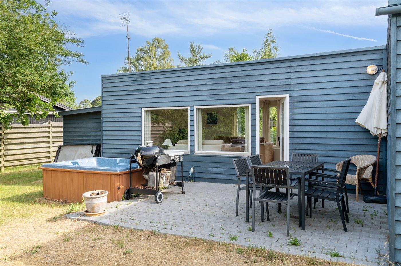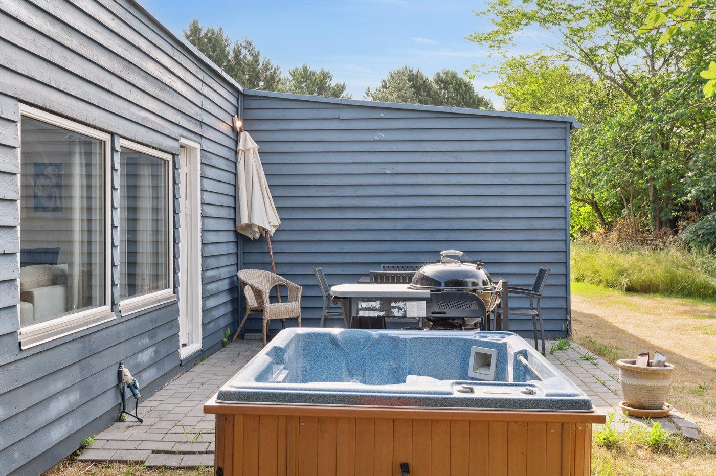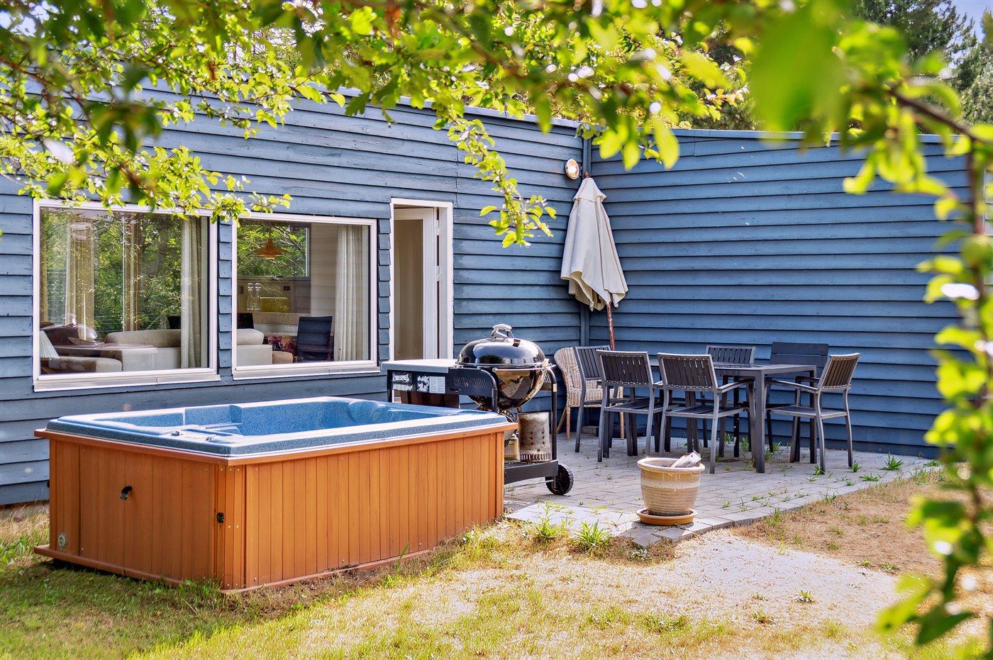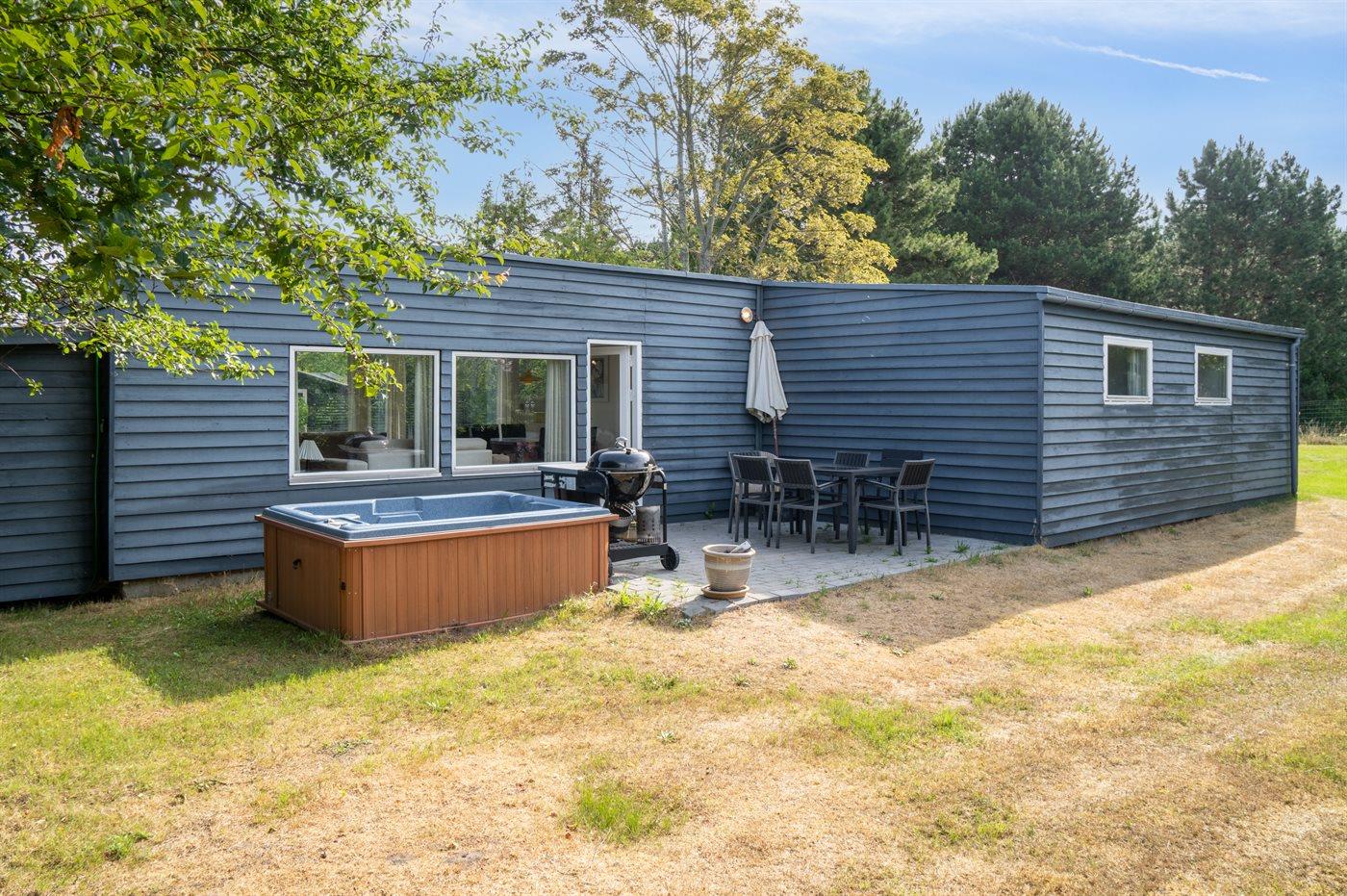 Dieses Ferienhaus aus Holz liegt auf einem Naturgrundstück - nur wenige Minuten Gang vom schönen Sandstrand entfernt. Vom Wohnzimmer gibt es Zutritt zur Terrasse und zu einem Outdoor-Whirlpool für 2 Personen. Der Whirlpool steht im Zeitraum von der 13 bis zur 42 KW zur Verfügung.