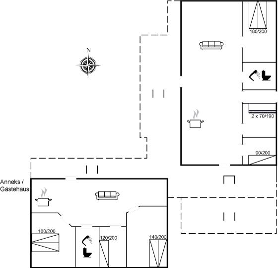 Die Schlafplätze verteilen sich auf 6 Schlafräume. 6 Schlafplätze in Doppelbetten. 2 Schlafplätze in Einzelbetten. 2 Schlafplätze in einem Etagenbett.- 5 von diesen Schlafplätzen befinden sich im Gästehaus.