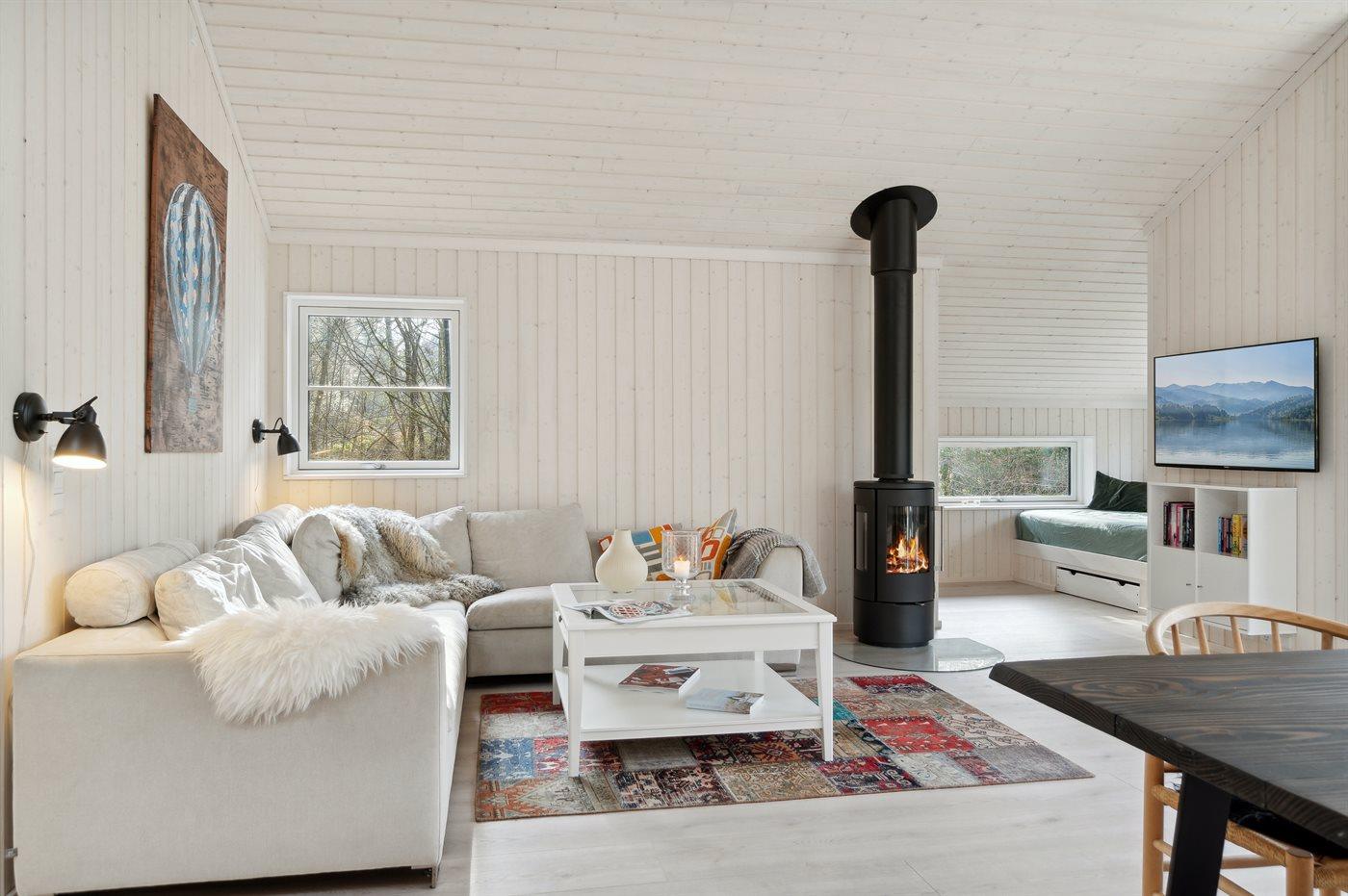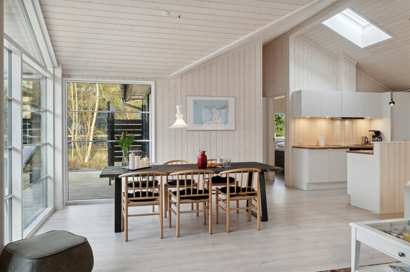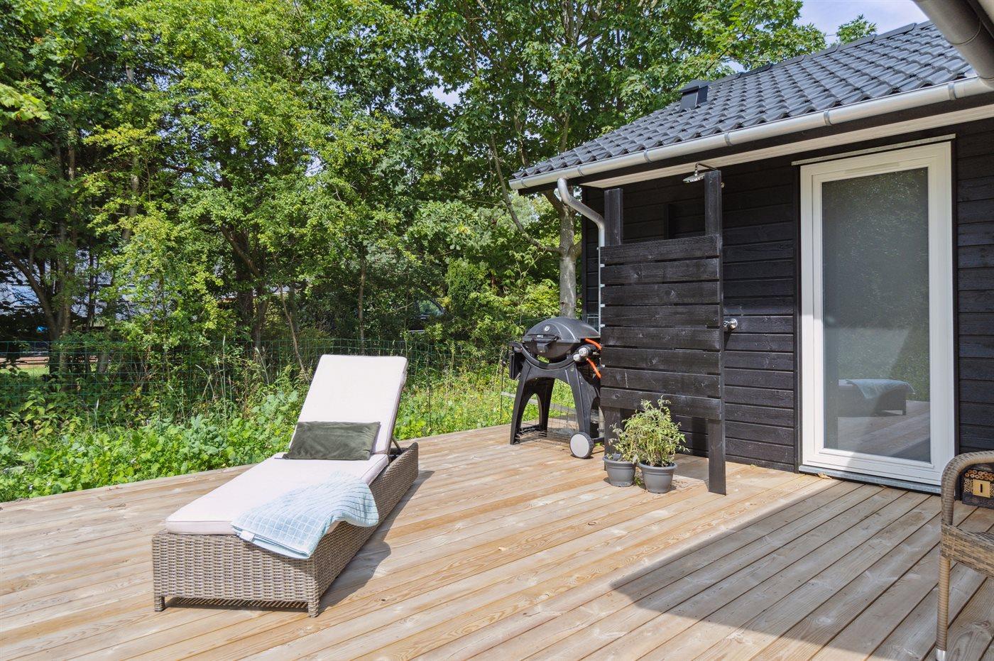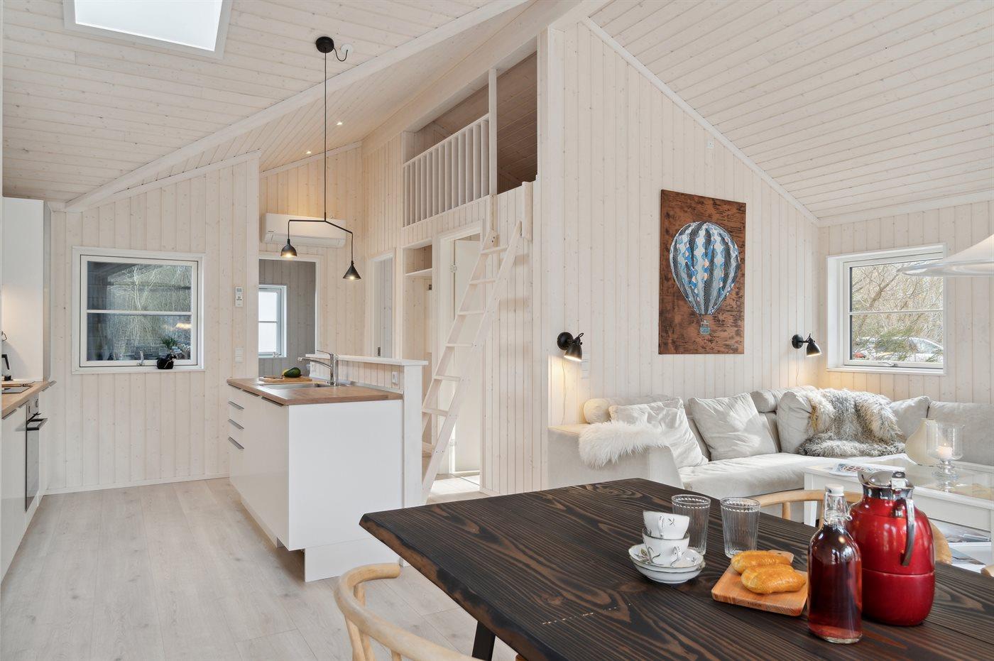 Der Mittelpunkt des Hauses ist der große offene Wohnbereich, der Küche, Essbereich und Wohnzimmer umfasst. Von hier gelangt man auf die große Holzterrasse, die teilweise überdacht ist und viele geschützte Ecken bietet. Das Haus verfügt über 3 schöne Schlafzimmer sowie Schlafplätze im offenen Obergeschoss und in dem gemütlichen Alkoven, der mit dem Wohnzimmer verbunden ist.