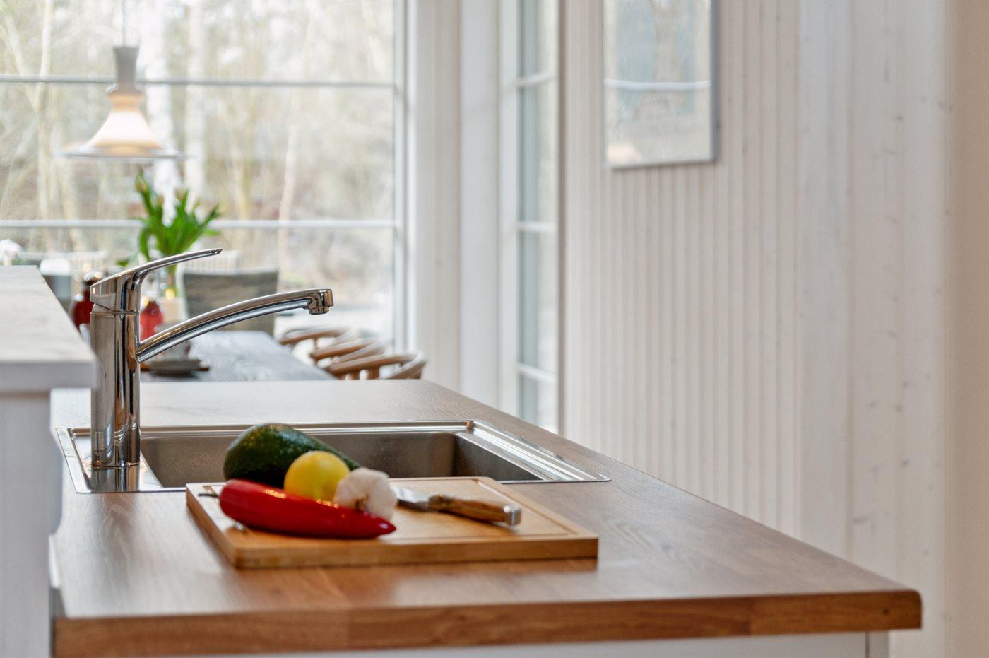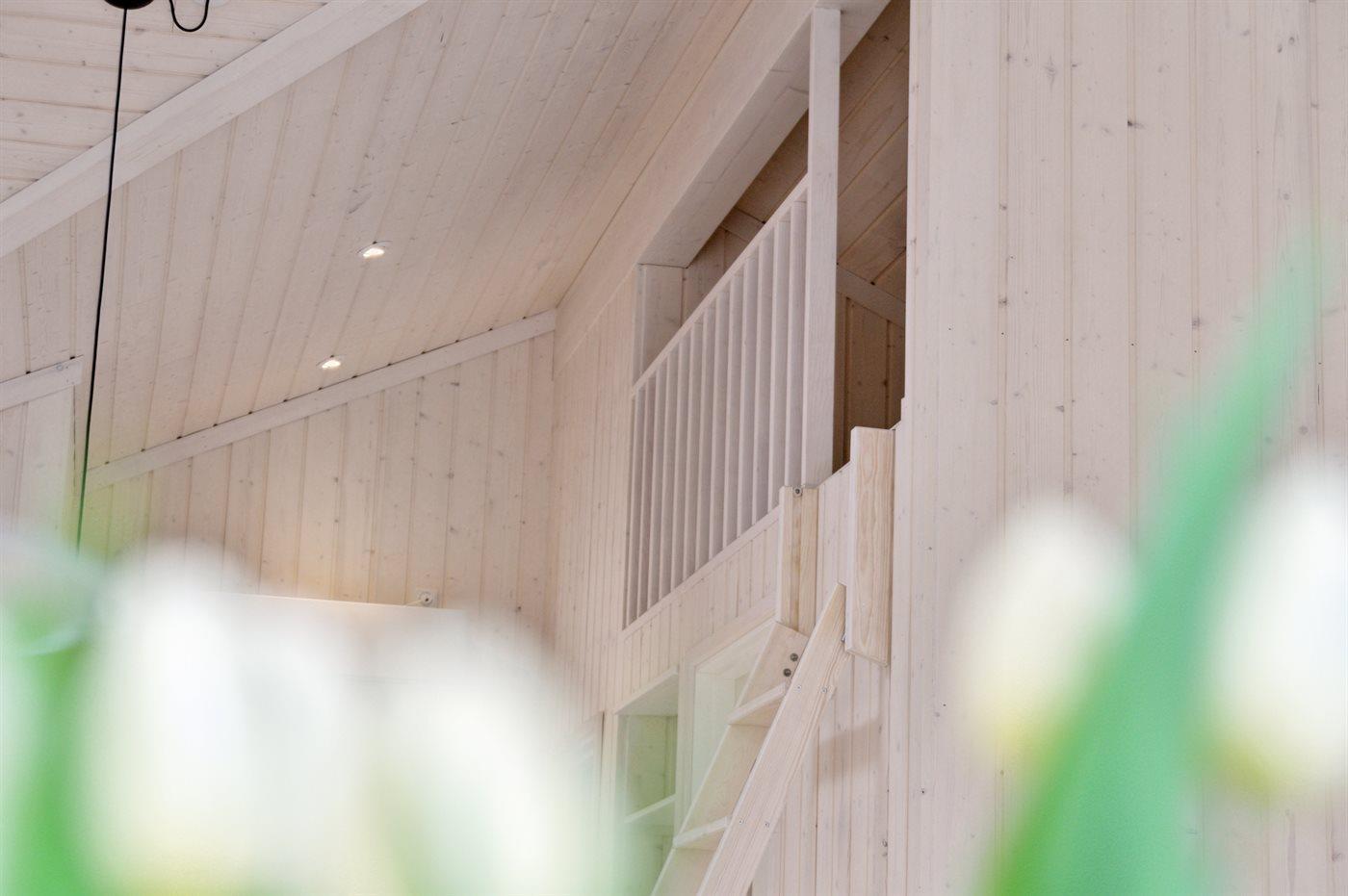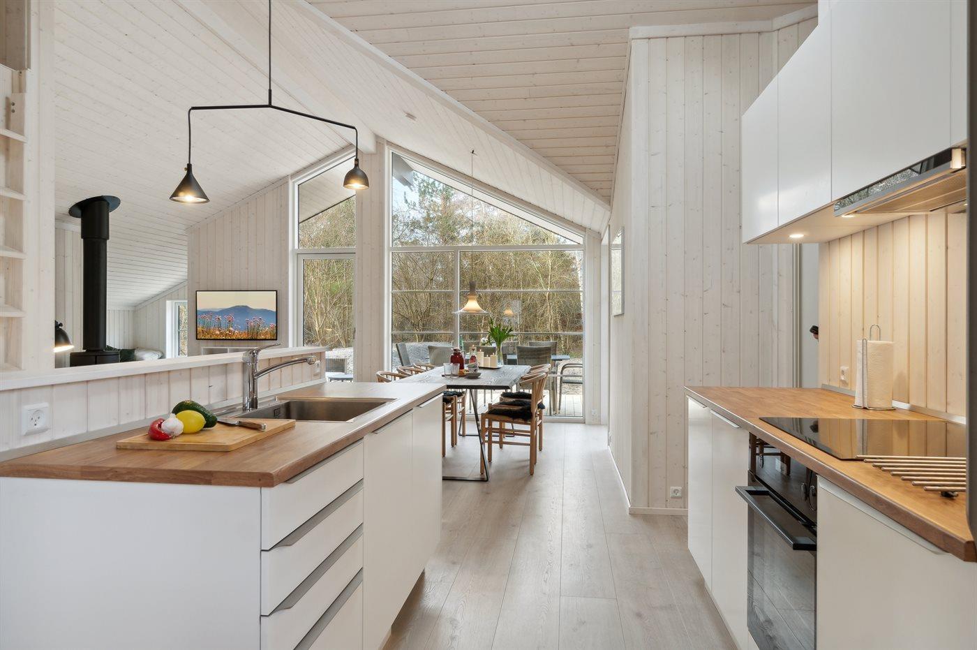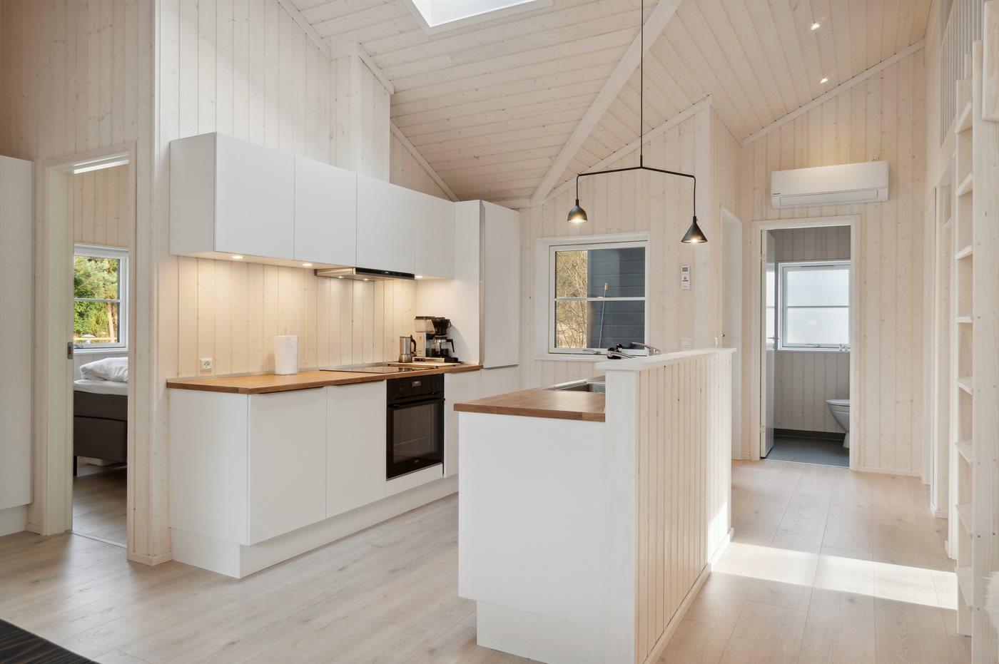 Der Mittelpunkt des Hauses ist der große offene Wohnbereich, der Küche, Essbereich und Wohnzimmer umfasst. Von hier gelangt man auf die große Holzterrasse, die teilweise überdacht ist und viele geschützte Ecken bietet. Das Haus verfügt über 3 schöne Schlafzimmer sowie Schlafplätze im offenen Obergeschoss und in dem gemütlichen Alkoven, der mit dem Wohnzimmer verbunden ist.
