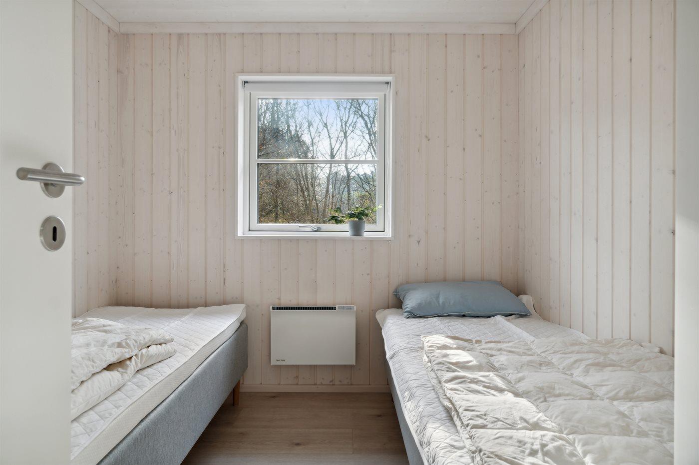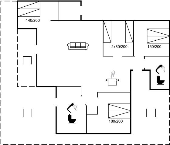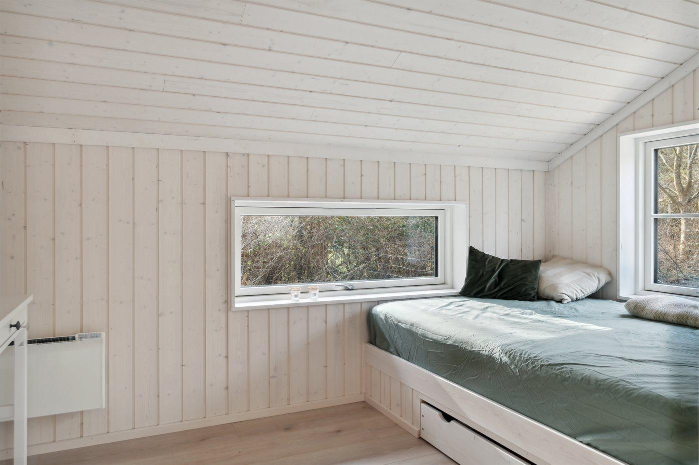 Die Schlafplätze verteilen sich auf 3 Schlafräume. 4 Schlafplätze in Doppelbetten. 2 Schlafplätze in Einzelbetten. 2 Schlafplätze auf Matratzen.2 Schlafplätze im Alkoven. 2 von diesen Schlafplätzen befinden sich im offenen Obergeschoss og 2 befinden sich im Wohnzimmer. Ferner steht ein Kinderbett zur Verfügung.