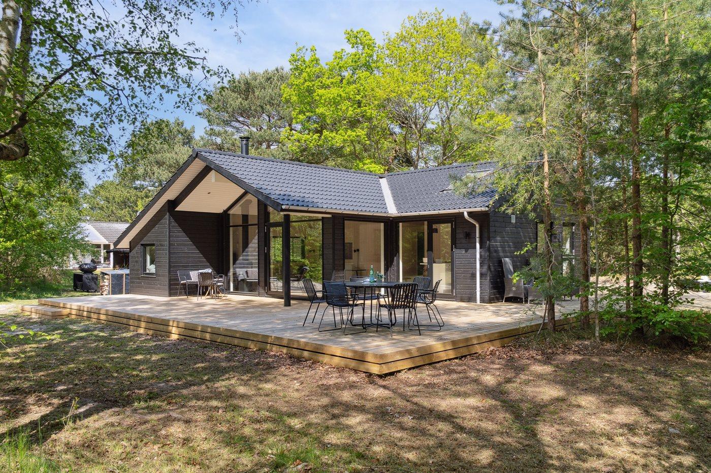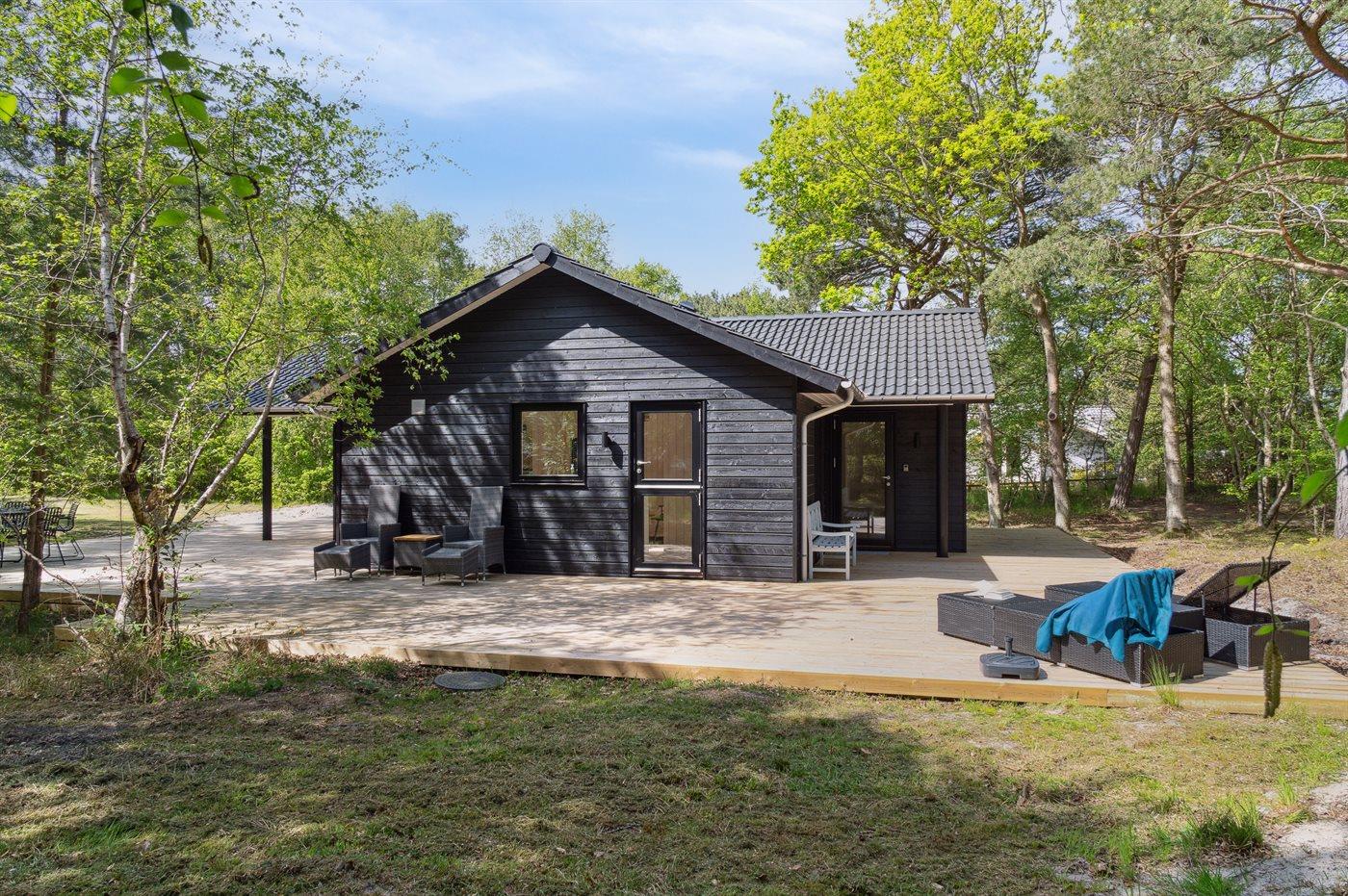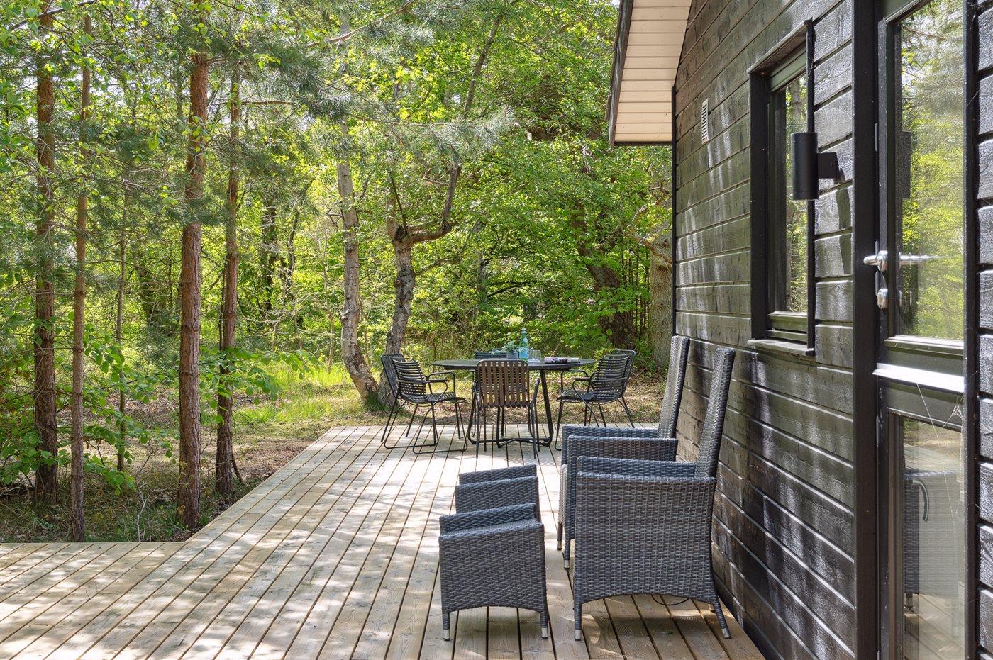 Dieses neue, moderne Ferienhaus liegt auf einem großen Naturgrundstück mit hohen Bäumen, nur 175 m von einem der besten und kinderfreundlichsten Sandstrände Dänemarks entfernt. Das Haus ist ringsherum von einer riesigen Holzterrasse mit Außenduschen umgeben, die teilweise überdacht ist. Hier finden Sie immer Sonne, Schatten oder Windstille.