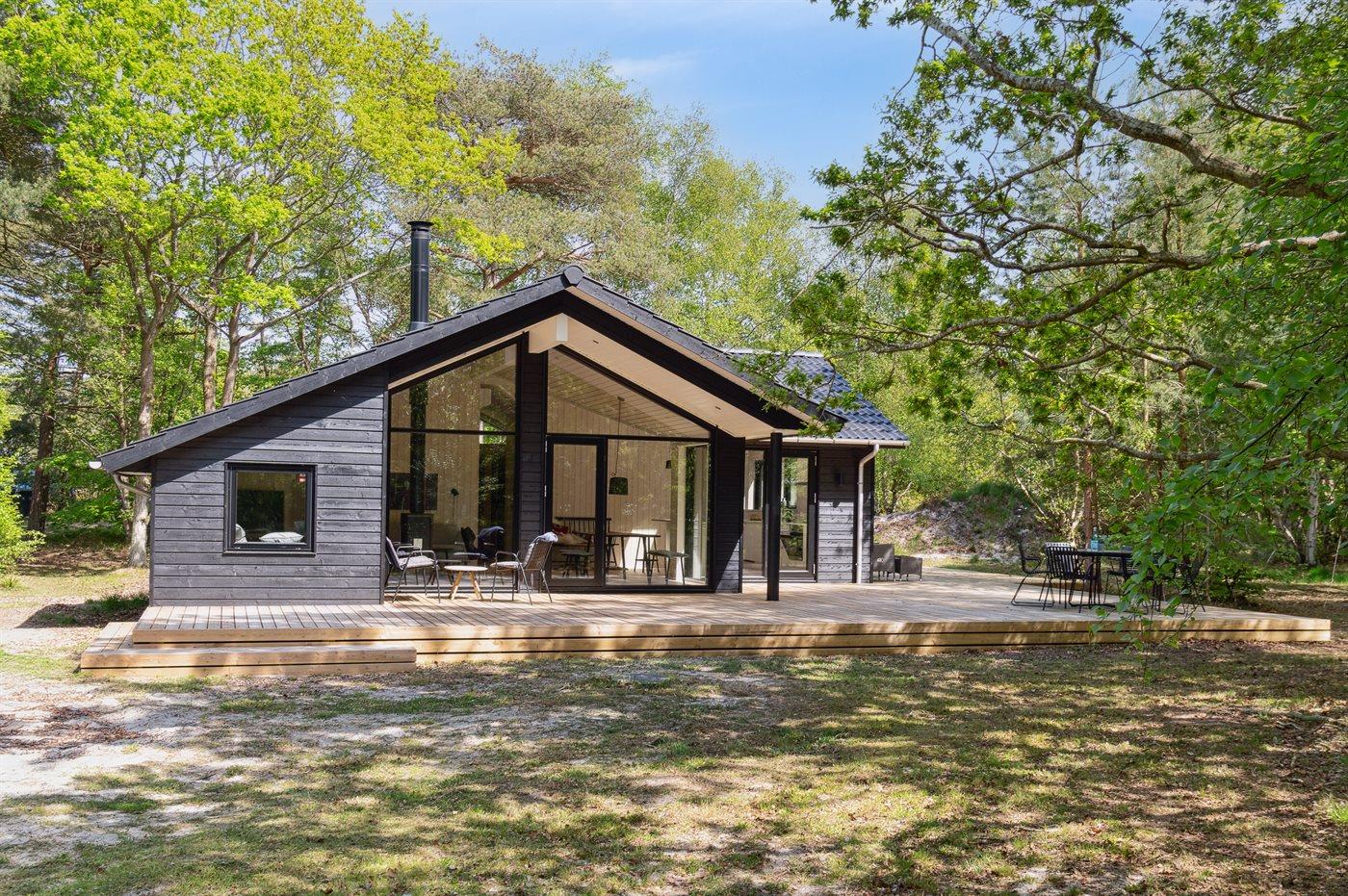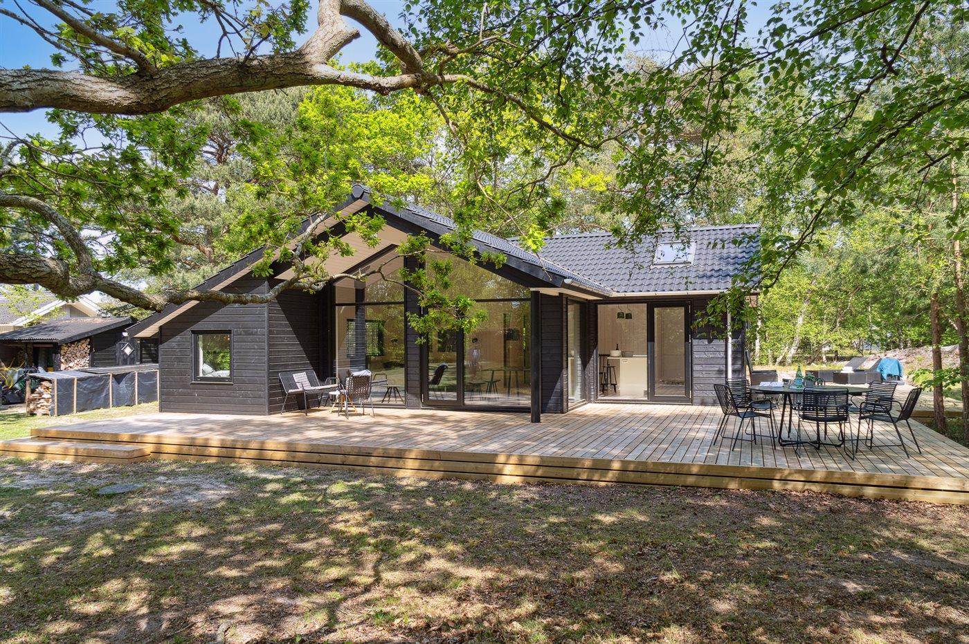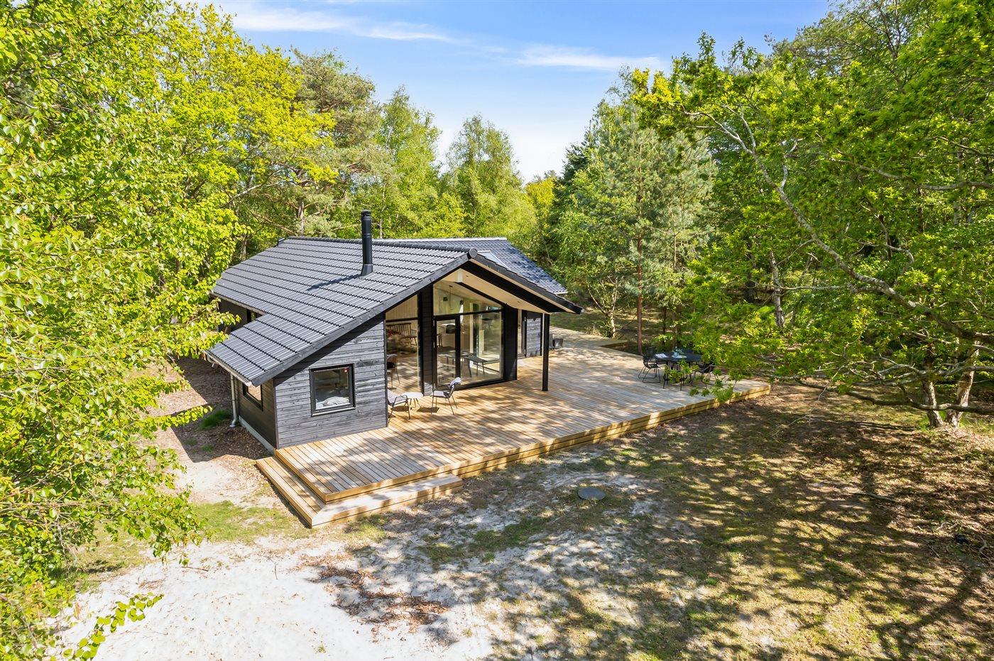 Dieses neue, moderne Ferienhaus liegt auf einem großen Naturgrundstück mit hohen Bäumen, nur 175 m von einem der besten und kinderfreundlichsten Sandstrände Dänemarks entfernt. Das Haus ist ringsherum von einer riesigen Holzterrasse mit Außenduschen umgeben, die teilweise überdacht ist. Hier finden Sie immer Sonne, Schatten oder Windstille.