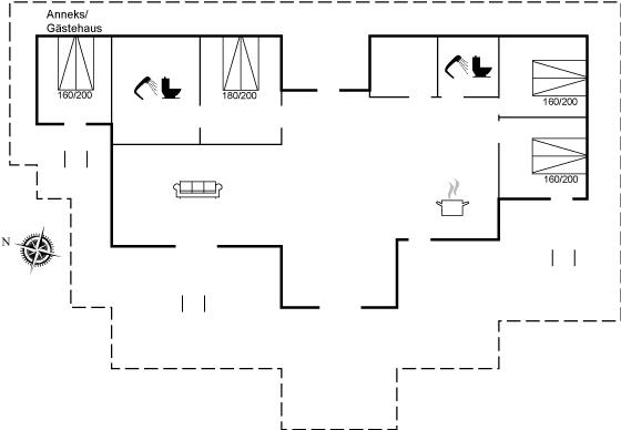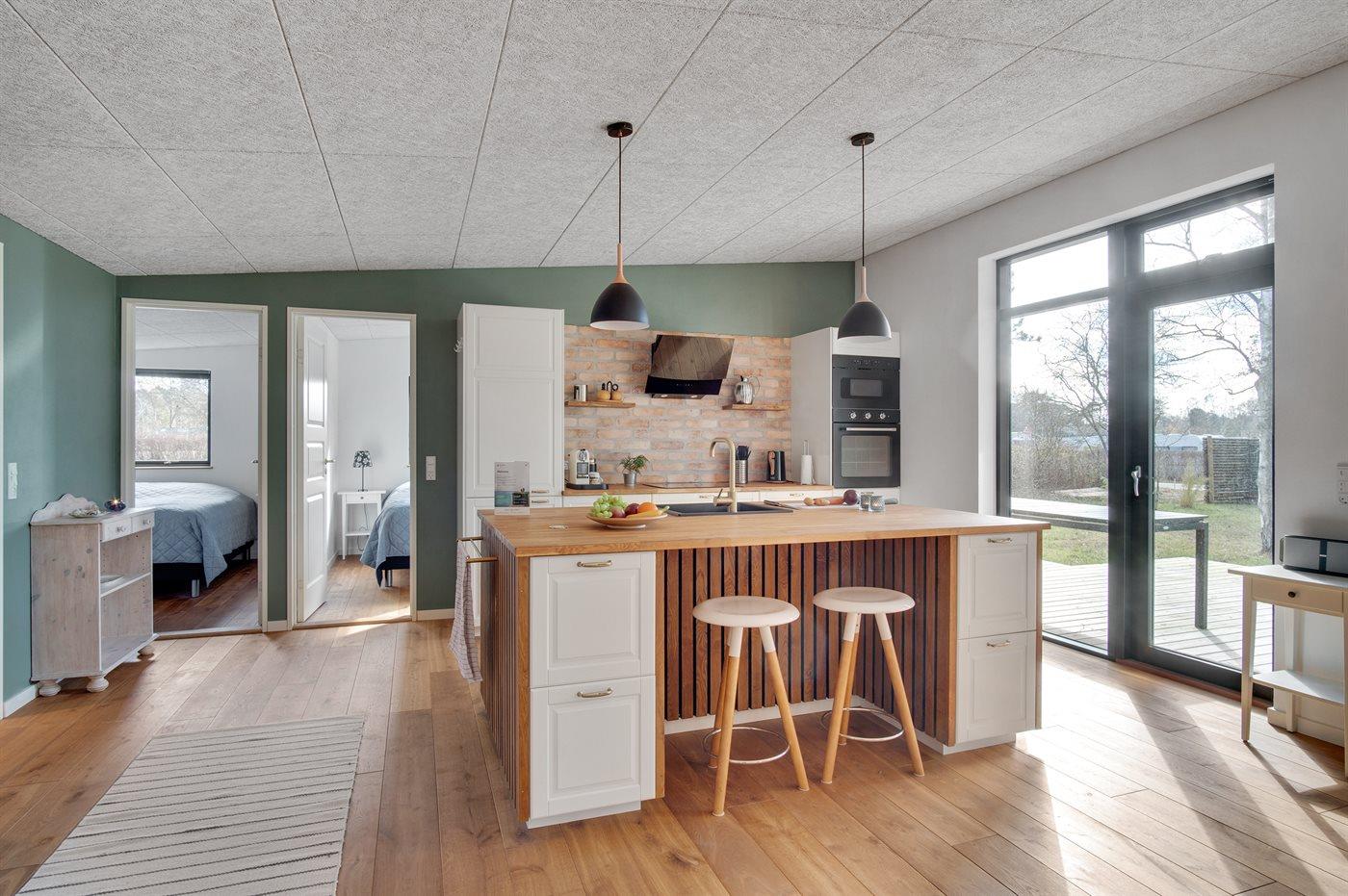 Die herrliche Küche grenzt offen an den Essbereich und das Wohnzimmer an und bildet so einen idealen Treffpunkt für gemütliche Stunden und Beisammensein. Das Haus verfügt über 3 schöne Schlafzimmer, alle mit Doppelbetten, sowie 2 Badezimmer mit Duschnische und Fußbodenheizung. In einem der Badezimmer steht eine Badewanne zur Verfügung. Zum Haus gehört ein Gästehaus, das mit Doppelbett eingerichtet ist (siehe Grundriss). Wenn man das Gästehaus verlässt, muss man etwa 15 Meter um das Ferienhaus herumgehen, um zur Haustür zu gelangen.