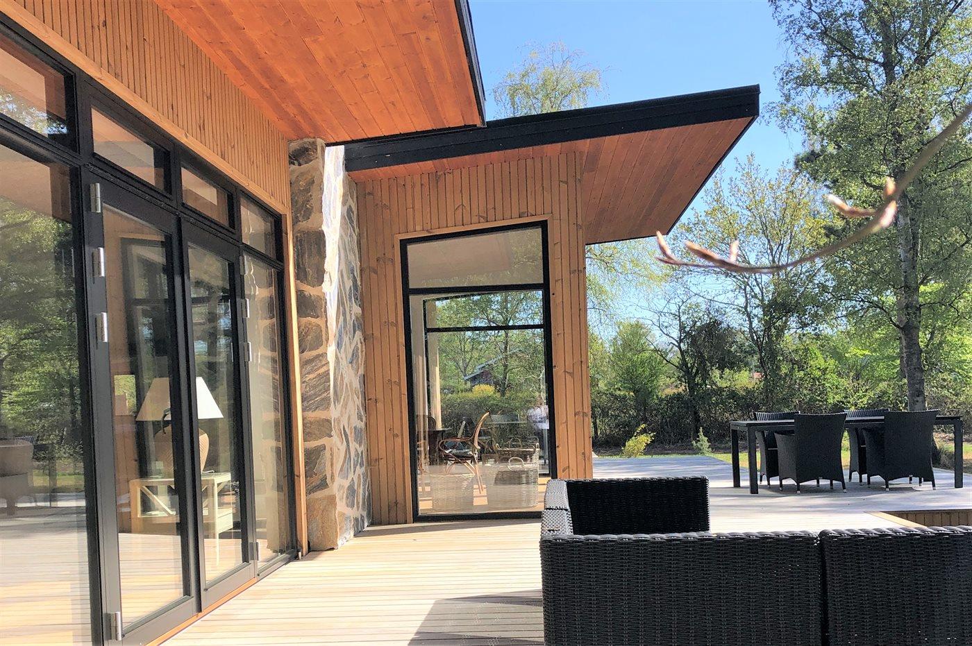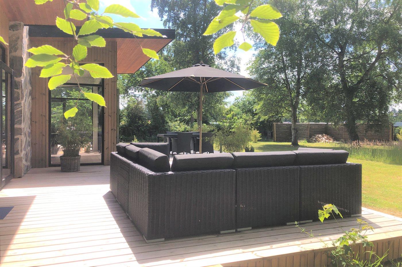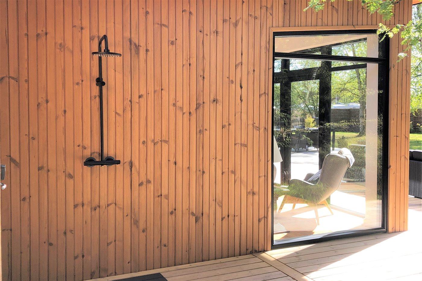 Das Haus ist hell und modern und wurde aus besten, sorgsam ausgewählten Materialien erbaut. Vor dem Haus befindet sich eine große Terrasse, die Sonne, Windschutz und Schatten bietet. An einer Seite befindet sich eine Außendusche mit Warm- und Kaltwasser. Von der Terrasse führt ein Steg um das ganze Haus herum.