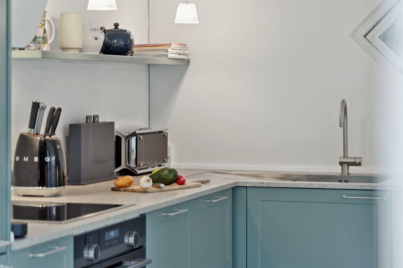 Die Küche ist mit Kühlschrank ausgestattet. Außerdem gibt es 4 Keramik-Kochfelder, Umluftofen sowie Geschirrspüler.