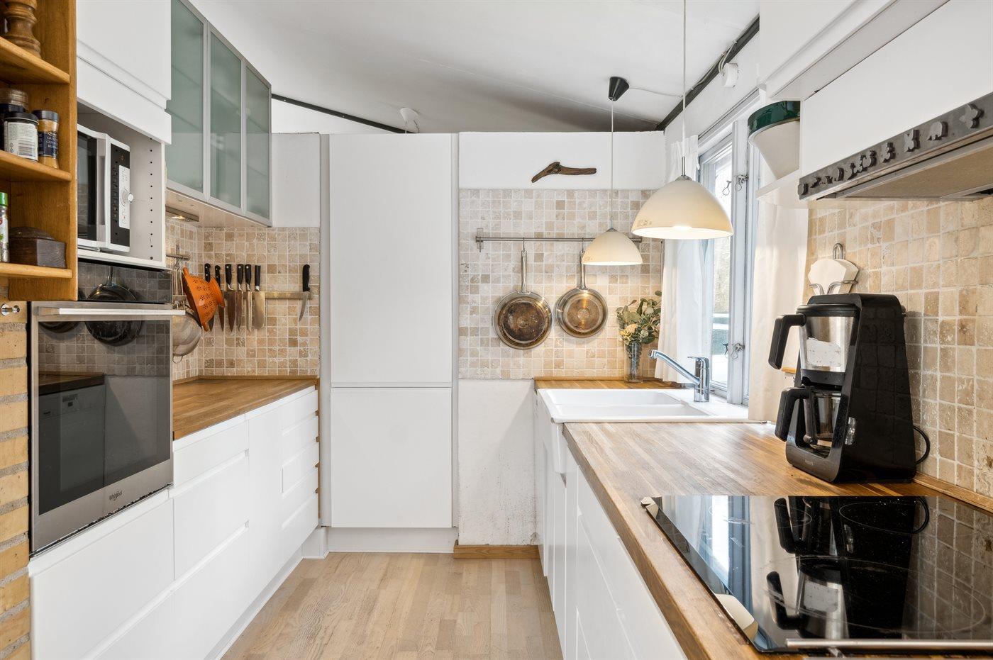 Die Küche ist mit Kühlschrank ausgestattet. Außerdem gibt es 4 Induktions-Kochzonen, Umluftofen, Mikrowelle sowie Geschirrspüler.