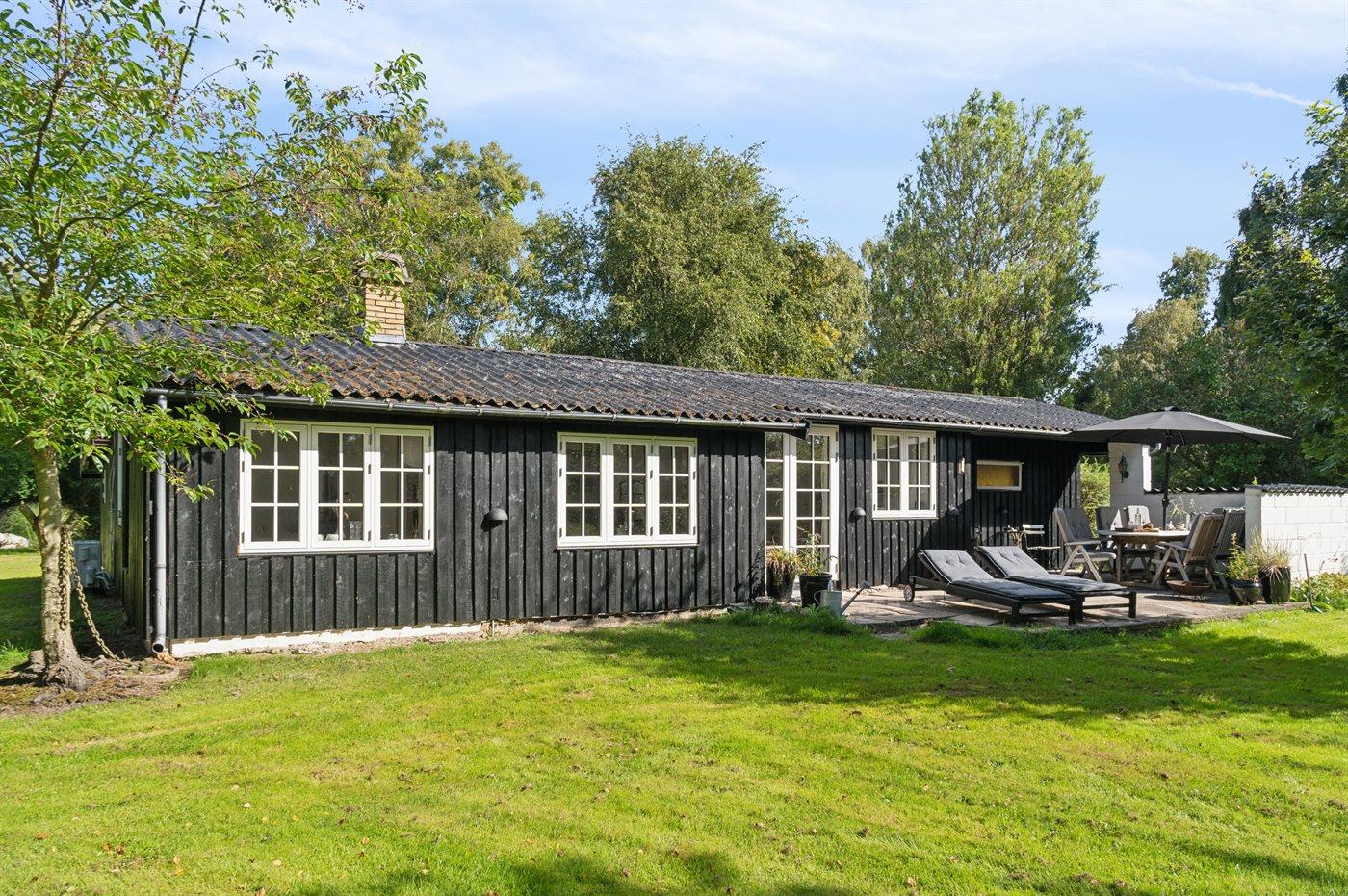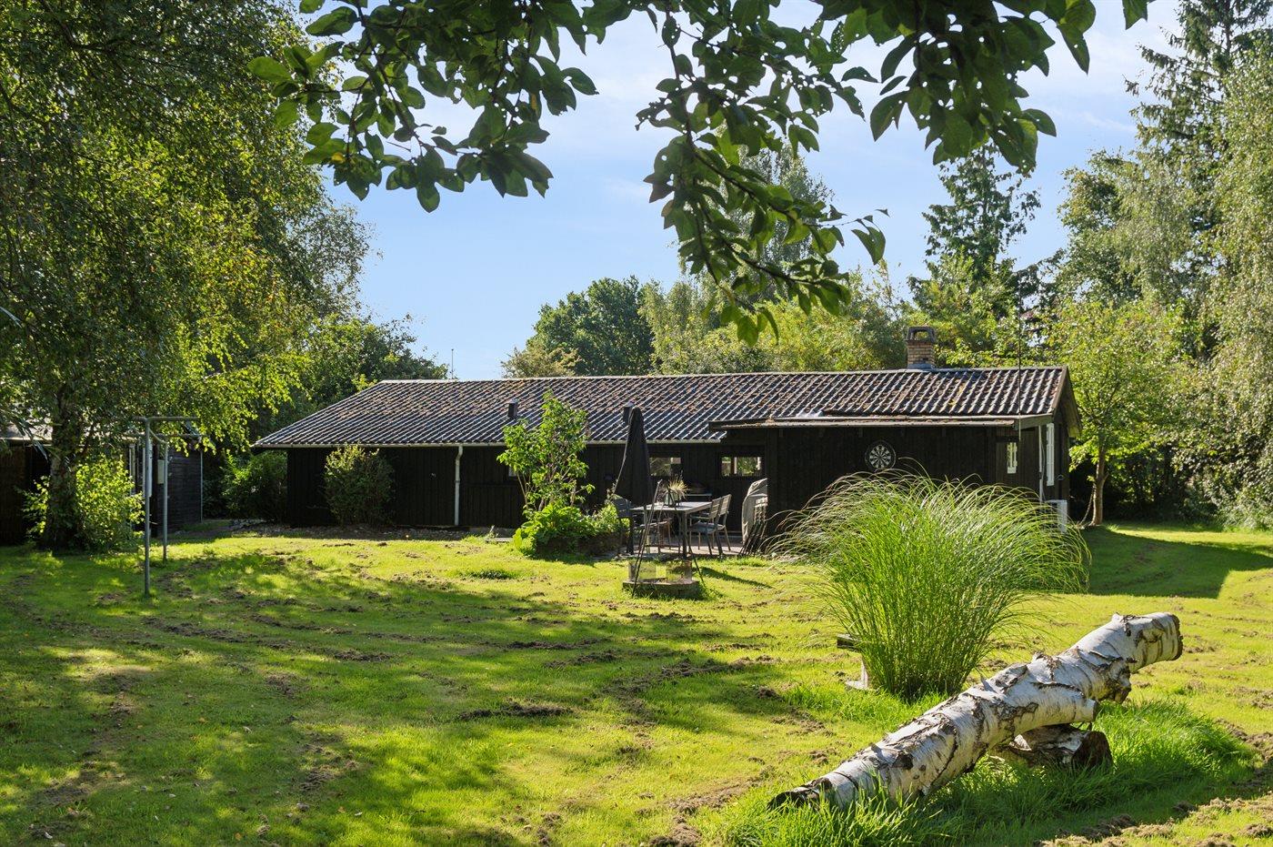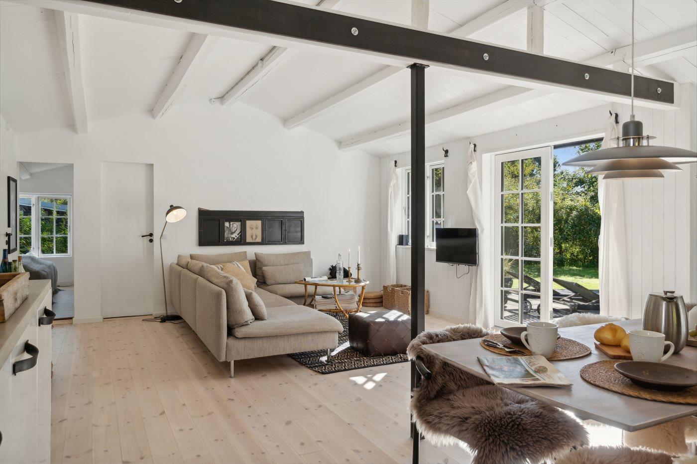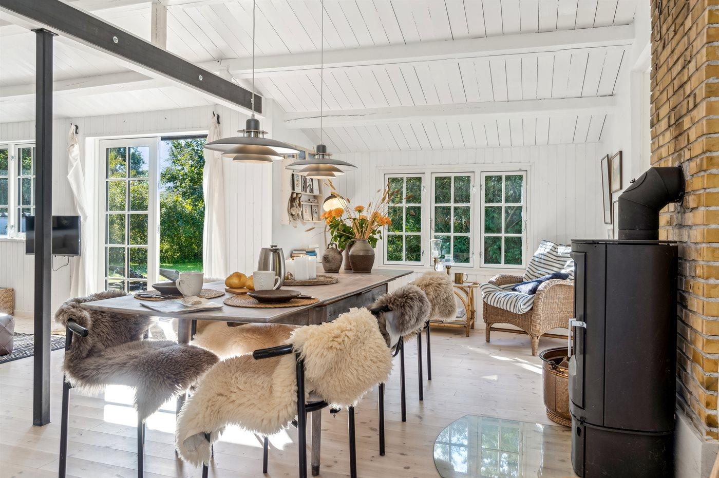 Der moderne Küchenbereich ist offen mit dem Wohnzimmer verbunden und hat einen Ausgang zur nach Süden ausgerichteten Terrasse, was gute Möglichkeiten bietet, zusammenzusein und es sich gemütlich zu machen. Überall im Haus ist es hell und geschmackvoll eingerichtet, mit viel Liebe zum Detail. Es gibt 4 Schlafzimmer, jedes mit 2 Schlafplätzen, sowie ein schönes Badezimmer mit Dusche. Auf dem großen Grundstück gibt es reichlich Gelegenheit zum Spielen, für Ballspiele, zum Entspannen am Lagerfeuerplatz und auf den guten Terrassen auf beiden Seiten des Hauses, von denen ein Teil auch überdacht ist, um den Sommer und das gute Wetter zu genießen. Es gibt auch einen guten Wintergarten, der die Abende im Freien verlängert und an Tagen, an denen es windig und kühl ist, ein großer Vorteil ist. Es gibt auch eine Außendusche.