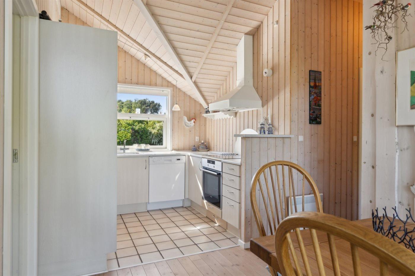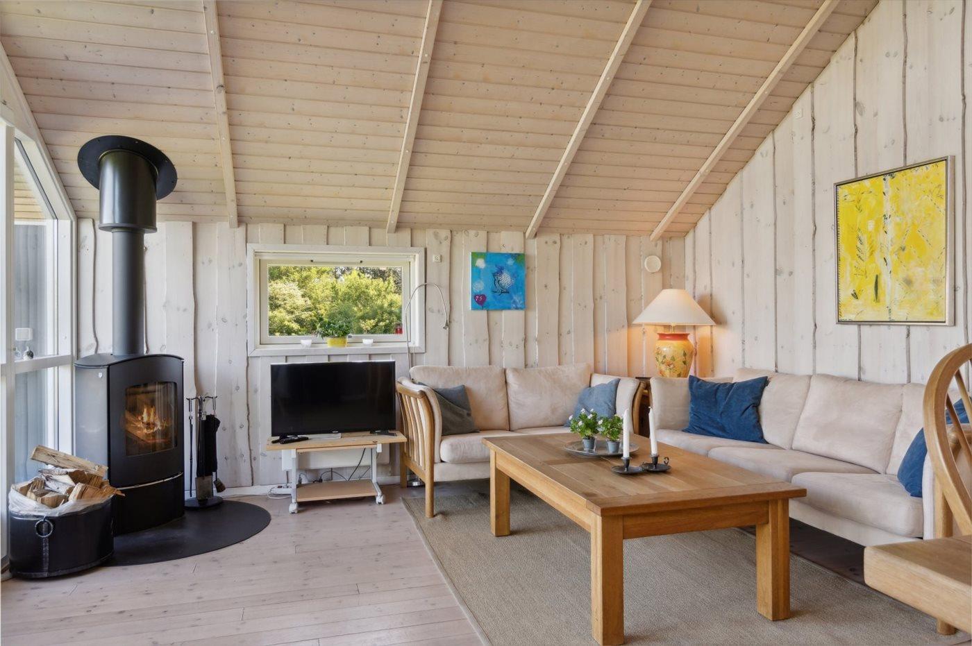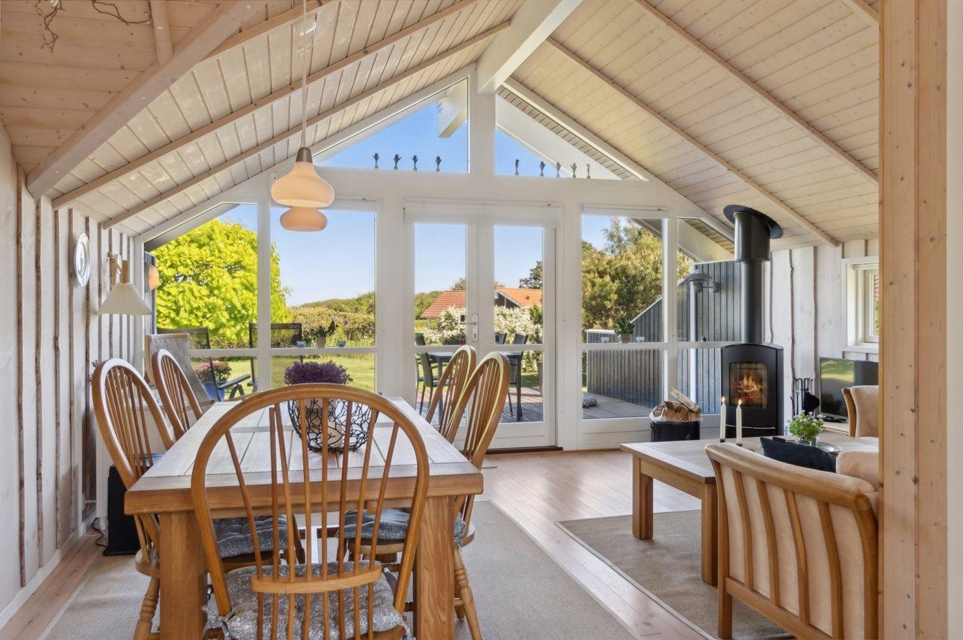 Das Haus ist hell und geräumig mit Decken bis zum First in allen Räumen und gutem Lichteinfall durch die großen Fenster im Wohnzimmer. Das Wohnzimmer und die Küche sind kombiniert und von hier aus gibt es direkten Zugang zur nach Norden ausgerichteten Terrasse, die teilweise überdacht ist. Hier kannst du die Aussicht und die Sonne genießen und der überdachte Teil bietet Schatten und Schutz vor dem Wind. Darüber hinaus gibt es eine nach Süden ausgerichtete Terrasse.