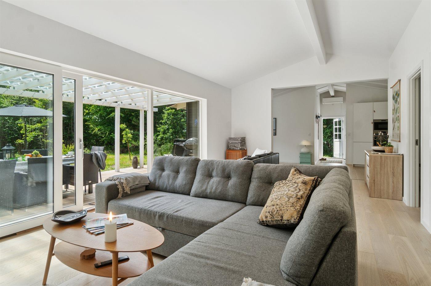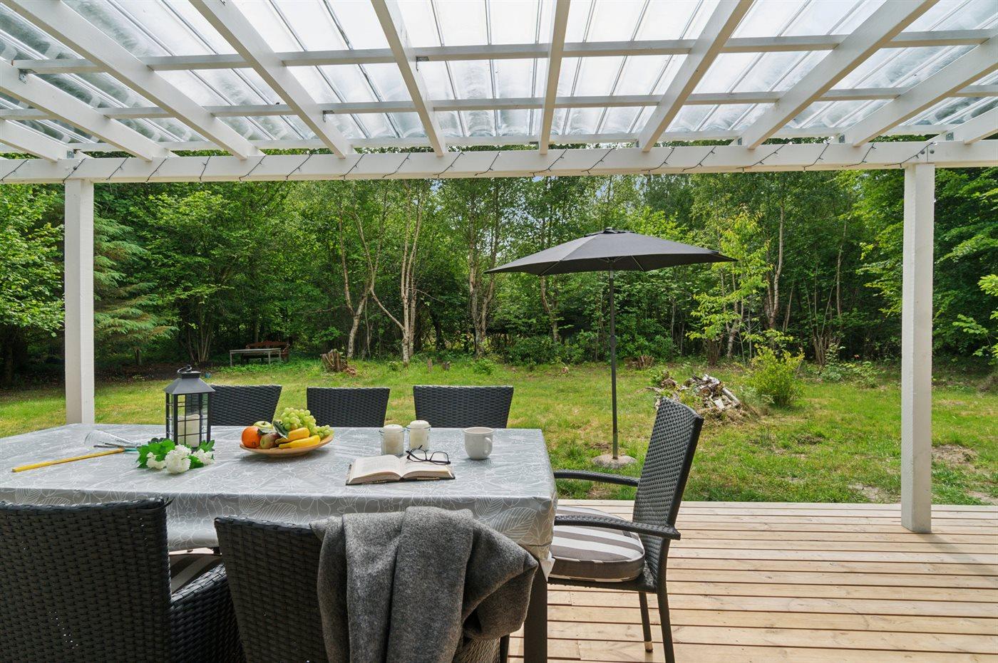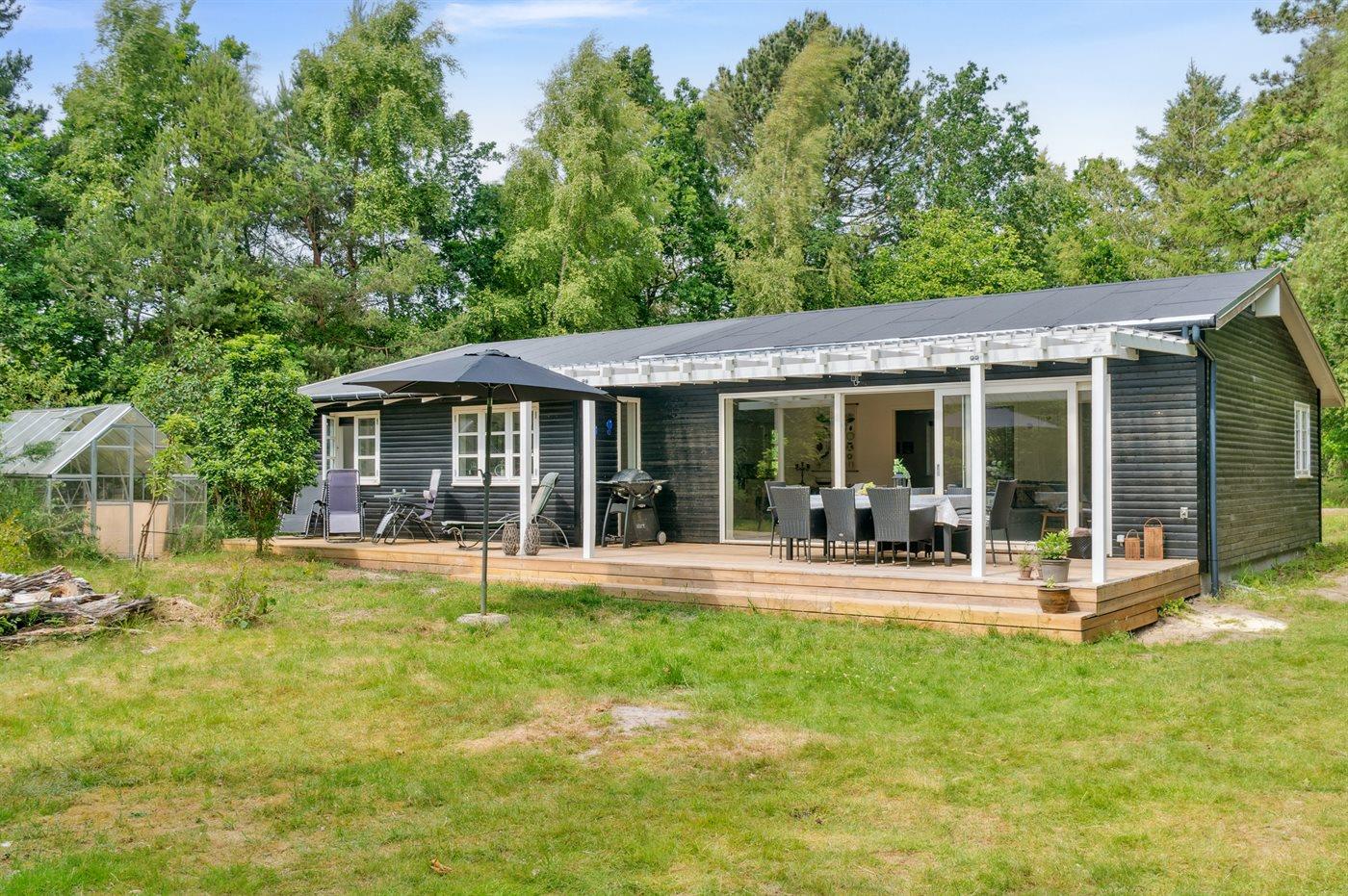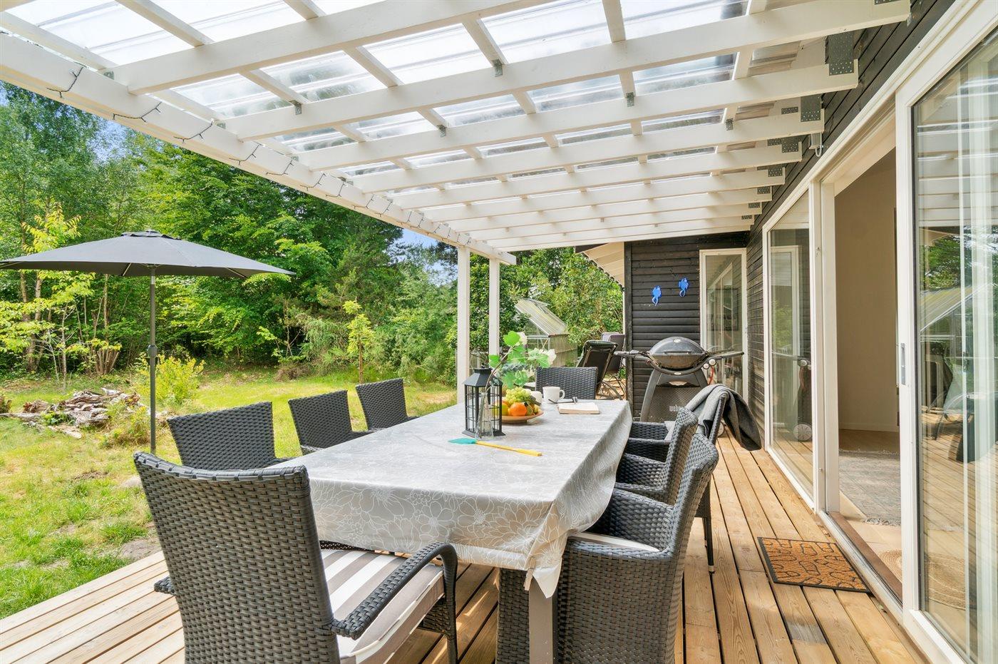 Modernes Ferienhaus nahe kinderfreundlichem Sandstrand in Nykøbing Sj, umgeben von Natur mit großem Garten und überdachter Terrasse.