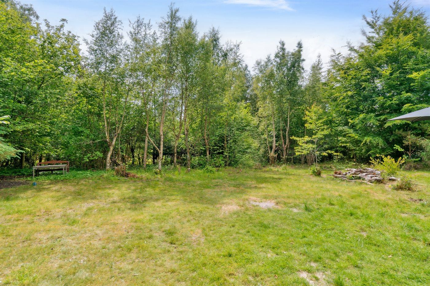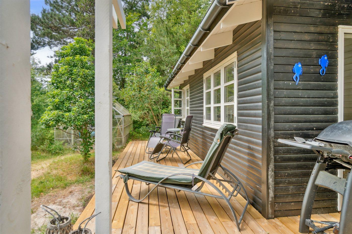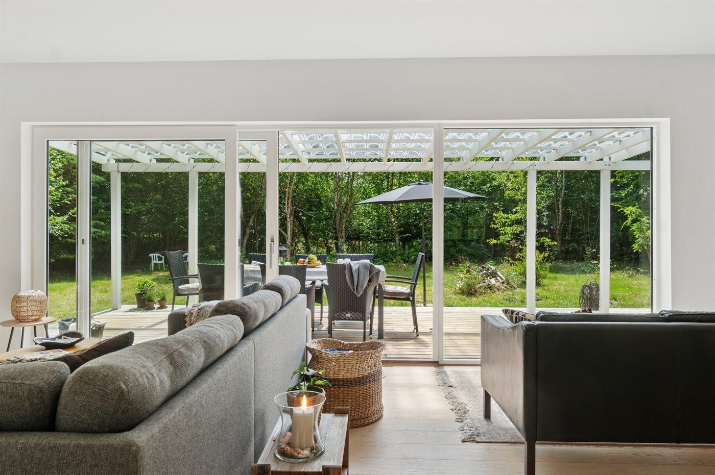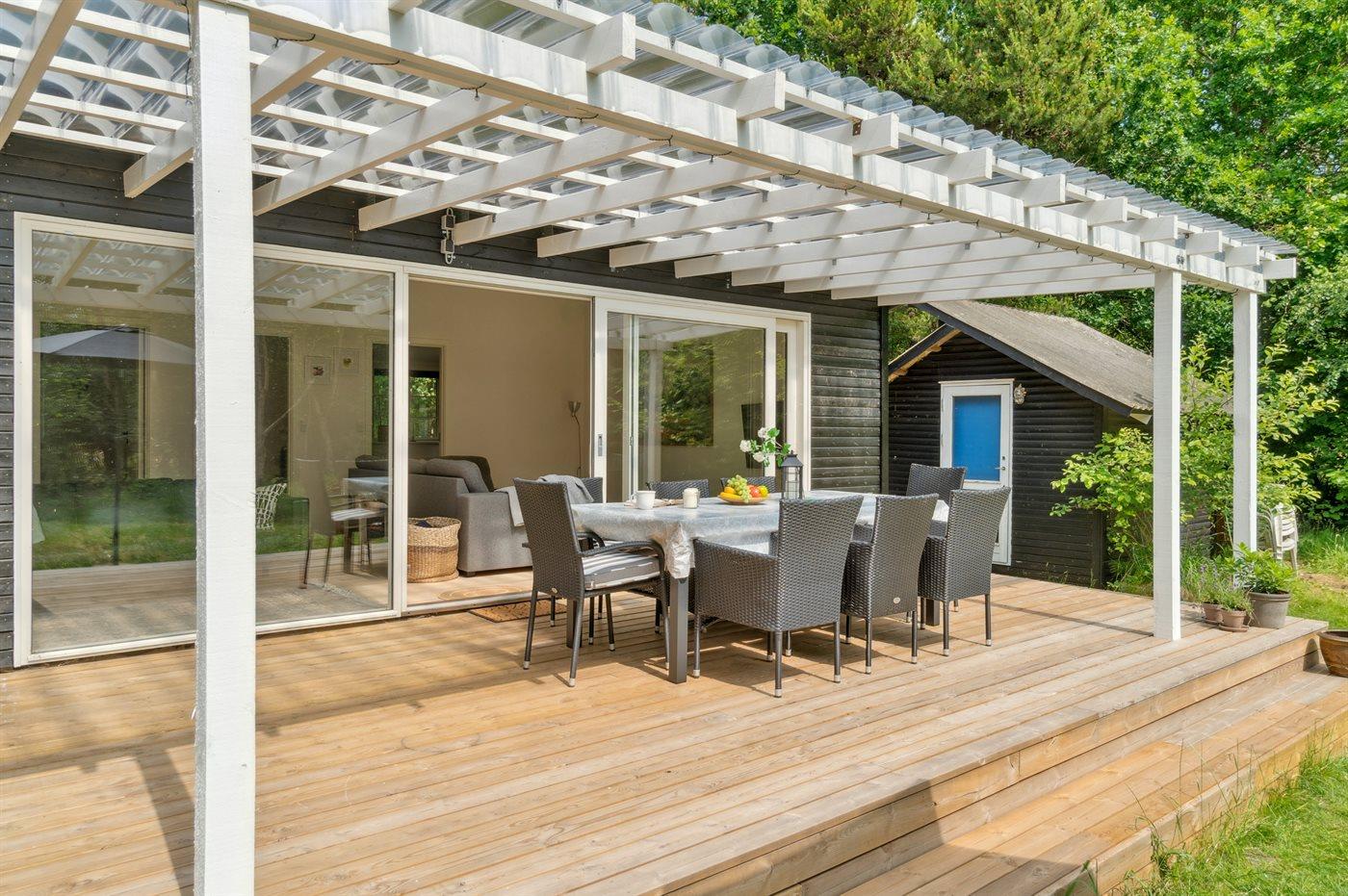 Modernes Ferienhaus nahe kinderfreundlichem Sandstrand in Nykøbing Sj, umgeben von Natur mit großem Garten und überdachter Terrasse.