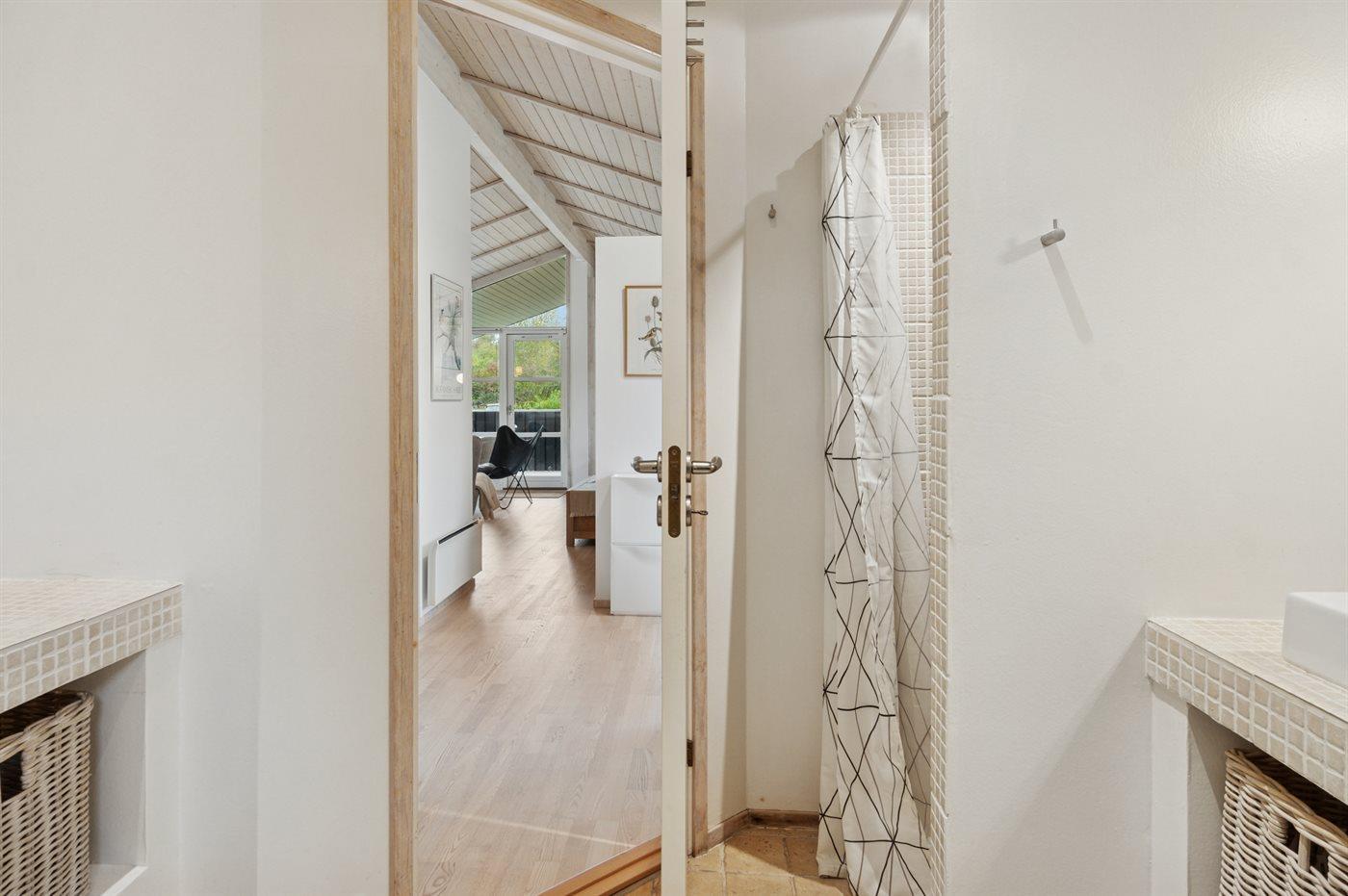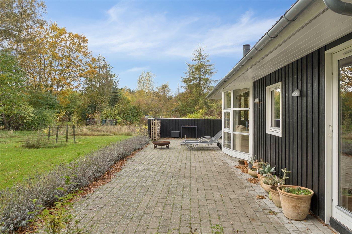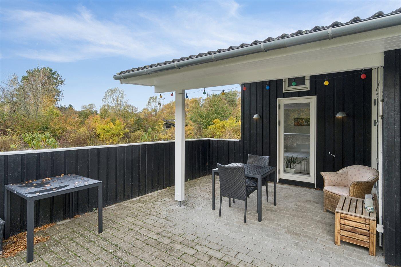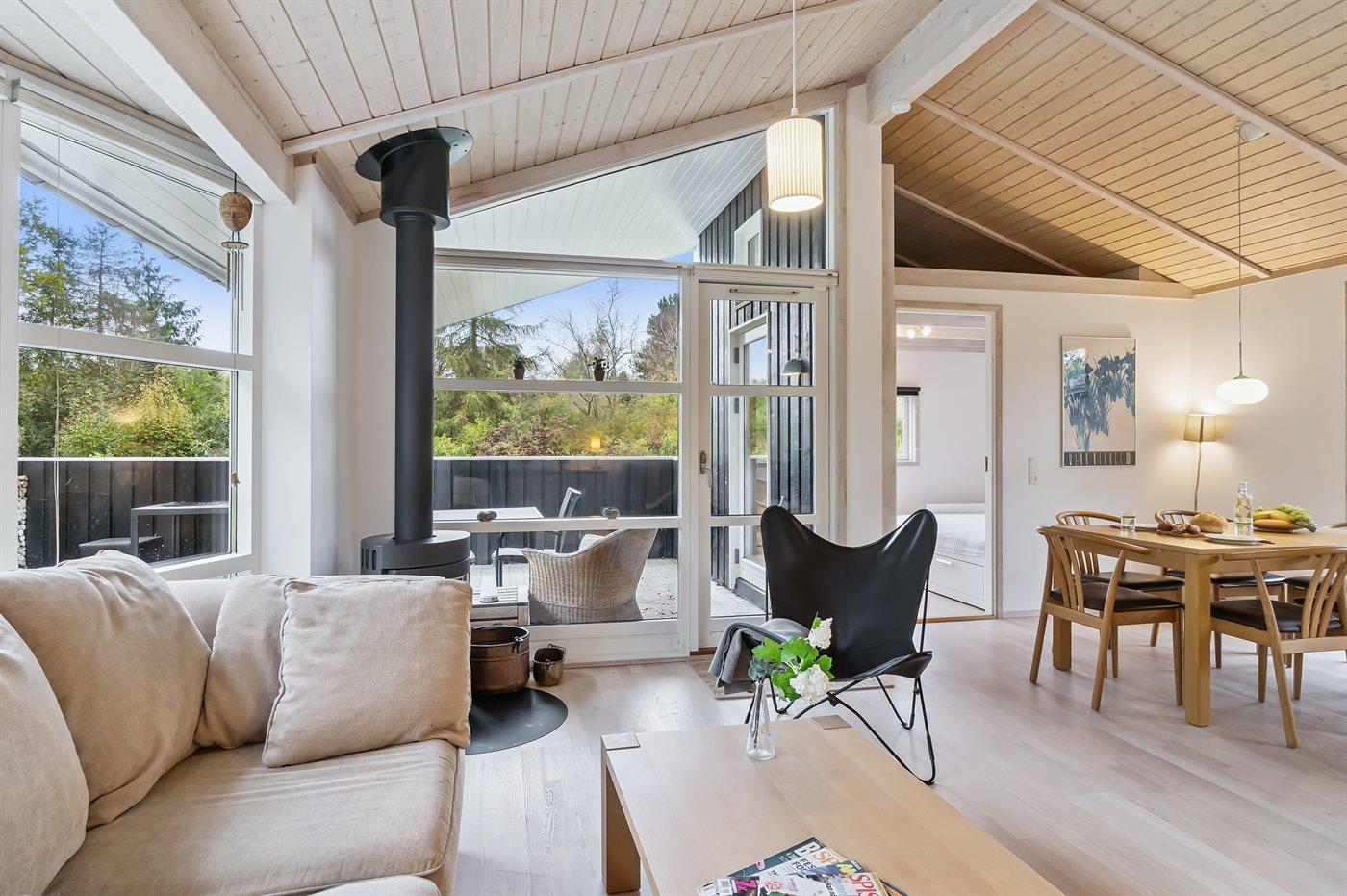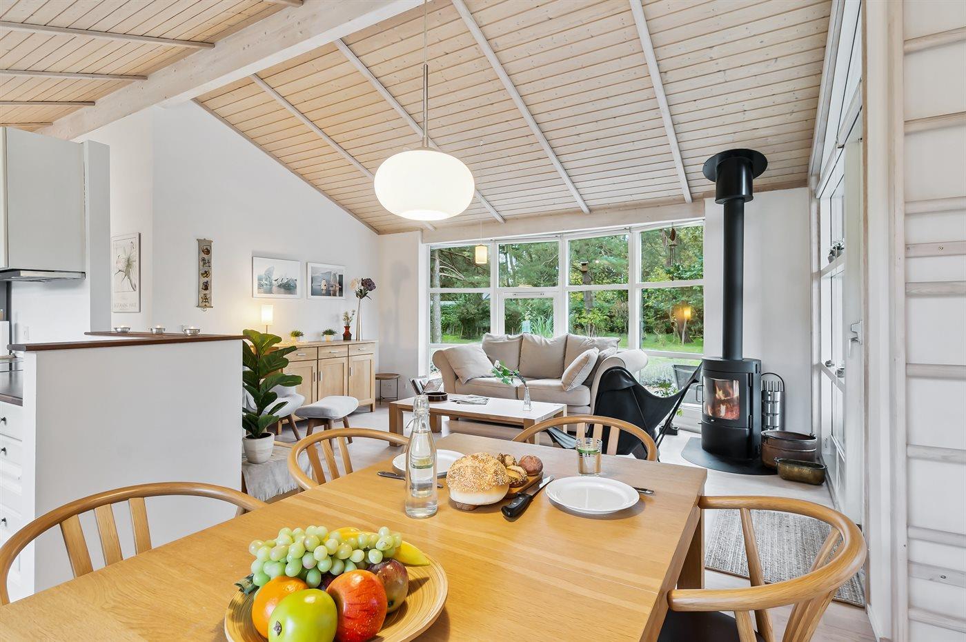 Küche, Essbereich und Wohnzimmer sind offen miteinander verbunden und bilden zusammen mit der großen, nach Süden ausgerichteten Terrasse die natürlichen Treffpunkte für das gemütliche Beisammensein mit Familie und Freunden. Ein Teil der Terrasse ist überdacht, sodass du dich im Schatten aufhalten und die langen, hellen Sommerabende genießen kannst. Im gesamten Haus sorgen Decken bis zum First und guter Lichteinfall für eine einladende Atmosphäre.