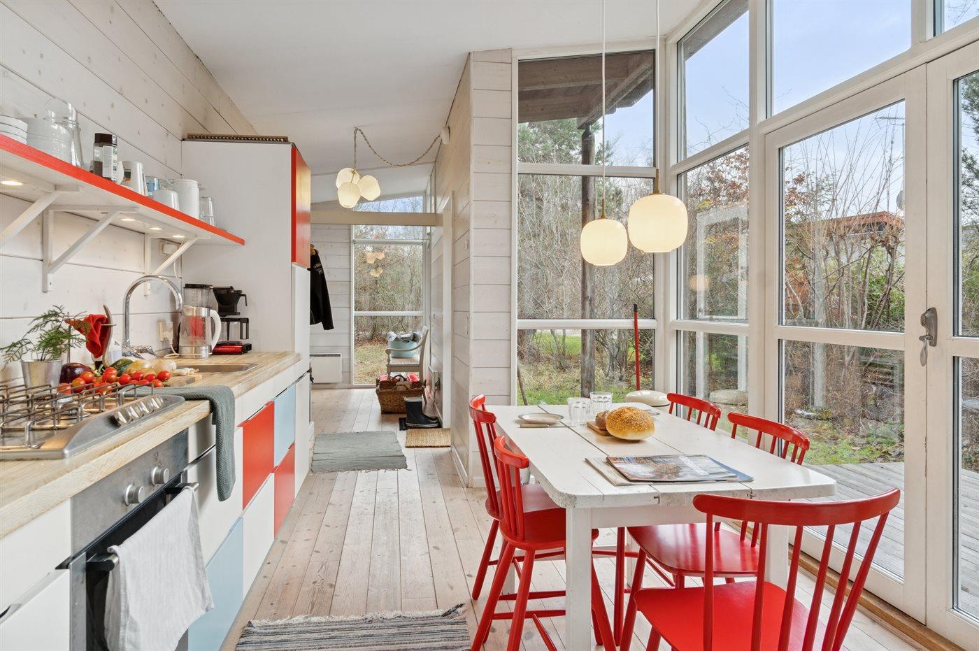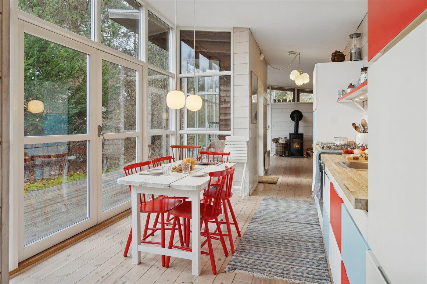 Das Haus besticht durch moderne Architektur, hohe Decken in mehreren Räumen und viel Tageslicht durch große Fensterfronten sowie Dachfenster, sodass es überall hell und angenehm zum Verweilen ist. Vom Küchenbereich gelangst du direkt auf die Terrasse, ebenso vom Wohn- und Essbereich, der ebenfalls Zugang zum Garten und zur Terrasse bietet. Ein großer Teil der Terrasse ist überdacht, sodass du Schatten und Schutz findest und die langen, hellen Sommerabende genießen kannst.
