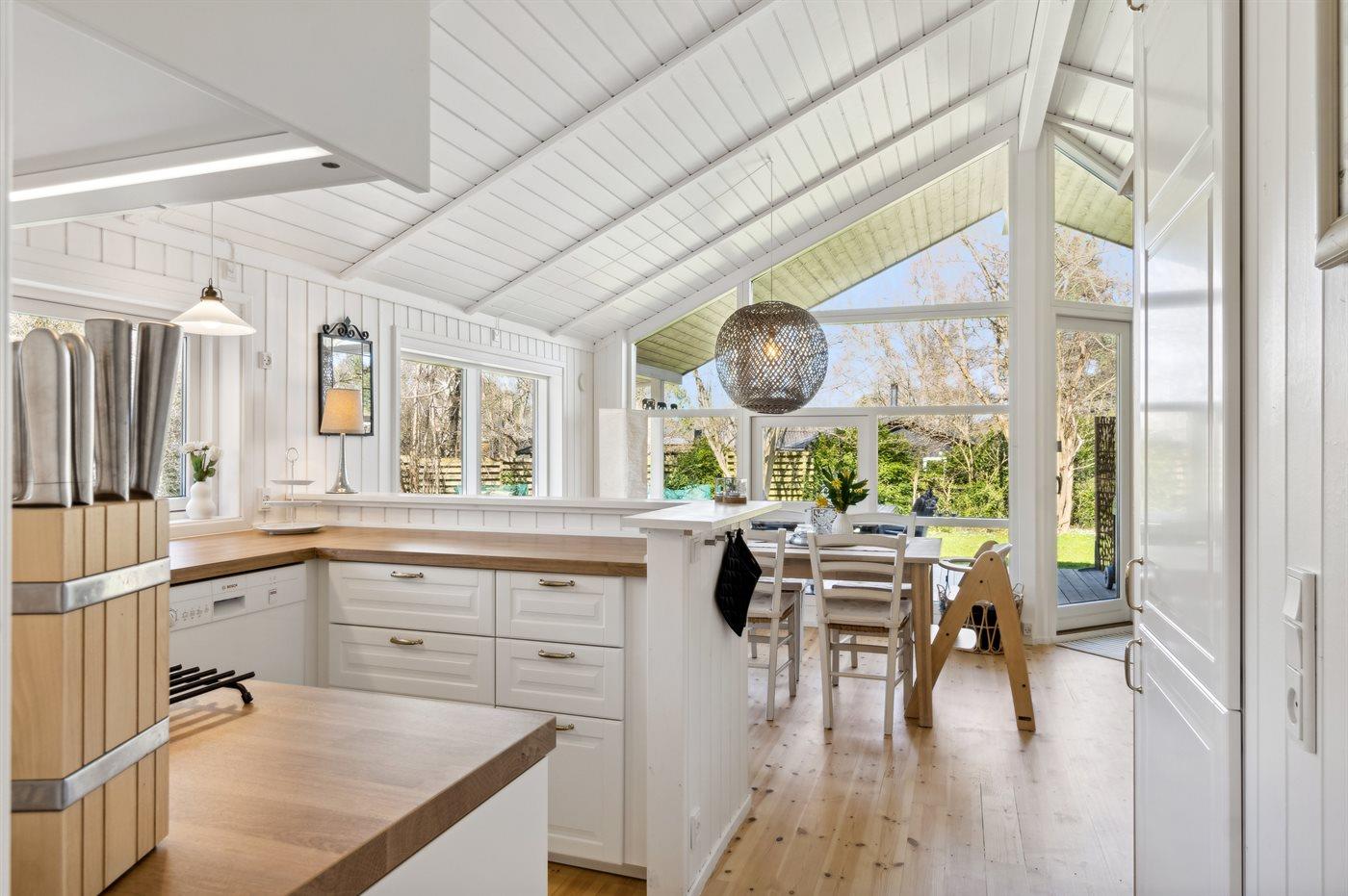 Der natürliche Mittelpunkt des Hauses ist der gemütliche offene Küchen- und Essbereich, der mit dem Wohnzimmer verbunden ist – von wo aus man auf die Terrasse gelangt. Für gemütliche Stunden gibt es einen Kaminofen, und das Haus wird auch energieeffizient mit einer Luft-Luft-Wärmepumpe beheizt.