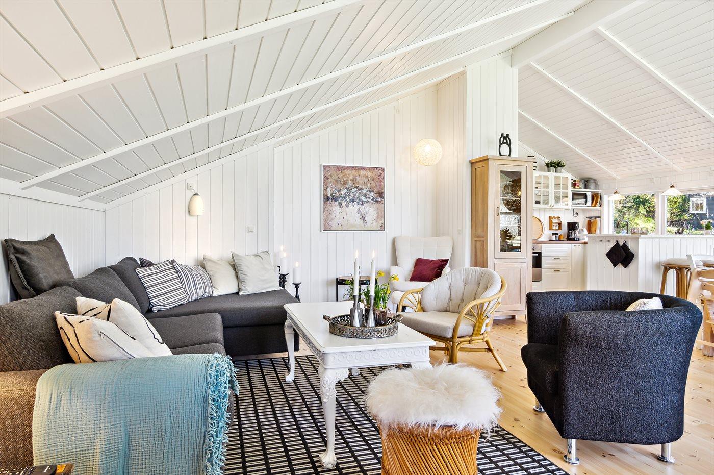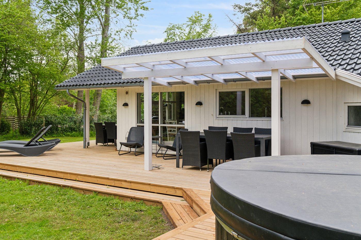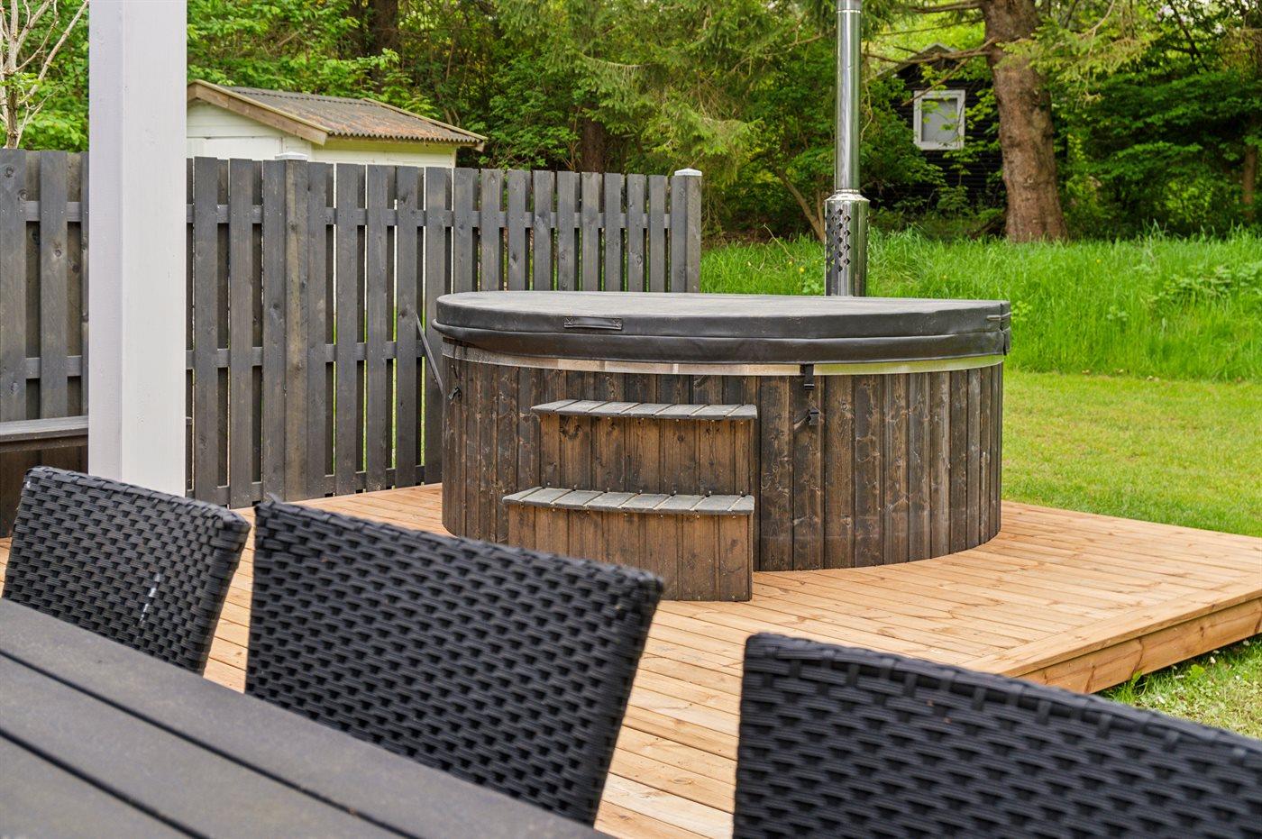 Dieses schöne Ferienhaus tritt hell und luftig hervor mit Decken bis zum First in allen Zimmern. Hier findet man alles, was man für einen entspannten Urlaub benötigt wie z. B. Sauna und eine große, schöne Terrassenfläche mit Hot-Tub. Das Haus liegt in einem ruhigen Ferienhausgebiet in der Nähe der Natur und nur 425 m von einem Strand entfernt, wo es einen Badesteg gibt.